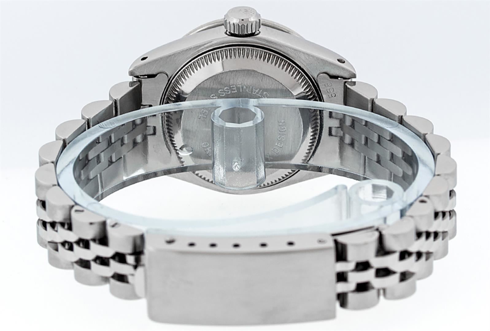 One Ladies Stainless Steel Rolex Datejust Polished Bright with Satin Finish, Serviced & Electronically Tested, Stainless Steel Case: 26mm, Stainless Steel Crown, Diamond Lugs: 24 Diamonds On Lugs, Clarity: SI-VS, Color: G to H. Custom Bezel: New Stainless Steel Beadset Bezel, Diamond Count: 39 Diamonds, Total Weight .70 Carat, Clarity: SI-VS, Color: G to H. Custom Crystal: New Scratch Resistant Synthetic Sapphire Cyclops Lens. Custom Hands: New Luminescent Hands. Movement: Automatic Winding Movement . Custom Dial: Mother Of Pearl Diamond Dial, 10 Diamonds in Dial G To H In Color, Clarity: VS. Date Window: 3 O'Clock Position Date Display, Model: Datejust Condition: G-6 Extra Fine. Bracelet: Stainless Steel Jubilee Band. Bright Polish & Satin Finish. 6.0 Inch Length, Adjustable. Standard Clasp, With Rolex Logo. This Watch Has Been Serviced Time Tested And Is In Excellent Condition It Is Free Of All Scratches And Dents.
