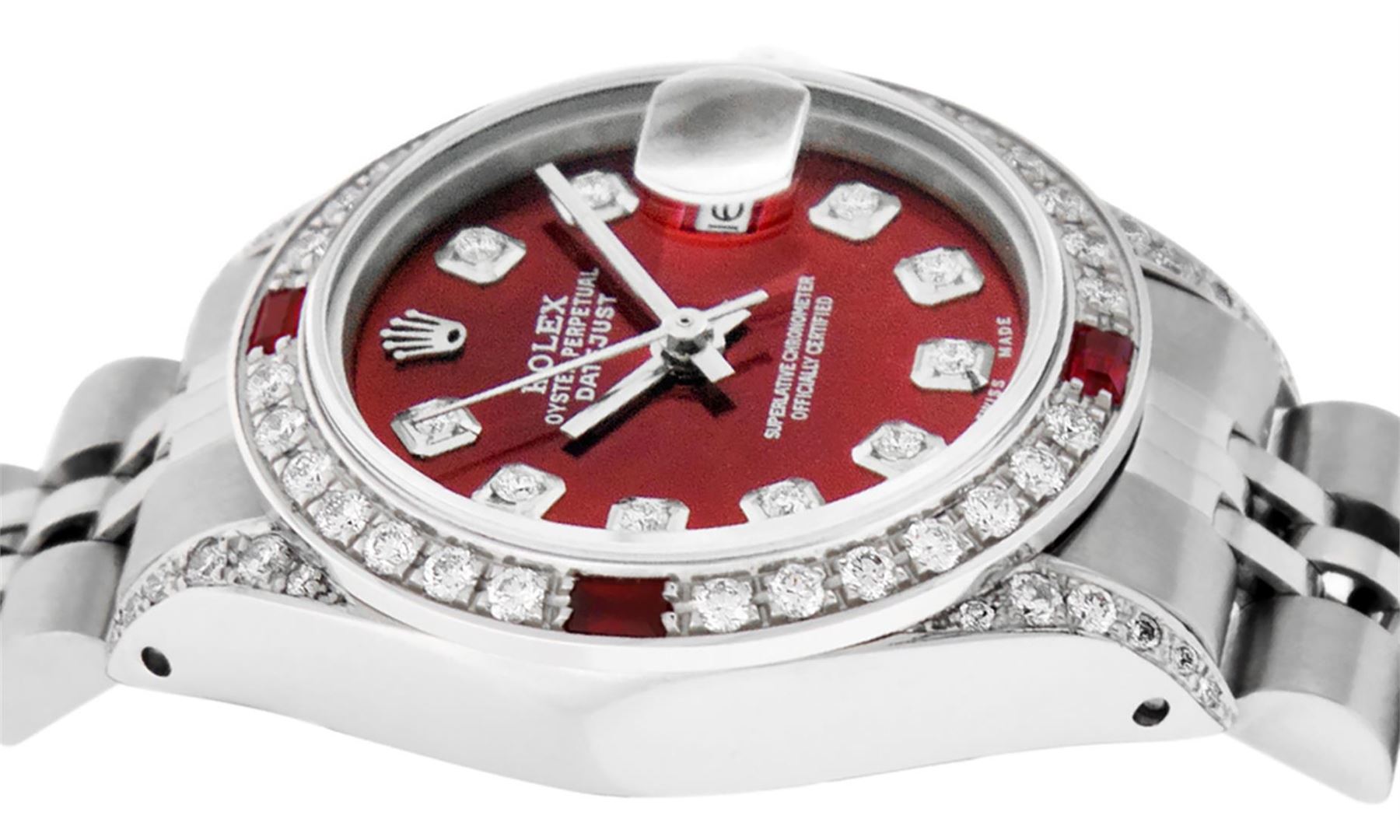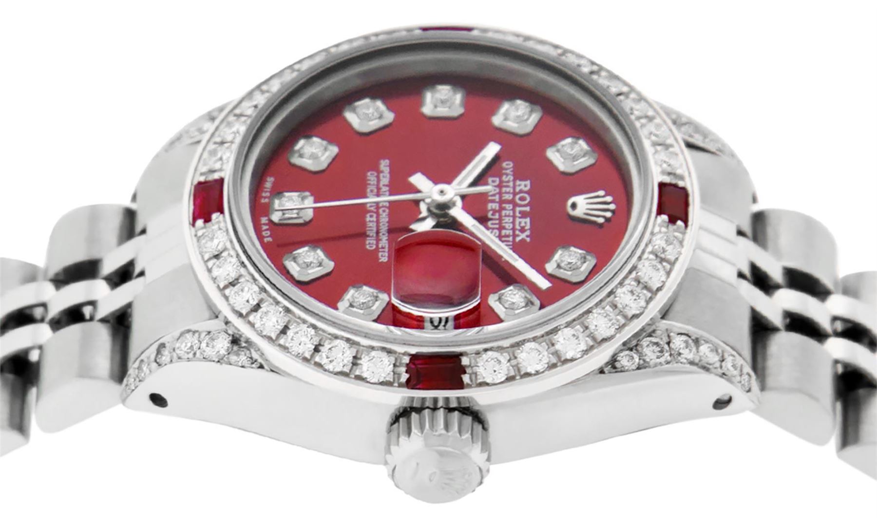 One Ladies Stainless Steel Rolex Datejust Polished Bright with Satin Finish, Serviced & Electronically Tested, Stainless Steel Case: 26mm, Stainless Steel Crown, Diamond Lugs: 24 Diamonds On Lugs, Clarity: SI-VS, Color: G to H. Custom Bezel: New 18K White Gold Diamond & Ruby Beadset Bezel, Diamond Count: 28 Diamonds + 4 Rubies, Total Weight .70 Carat, Clarity: SI-VS, Color: G to H. Custom Crystal: New Scratch Resistant Synthetic Sapphire Cyclops Lens. Custom Hands: New Luminescent Hands. Movement: Automatic Winding Movement. Custom Dial: Refinished Red Diamond Dial, Diamond Count: 10 Diamonds in Dial, G To H In Color, Clarity: SI-VS. Date Window: 3 O'Clock Position Date Display, Model: Datejust Condition: G-6 Extra Fine. Bracelet: Stainless Steel Jubilee. Bright Polish & Satin Finish. 6.0 Inch Length, Adjustable. Standard Clasp, With Rolex Logo. This Watch Has Been Serviced Time Tested And Is In Excellent Condition It Is Free Of All Scratches And Dents.