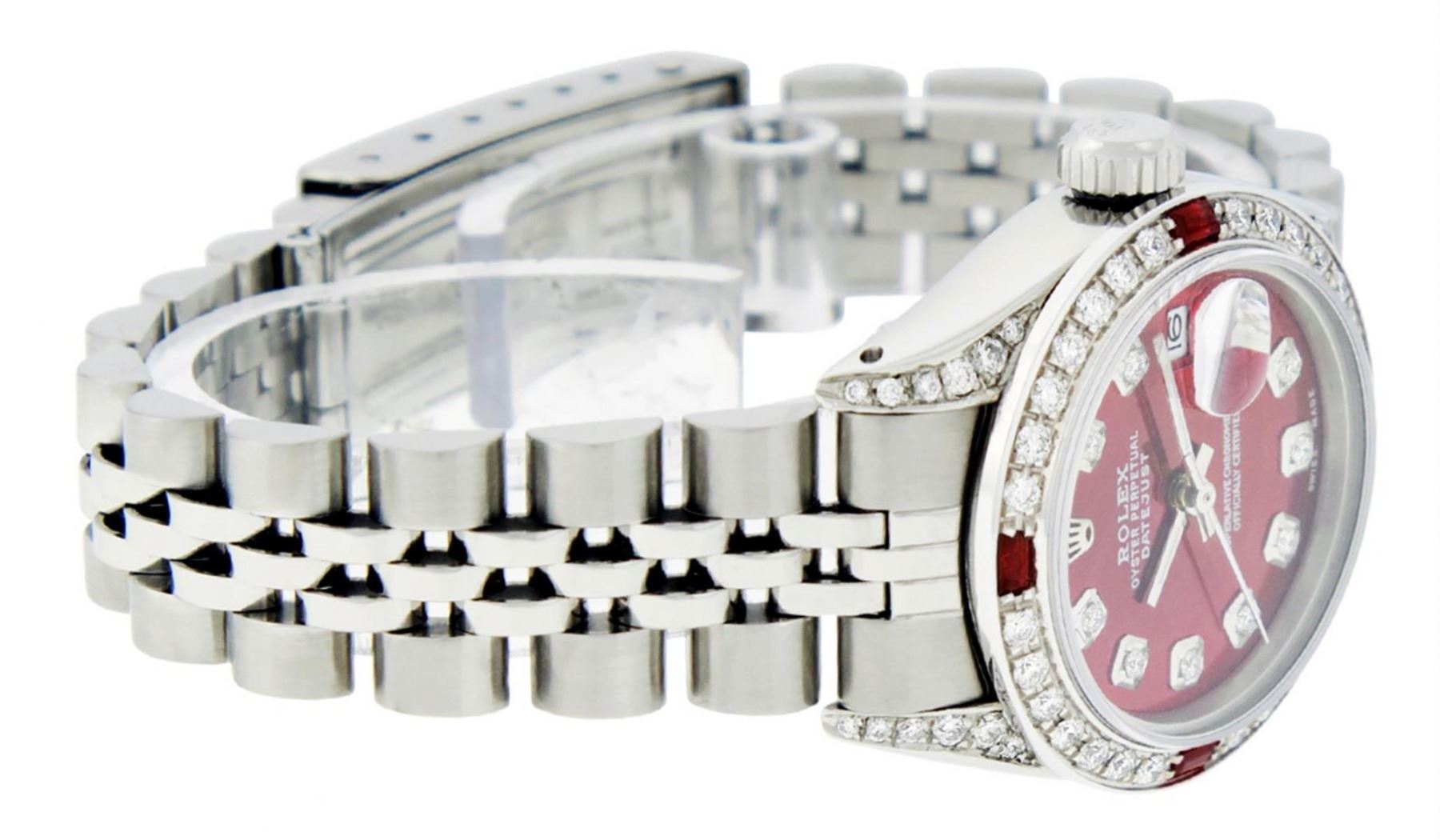 One Ladies Stainless Steel Rolex Datejust Polished Bright with Satin Finish, Serviced & Electronically Tested, Stainless Steel Case: 26mm, Stainless Steel Crown, Diamond Lugs: 24 Diamonds On Lugs, Clarity: SI-VS, Color: G to H. Custom Bezel: New 18K White Gold Diamond & Ruby Beadset Bezel, Diamond Count: 28 Diamonds + 4 Rubies, Total Weight .70 Carat, Clarity: SI-VS, Color: G to H. Custom Crystal: New Synthetic Sapphire Cyclops Lens. Custom Hands: New Luminescent Hands. Movement: Automatic Winding Movement Caliber 2030. Custom Dial: Refinished Red Diamond Dial, Diamond Count: 10 Diamonds in Dial, G To H In Color, Clarity: SI-VS. Date Window: 3 O'Clock Position Date Display, Model: Datejust Condition: G-6 Extra Fine. Bracelet: Stainless Steel Jubilee. Bright Polish & Satin Finish. 6.0 Inch Length, Adjustable. Standard Clasp, With Rolex Logo. This Watch Has Been Serviced Time Tested And Is In Excellent Condition It Is Free Of All Scratches And Dents.