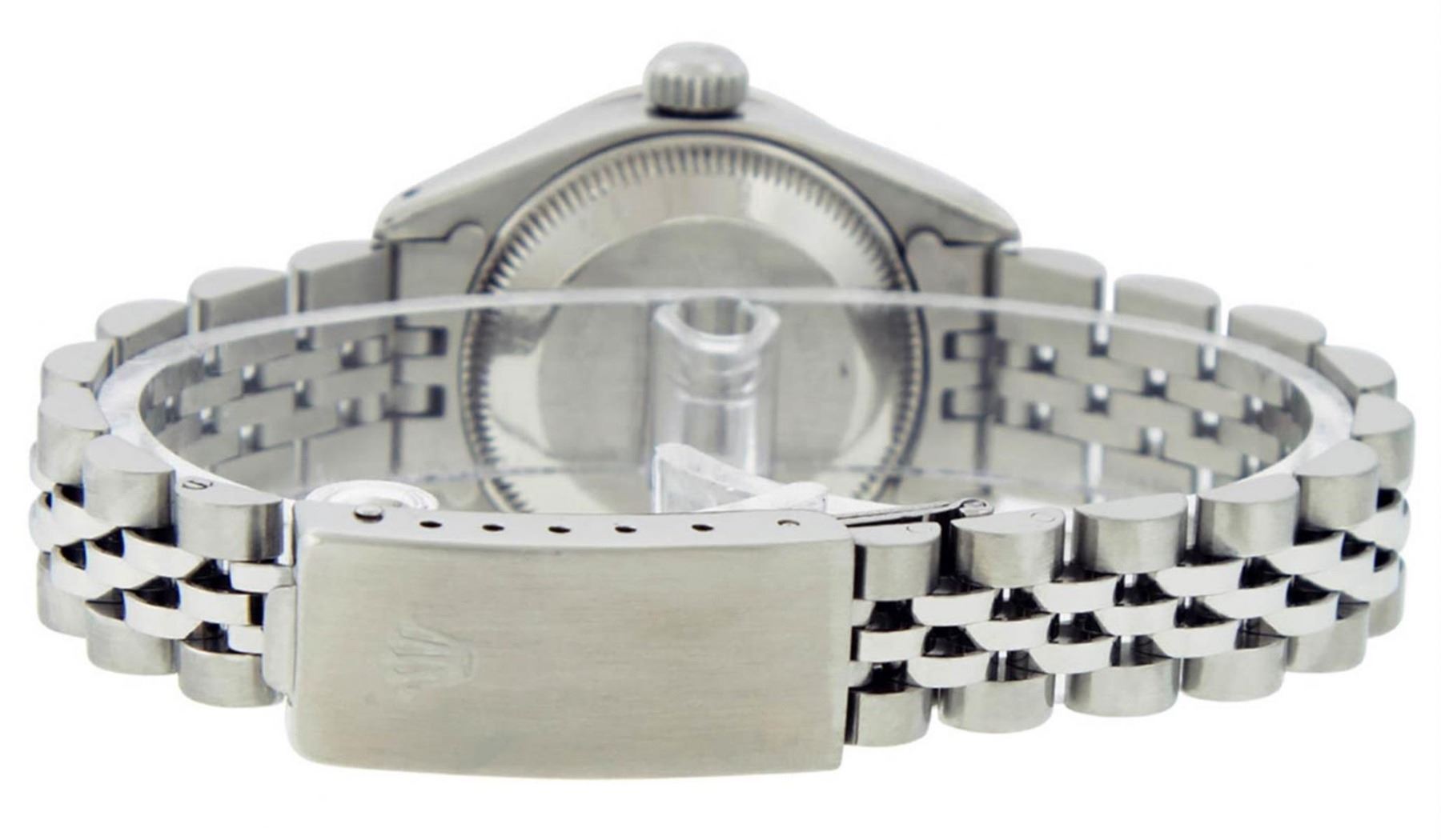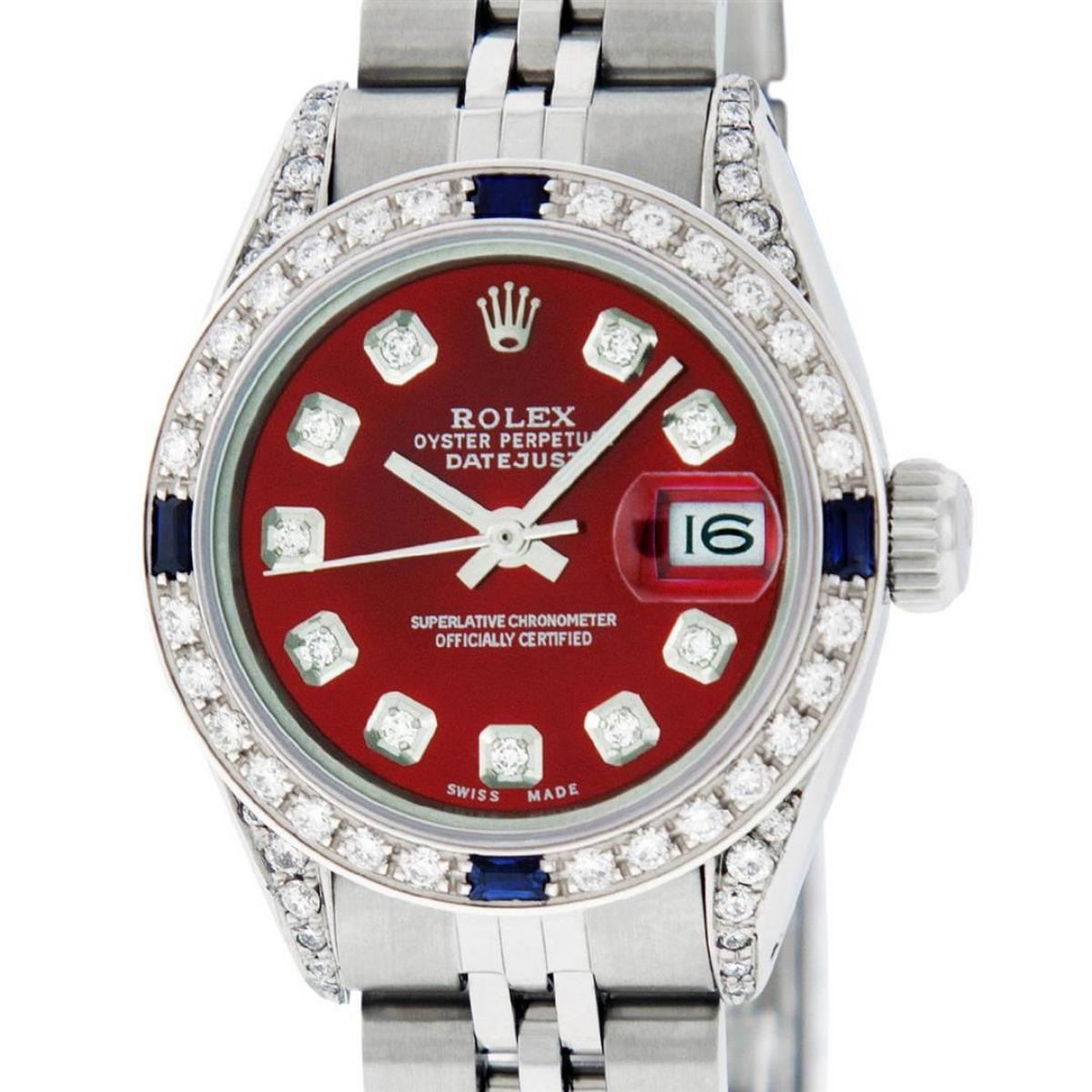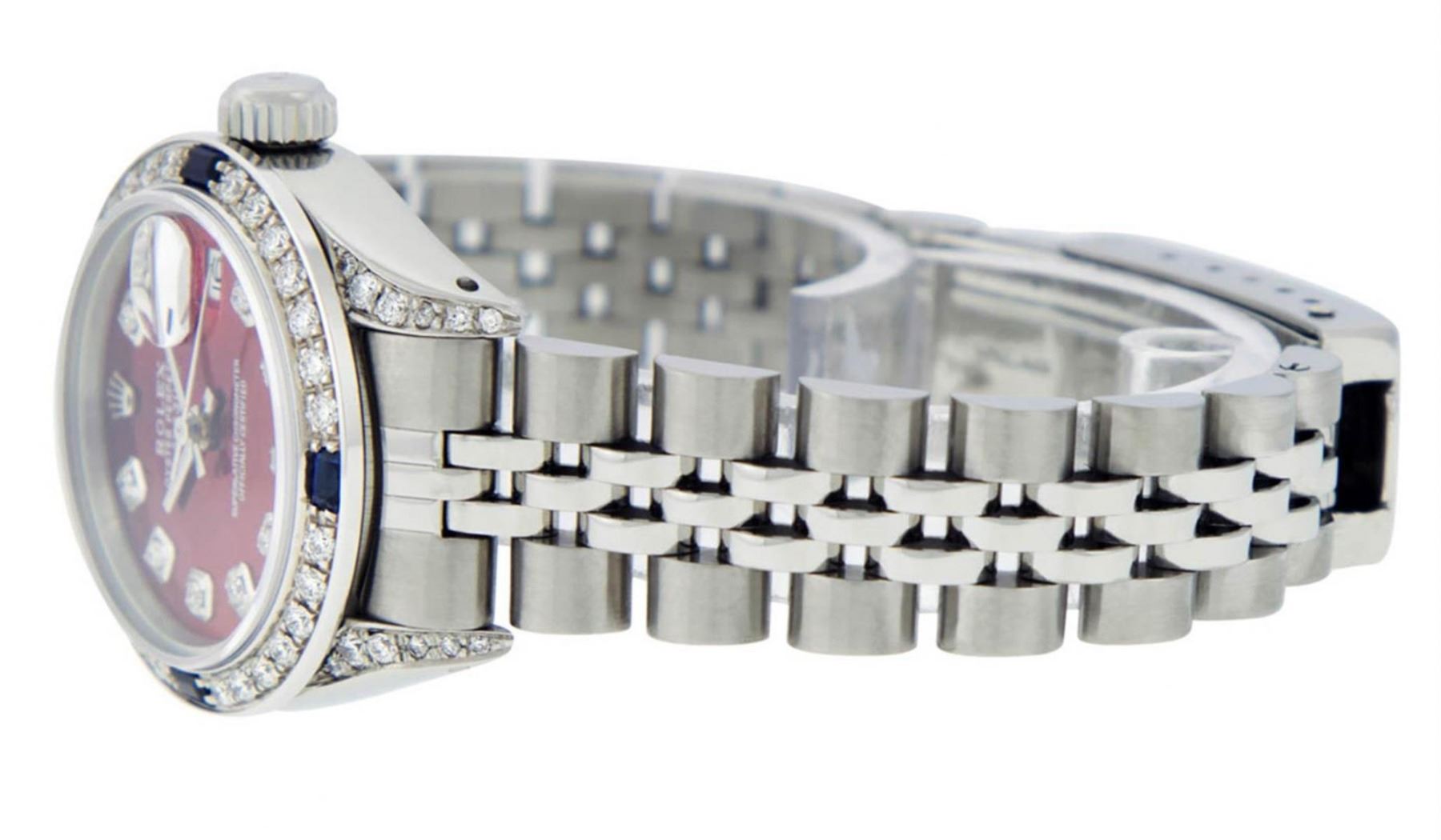 One Ladies Stainless Steel Rolex Datejust Polished Bright with Satin Finish, Serviced & Electronically Tested, Stainless Steel Case: 26mm, Stainless Steel Crown, Diamond Lugs: 24 Diamonds On Lugs, Clarity: SI-VS, Color: G to H. Custom Bezel: New 18K White Gold Diamond & Sapphire Beadset Bezel, Diamond Count: 28 Diamonds + 4 Sapphires, Total Weight .70 Carat, Clarity: SI-VS, Color: G to H. Custom Crystal: New Synthetic Sapphire Cyclops Lens. Custom Hands: New Luminescent Hands. Movement: Automatic Winding Movement Caliber 2030. Custom Dial: Refinished Red Diamond Dial, 10 Diamonds in Dial, G To H In Color, Clarity: SI-VS. Date Window: 3 O'Clock Position Date Display, Model: Datejust Condition: G-6 Extra Fine. Bracelet: Stainless Steel Jubilee. Bright Polish & Satin Finish. 6.0 Inch Length, Adjustable. Standard Clasp, With Rolex Logo. This Watch Has Been Serviced Time Tested And Is In Excellent Condition It Is Free Of All Scratches And Dents.