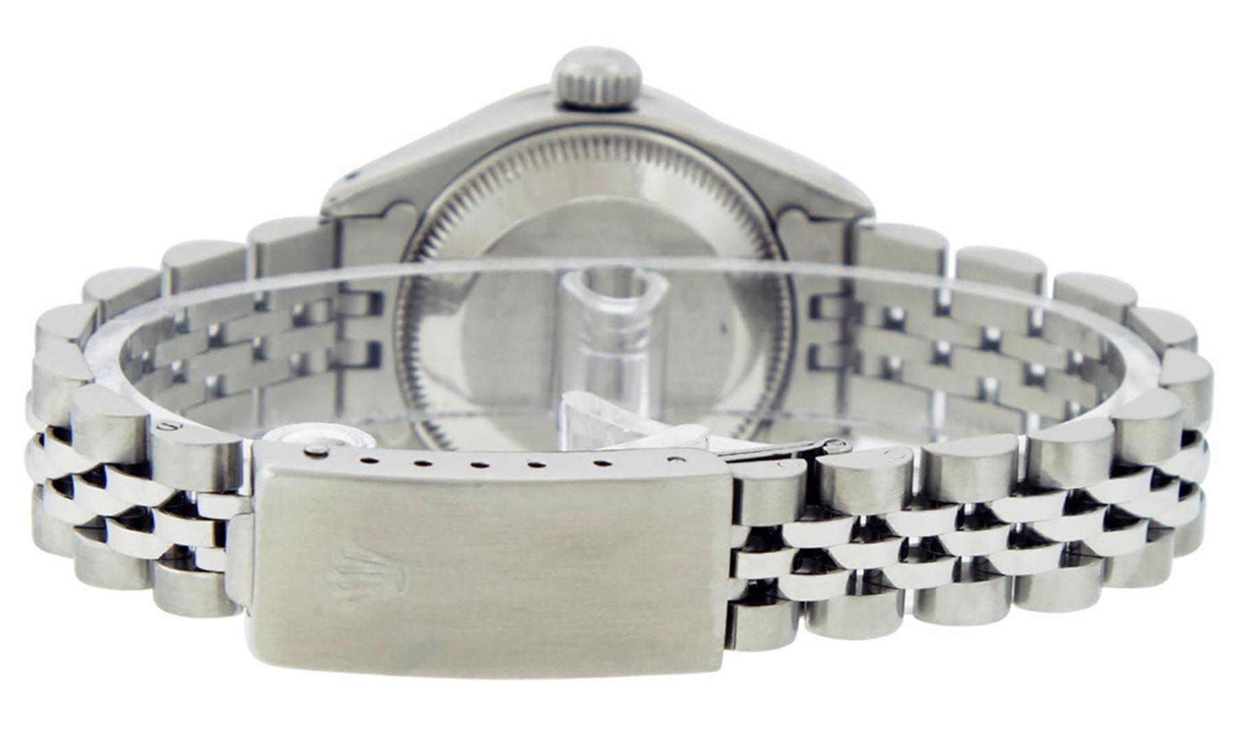 One Ladies Stainless Steel Rolex Datejust Polished Bright with Satin Finish, Serviced & Electronically Tested, Stainless Steel Case: 26mm, Stainless Steel Crown, Diamond Lugs: 24 Diamonds On Lugs, Clarity: SI-VS, Color: G to H. Custom Bezel: New 18K White Gold Diamond & Sapphire Beadset Bezel, Diamond Count: 28 Diamonds + 4 Sapphires, Total Weight .70 Carat, Clarity: SI-VS, Color: G to H. Custom Crystal: New Synthetic Sapphire Cyclops Lens. Custom Hands: New Luminescent Hands. Movement: Automatic Winding Movement. Custom Dial: Refinished Red Diamond Dial, 10 Diamonds in Dial, G To H In Color, Clarity: SI-VS. Date Window: 3 O'Clock Position Date Display, Model: Datejust Condition: G-6 Extra Fine. Bracelet: Stainless Steel Jubilee. Bright Polish & Satin Finish. 6.0 Inch Length, Adjustable. Standard Clasp, With Rolex Logo. This Watch Has Been Serviced Time Tested And Is In Excellent Condition It Is Free Of All Scratches And Dents.