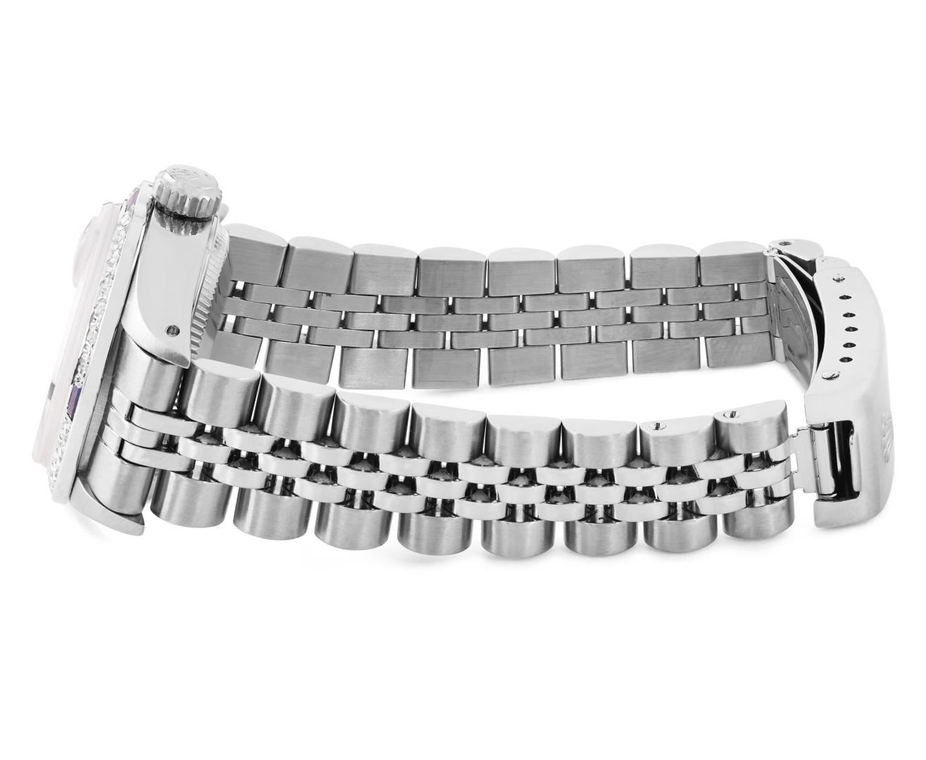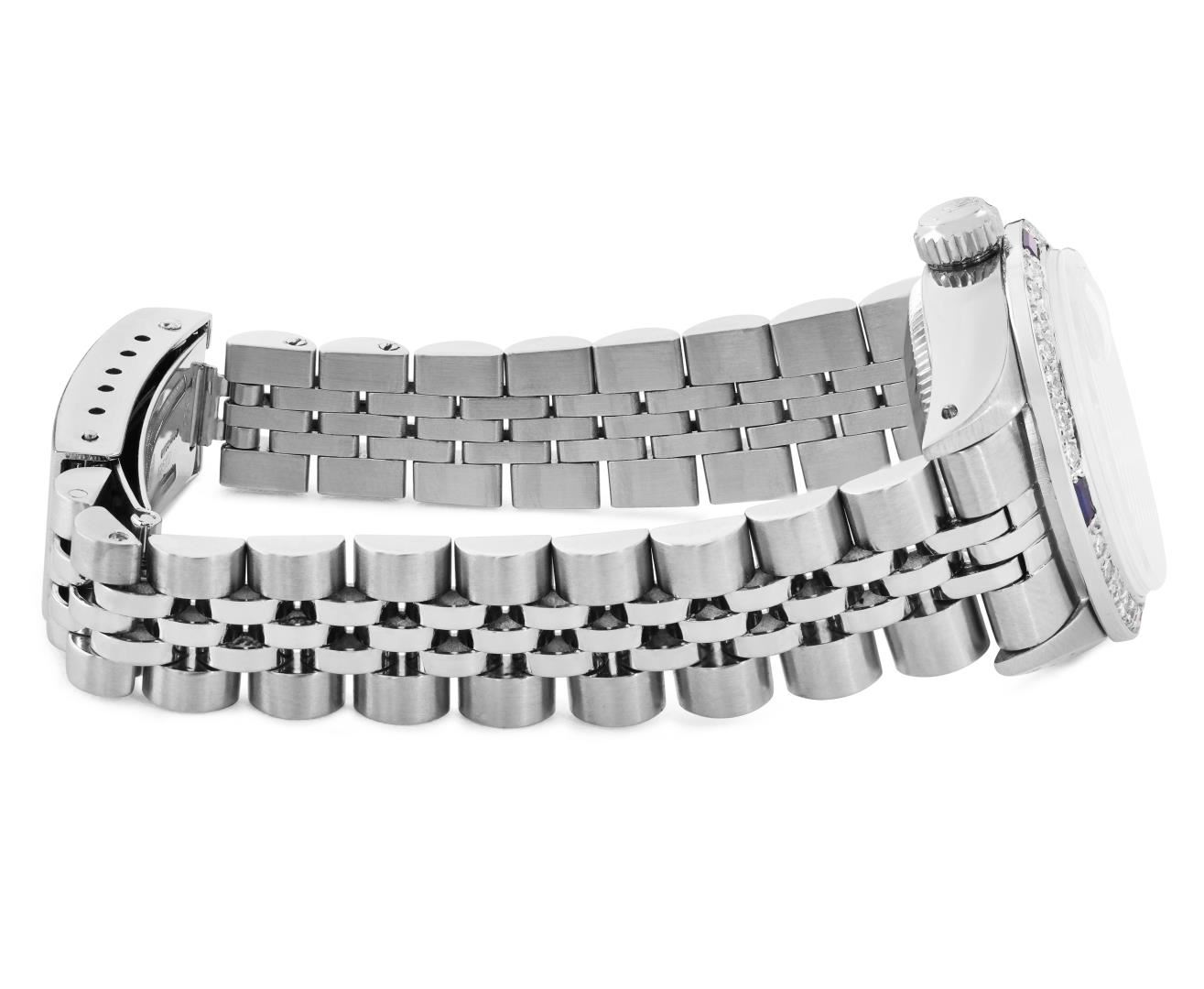 One Rolex Ladies Pre Owned Stainless Steel Date Wristwatch Polished Bright with Satin Finish, Serviced and Electronically Tested, Stainless Steel Case: 26mm, Stainless Steel Crown, Custom Bezel: New 18K White Gold Sapphire Beadset Diamond Bezel, Diamond + Gem Count: 36 Diamonds + 4 Sapphires. Custom Crystal: New Sapphire With Magnified Date Window. Rolex Movement: Automatic Winding Movement 2035. Custom Dial: Custom Gray Dial With Added Diamond Hour Markers, Dash Tracks, And Lumi Dots. Date Window: 3 O'Clock Position Date Display, Model: Date. Condition: G-6 Extra Fine. Rolex Bracelet: Stainless Steel Jubilee Band. Bright Polish and Satin Finish. 6.0 Inch Length, Adjustable. Standard Clasp, With Rolex Logo. This Watch Has Been Serviced Time Tested And Is In Excellent Condition. It Is Free Of All Scratches And Dents.