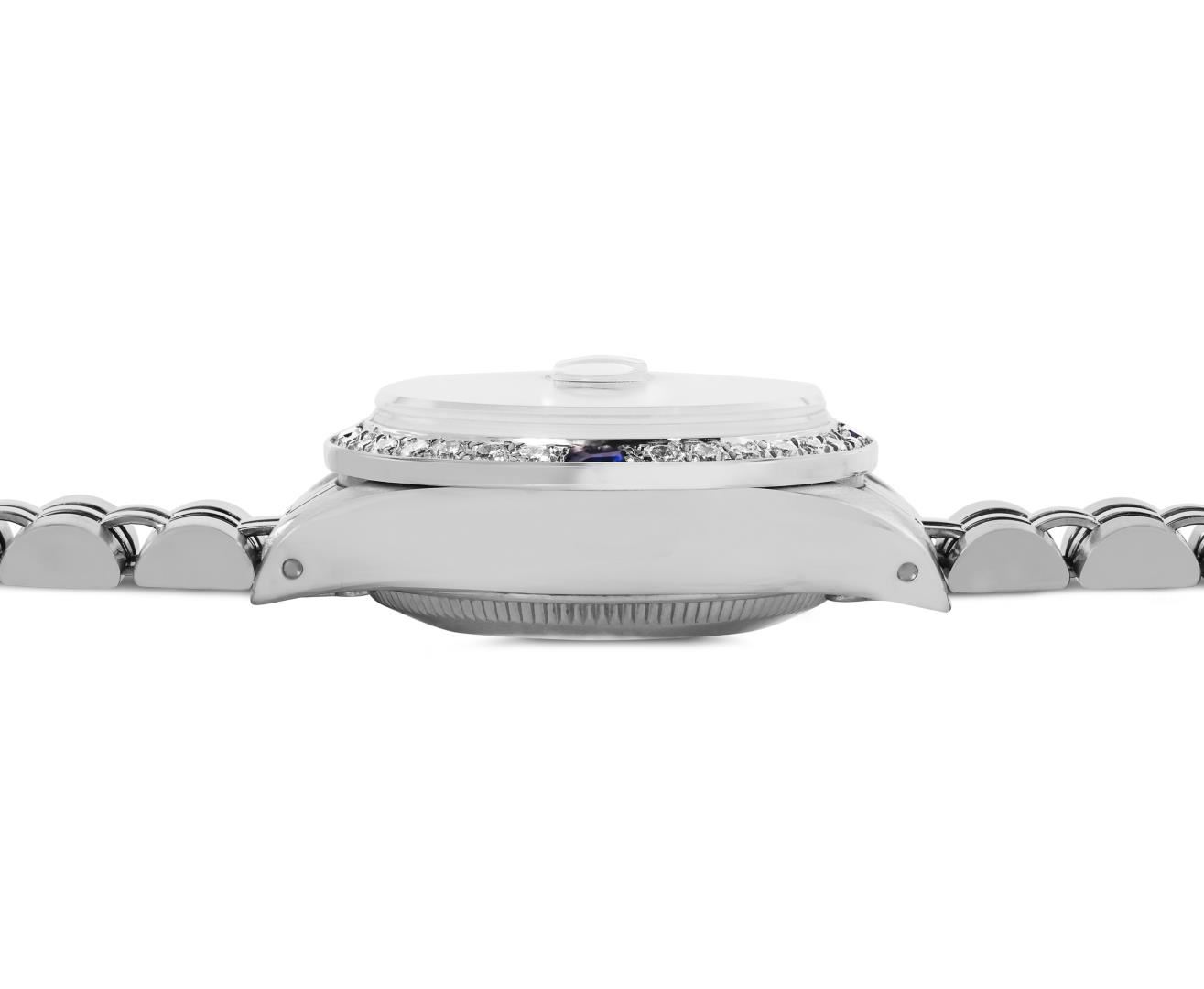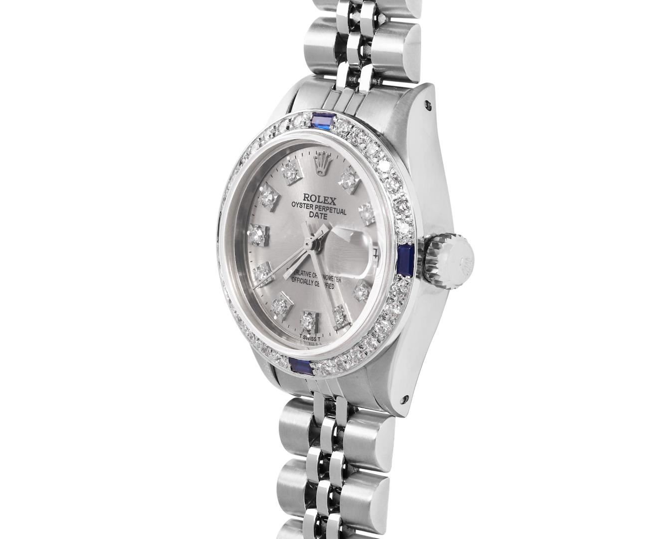 One Rolex Ladies Pre Owned Stainless Steel Date Wristwatch Polished Bright with Satin Finish, Serviced and Electronically Tested, Stainless Steel Case: 26mm, Stainless Steel Crown, Custom Bezel: New 18K White Gold Sapphire Beadset Diamond Bezel, Diamond + Gem Count: 36 Diamonds + 4 Sapphires. Custom Crystal: New Sapphire With Magnified Date Window. Rolex Movement: Automatic Winding Movement 2035. Custom Dial: Custom Gray Dial With Added Diamond Hour Markers, Dash Tracks, And Lumi Dots. Date Window: 3 O'Clock Position Date Display, Model: Date. Condition: G-6 Extra Fine. Rolex Bracelet: Stainless Steel Jubilee Band. Bright Polish and Satin Finish. 6.0 Inch Length, Adjustable. Standard Clasp, With Rolex Logo. This Watch Has Been Serviced Time Tested And Is In Excellent Condition. It Is Free Of All Scratches And Dents.