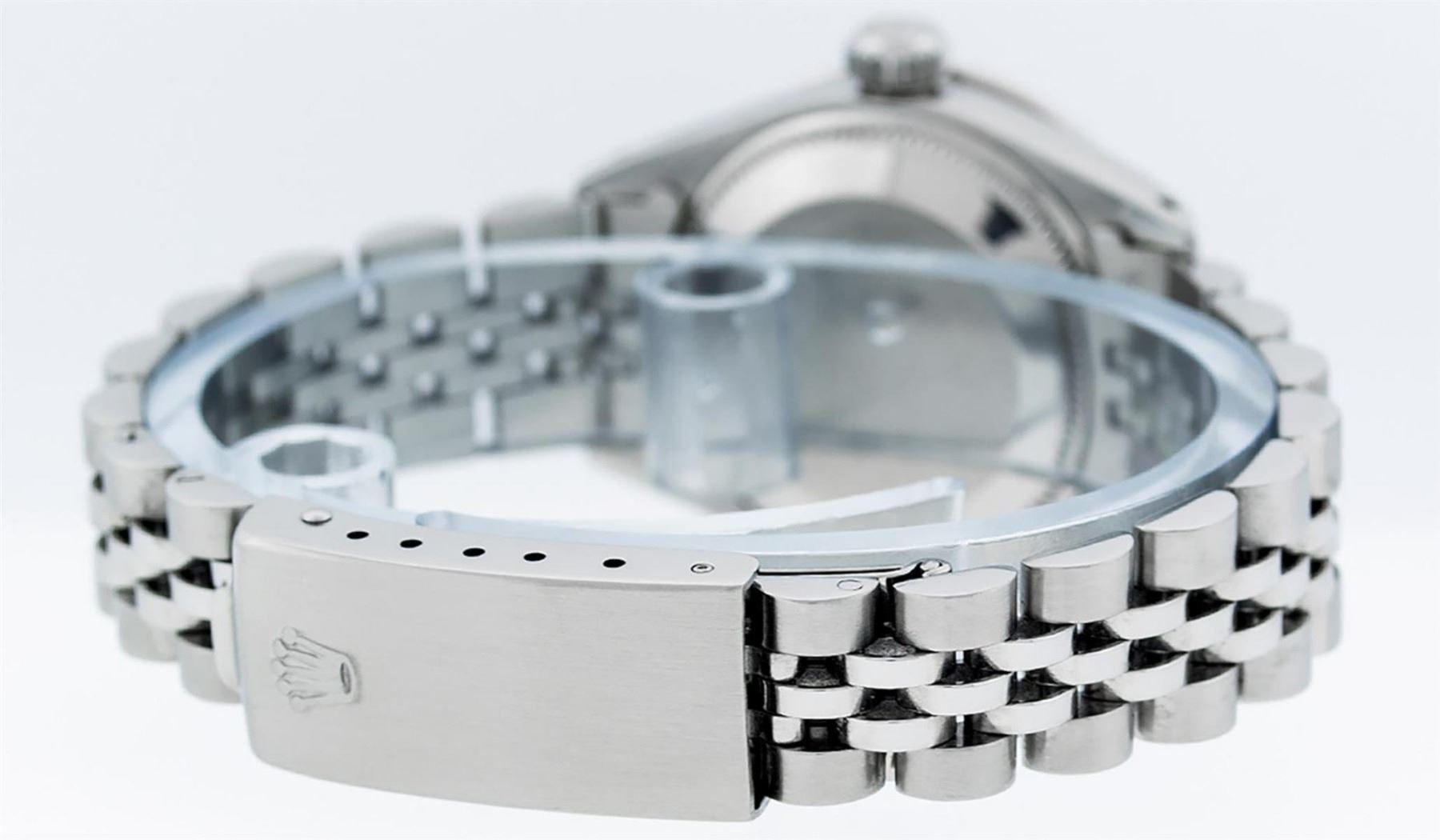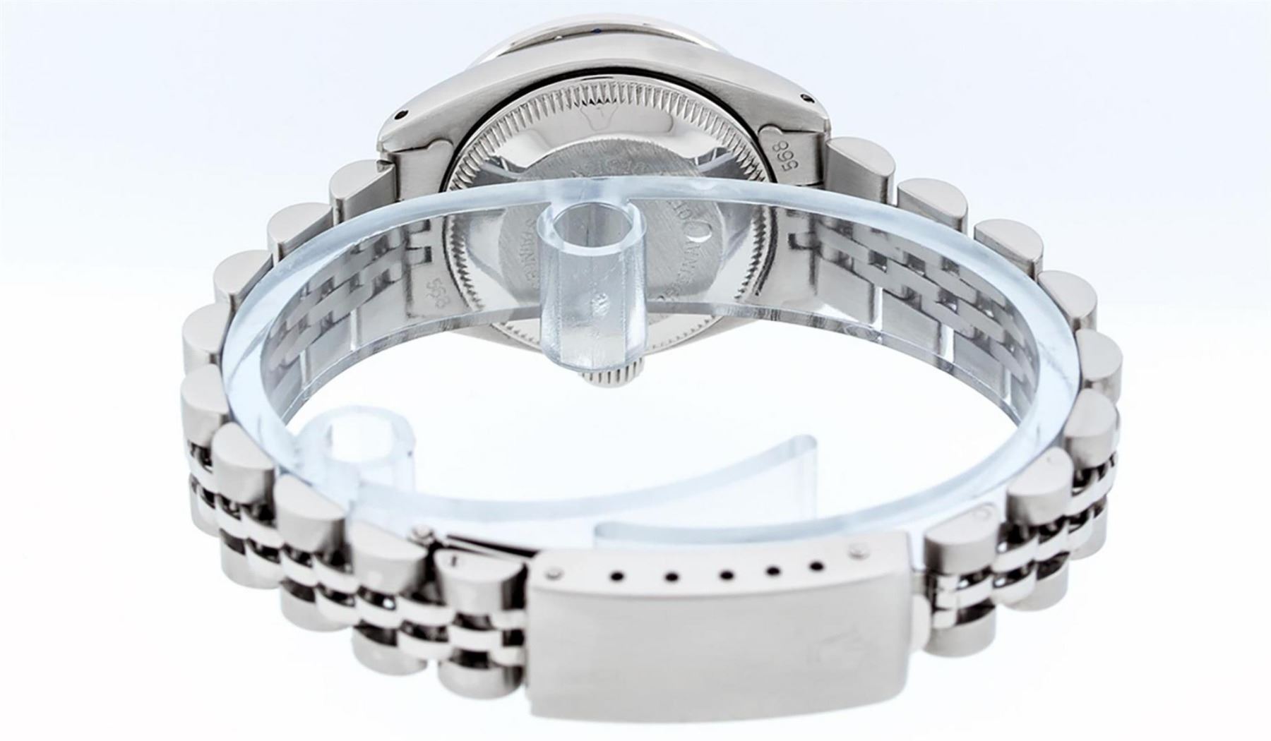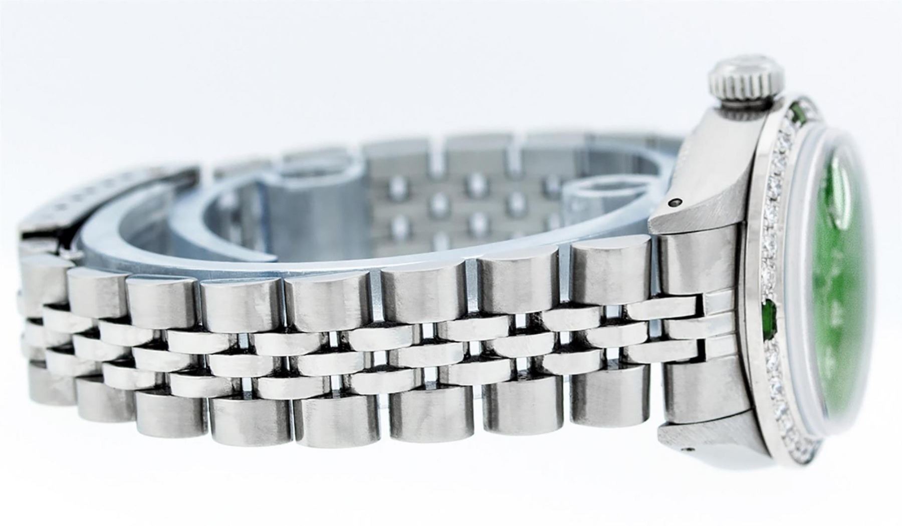 One Ladies Stainless Steel Rolex Datejust Polished Bright with Satin Finish, Serviced & Electronically Tested, Stainless Steel Case: 26mm, Stainless Steel Crown, Custom Bezel: New 18K White Gold Emerald Beadset Diamond Bezel, Diamond + Gem Count: 28 Diamonds + 4 Emeralds. Total Weight .70 Carat, Clarity: SI-VS, Color: G to H. Custom Crystal: New Scratch Resistant Synthetic Sapphire Cyclops Lens. Custom Hands: New Luminescent Hands. Movement: Automatic Winding Movement. Custom Dial: Refinished Green With Diamond Hour Markers And Dash Tracks, 10 Diamonds in Dial, G To H In Color, Clarity: SI-VS. Date Window: 3 O'Clock Position Date Display, Model: Datejust. Condition: G-6 Extra Fine. Bracelet: Stainless Steel Jubilee Band. Bright Polish & Satin Finish. 6.0 Inch Length, Adjustable. Standard Clasp, With Rolex Logo. This Watch Has Been Serviced Time Tested And Is In Excellent Condition It Is Free Of All Scratches And Dents.