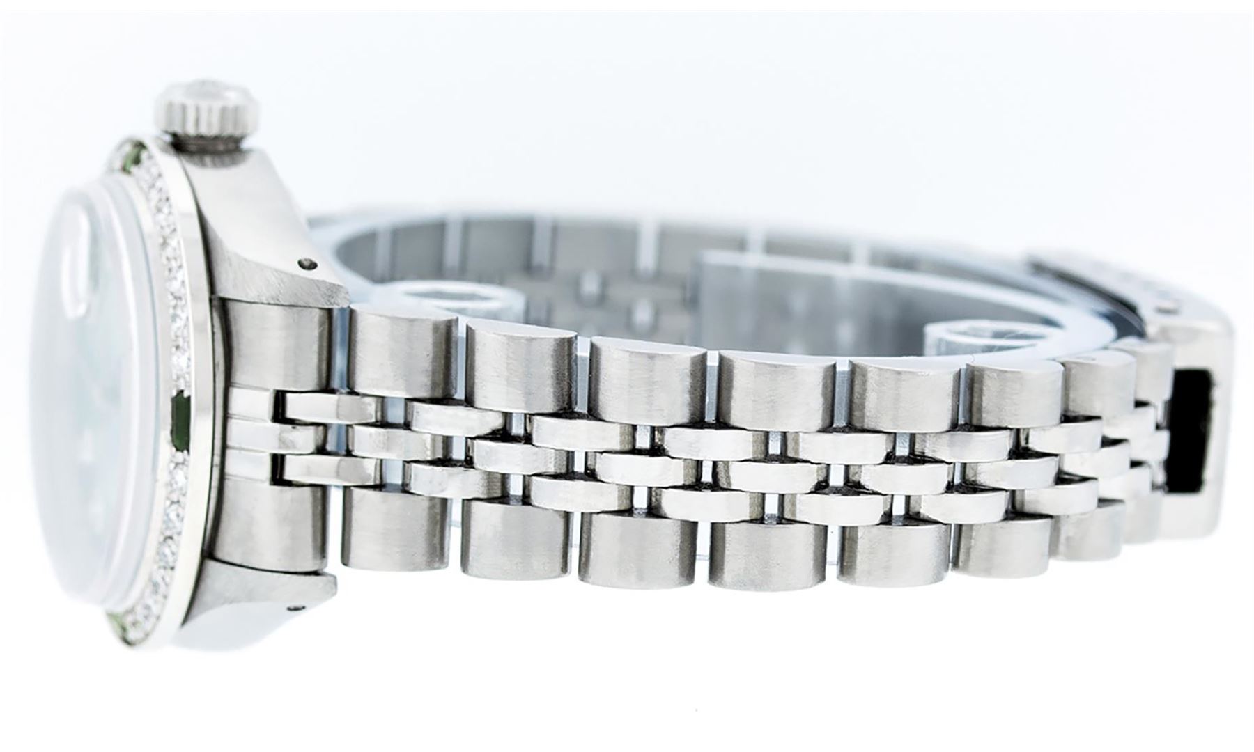 One Ladies Stainless Steel Rolex Datejust Polished Bright with Satin Finish, Serviced & Electronically Tested, Stainless Steel Case: 26mm, Stainless Steel Crown, Custom Bezel: New 18K White Gold Emerald Beadset Diamond Bezel, Diamond + Gem Count: 28 Diamonds + 4 Emeralds. Total Weight .70 Carat, Clarity: SI-VS, Color: G to H. Custom Crystal: New Scratch Resistant Synthetic Sapphire Cyclops Lens. Custom Hands: New Luminescent Hands. Movement: Automatic Winding Movement Caliber 2030. Custom Dial: Refinished Green With Diamond Hour Markers And Dash Tracks, 10 Diamonds in Dial, G To H In Color, Clarity: SI-VS. Date Window: 3 O'Clock Position Date Display, Model: Datejust. Condition: G-6 Extra Fine. Bracelet: Stainless Steel Jubilee. Bright Polish & Satin Finish. 6.0 Inch Length, Adjustable. Standard Clasp, With Rolex Logo. This Watch Has Been Serviced Time Tested And Is In Excellent Condition It Is Free Of All Scratches And Dents.