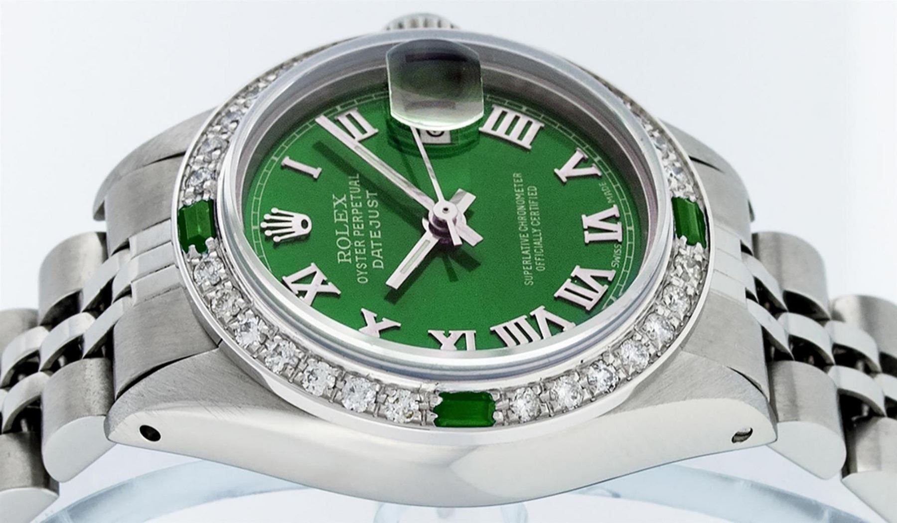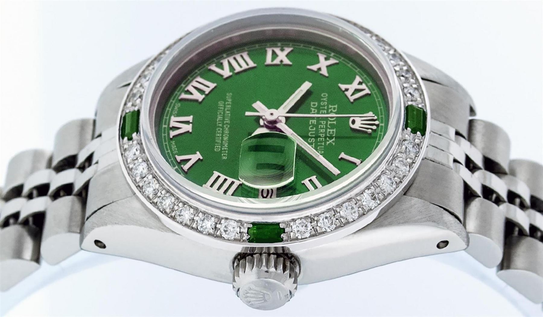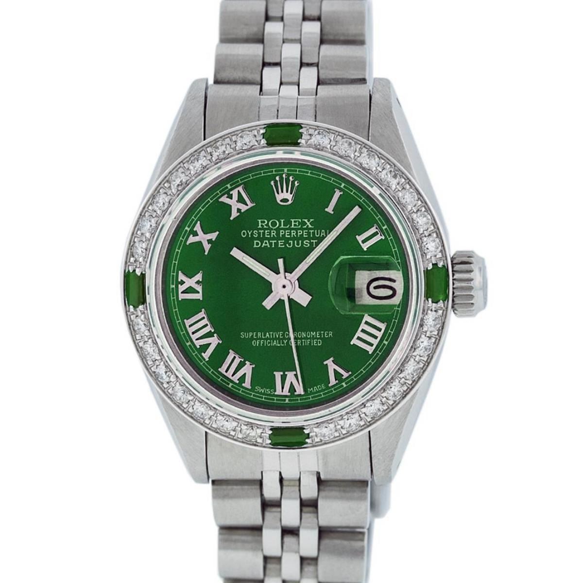 One Ladies Stainless Steel Rolex Datejust Polished Bright with Satin Finish, Serviced & Electronically Tested, Stainless Steel Case: 26mm, Stainless Steel Crown, Custom Bezel: New 18K White Gold Emerald Beadset Diamond Bezel, Diamond + Gem Count: 28 Diamonds + 4 Emeralds, Total Weight .70 Carat, Clarity: SI-VS, Color: G to H. Custom Crystal: New Scratch Resistant Synthetic Sapphire Cyclops Lens. Custom Hands: New Luminescent Hands. Movement: Automatic Winding Movement. Custom Dial: Green Roman Dial With Square Track. Date Window: 3 O'Clock Position Date Display, Model: Datejust. Condition: G-6 Extra Fine. Bracelet: Stainless Steel Jubilee. Bright Polish & Satin Finish. 6.0 Inch Length, Adjustable. Standard Clasp, With Rolex Logo. This Watch Has Been Serviced Time Tested And Is In Excellent Condition It Is Free Of All Scratches And Dents.
