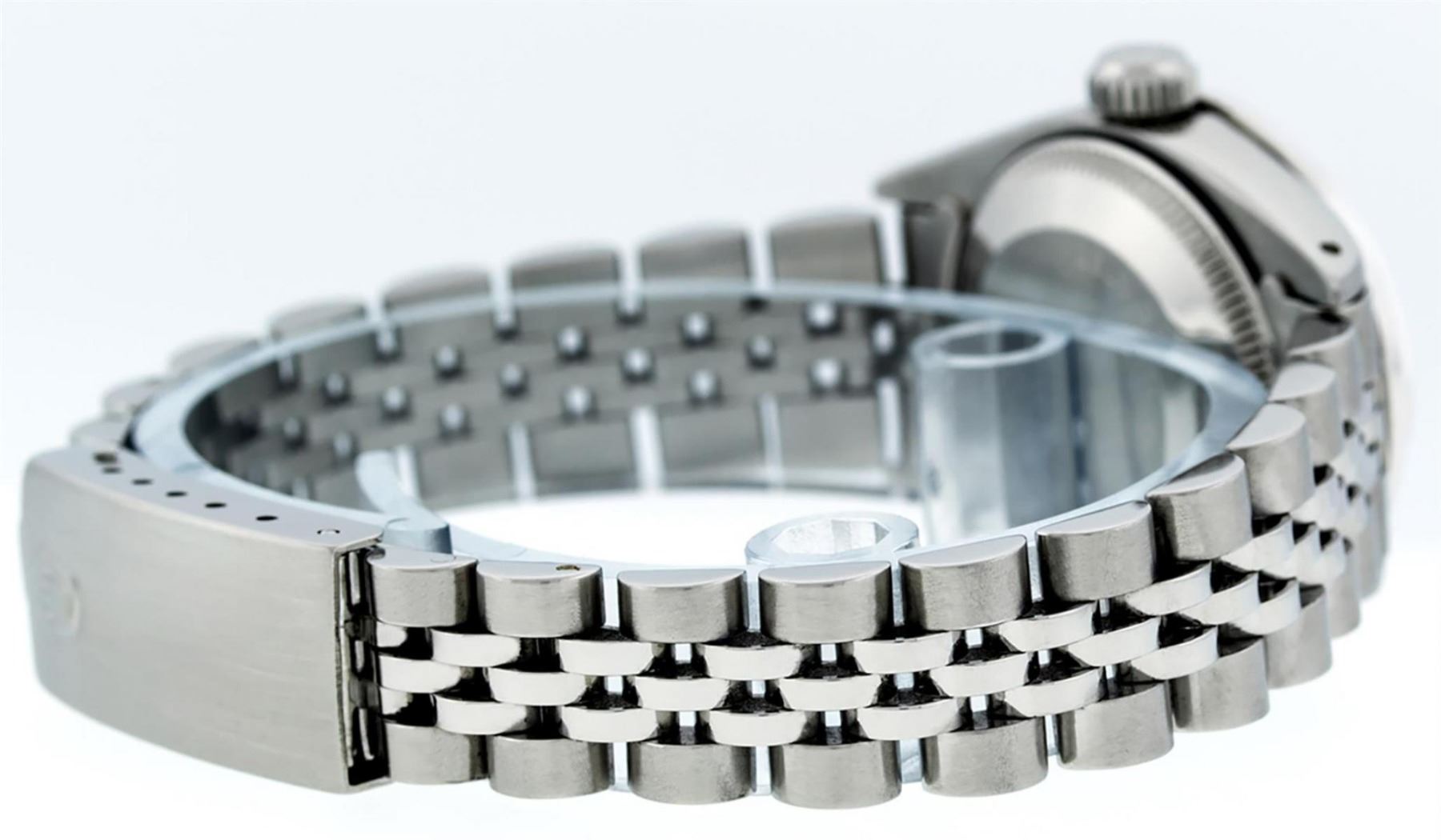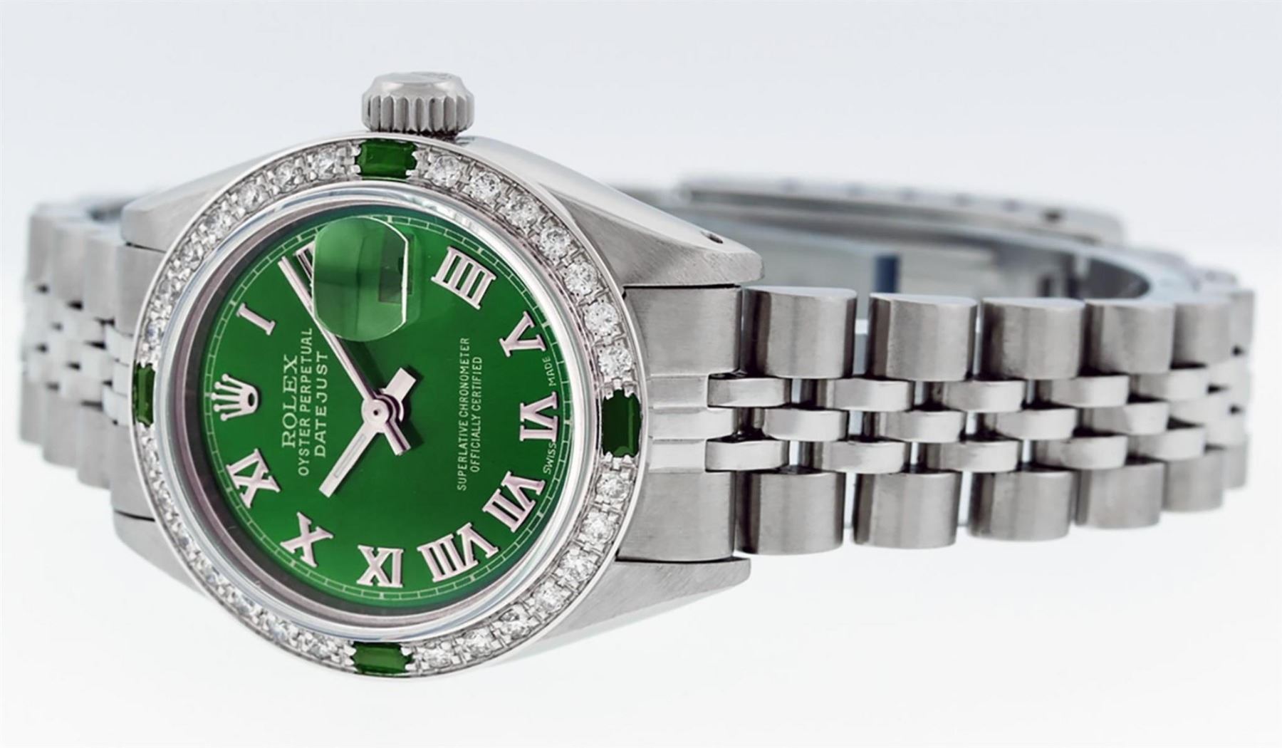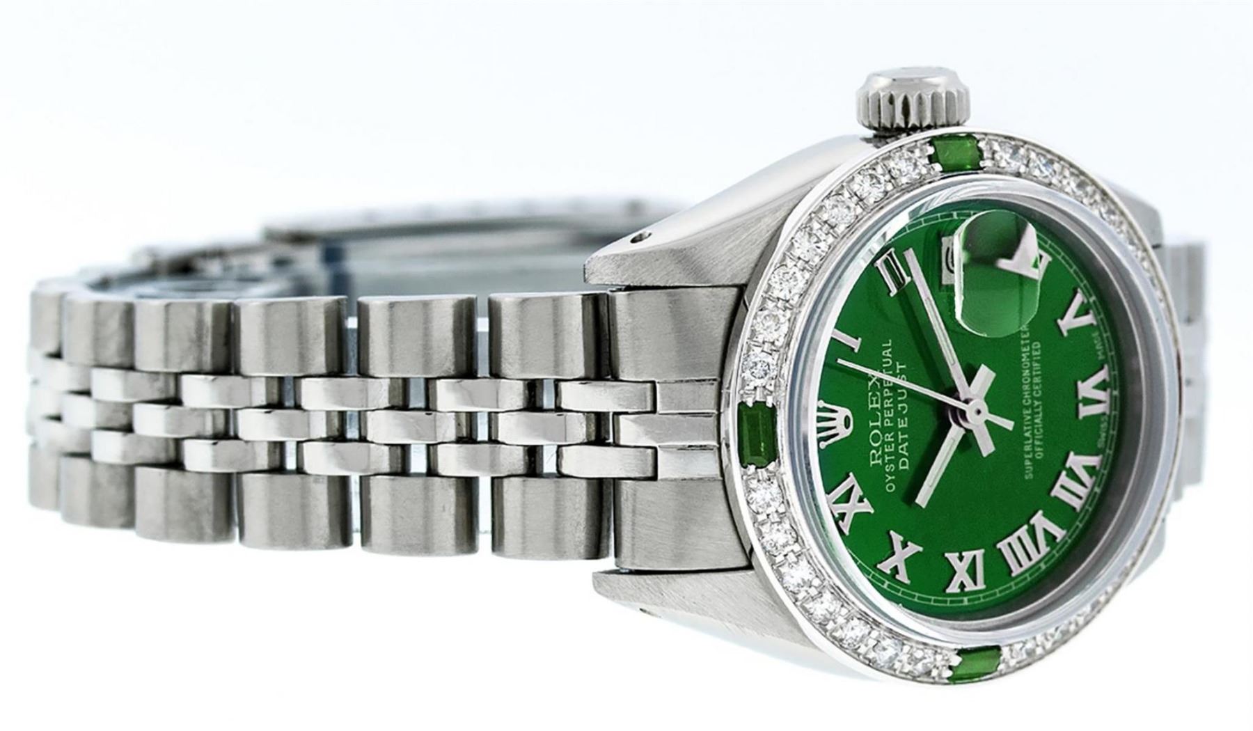 One Ladies Stainless Steel Rolex Datejust Polished Bright with Satin Finish, Serviced & Electronically Tested, Stainless Steel Case: 26mm, Stainless Steel Crown, Custom Bezel: New 18K White Gold Emerald Beadset Diamond Bezel, Diamond + Gem Count: 28 Diamonds + 4 Emeralds, Total Weight .70 Carat, Clarity: SI-VS, Color: G to H. Custom Crystal: New Scratch Resistant Synthetic Sapphire Cyclops Lens. Custom Hands: New Luminescent Hands. Movement: Automatic Winding Movement. Custom Dial: Green Roman Dial With Square Track. Date Window: 3 O'Clock Position Date Display, Model: Datejust. Condition: G-6 Extra Fine. Bracelet: Stainless Steel Jubilee. Bright Polish & Satin Finish. 6.0 Inch Length, Adjustable. Standard Clasp, With Rolex Logo. This Watch Has Been Serviced Time Tested And Is In Excellent Condition It Is Free Of All Scratches And Dents.