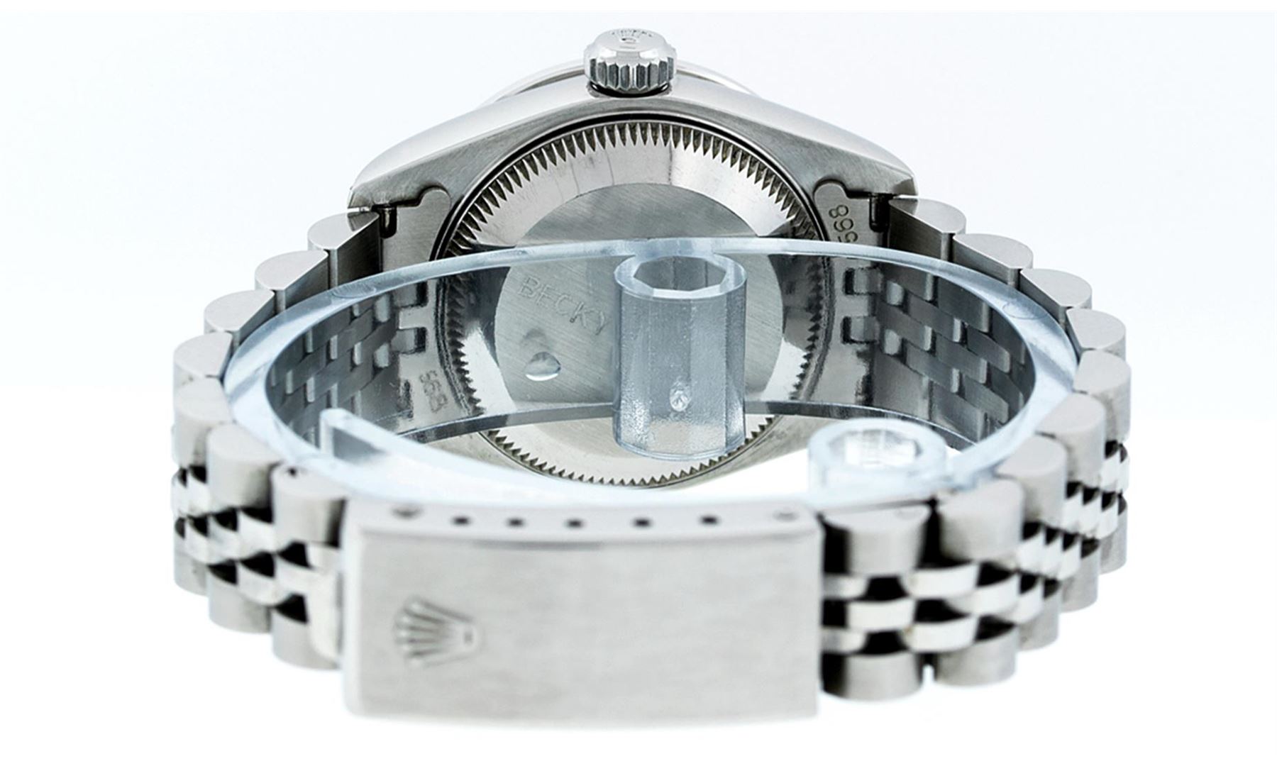 One Ladies Quickset Stainless Steel Rolex Oyster Perpetual Datejust Polished Bright with Satin Finish, Serviced & Electronically Tested, Stainless Steel Case: 26mm, Stainless Steel Crown, Bezel: 18K White Gold Fluted Bezel. Custom Crystal: New Scratch Resistant Sapphire Cyclops Lens. Custom Hands: New Luminescent Hands. Movement: Automatic Winding Movement. Custom Dial: Green Diamond Dial, Diamond Count: 10 Diamonds In Dial, Color: G to H, Clarity: SI1 Date Window: 3 O'Clock Position Date Display, Model: 79174 Quickset Datejust. Condition: G-6 Extra Fine. Bracelet: Stainless Steel Jubilee Band. Bright Polish & Satin Finish. 6.0 Inch Length, Adjustable. Standard Clasp, With Rolex Logo. This Watch Has Been Serviced Time Tested And Is In Excellent Condition It Is Free Of All Scratches And Dents.