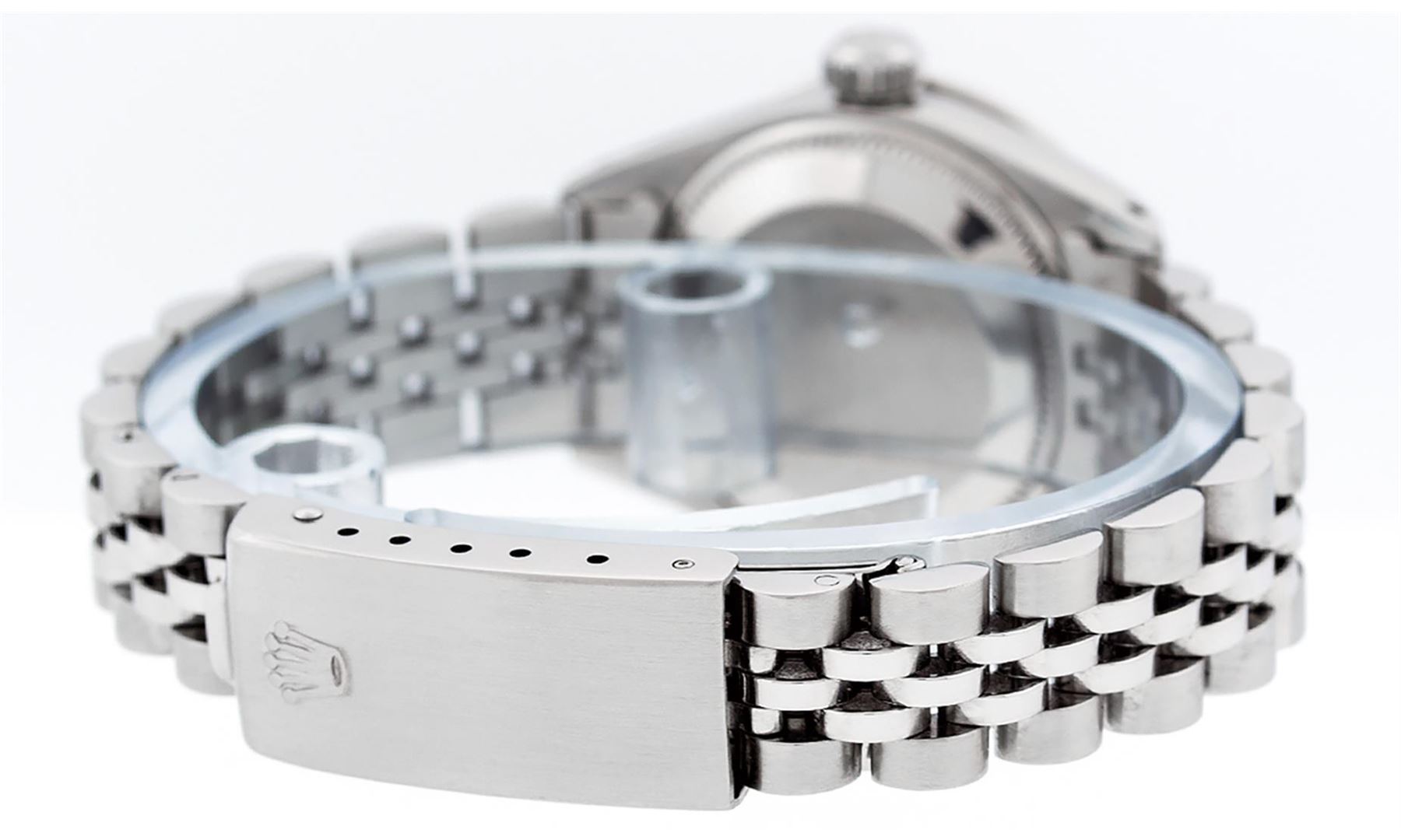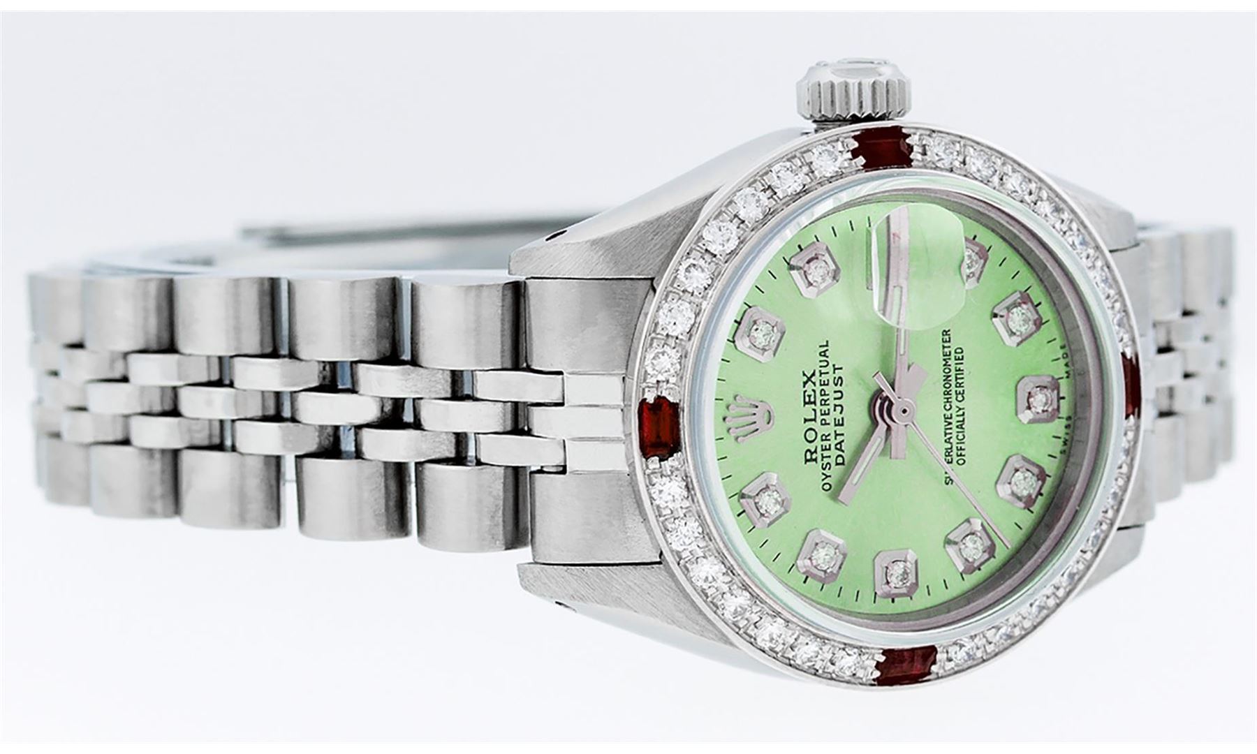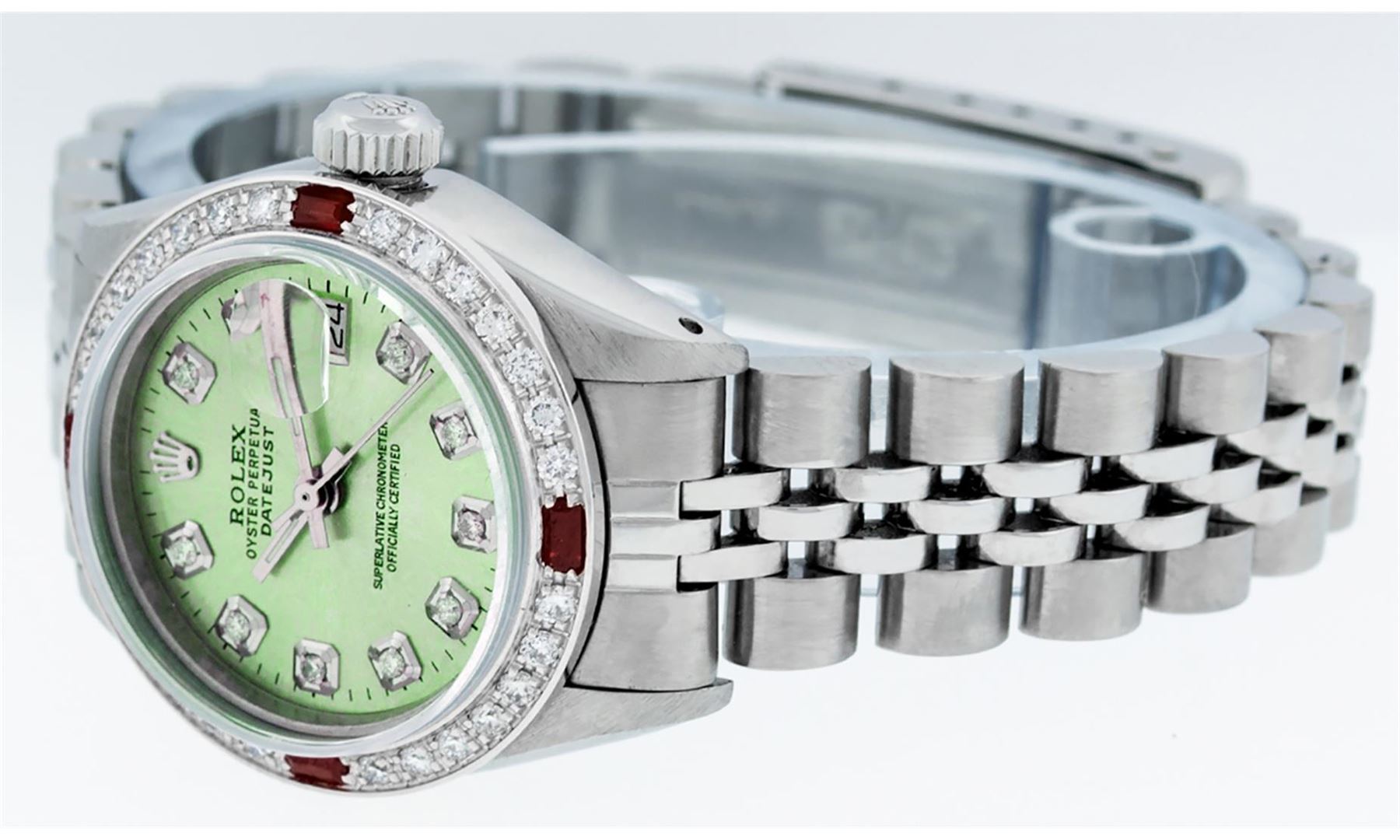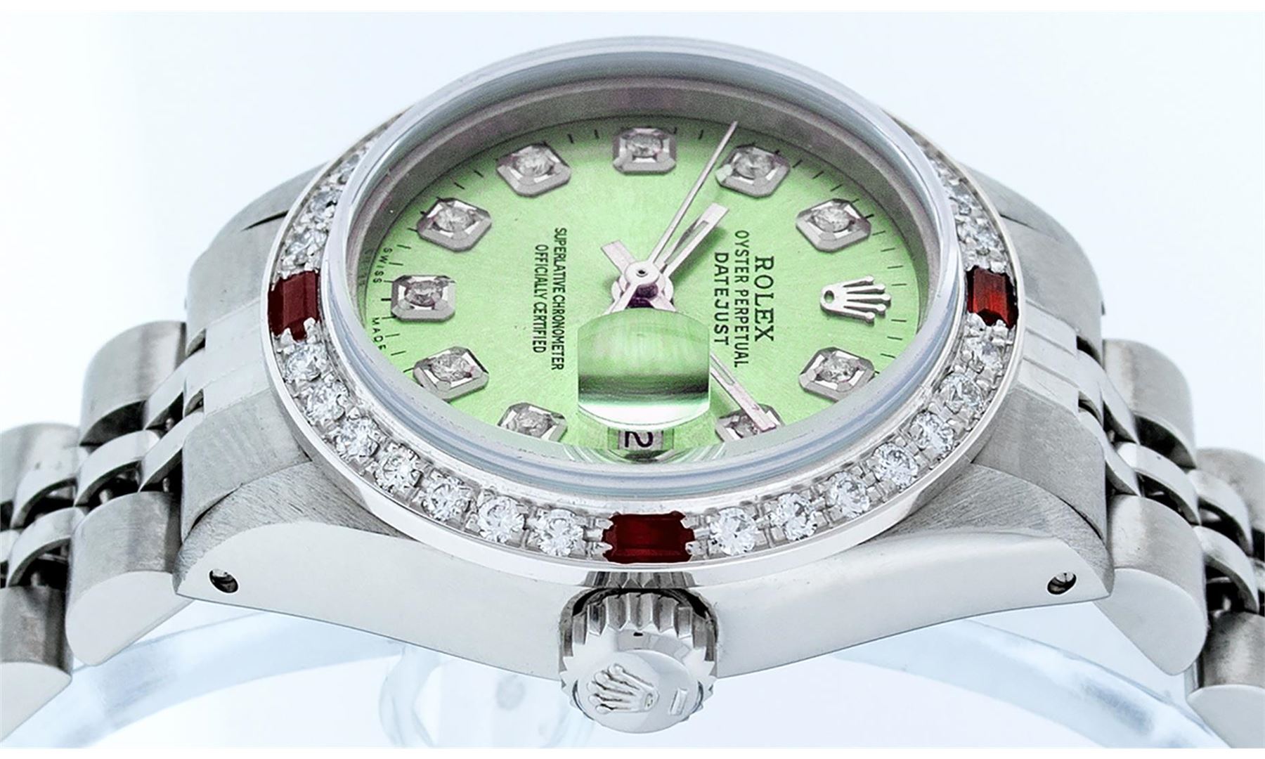 One Ladies Stainless Steel Rolex Datejust Polished Bright with Satin Finish, Serviced & Electronically Tested, Stainless Steel Case: 26mm, Stainless Steel Crown, Custom Bezel: New 18K White Gold Ruby Beadset Diamond Bezel, Diamond + Gem Count: 28 Diamonds + 4 Rubies. Total Weight .70 Carat, Clarity: SI-VS, Color: G to H. Custom Crystal: New Scratch Resistant Synthetic Sapphire Cyclops Lens. Custom Hands: New Luminescent Hands. Movement: Automatic Winding Movement. Custom Dial: Refinished Green With Diamond Hour Markers & Dash Track, 10 Diamonds in Dial, G To H In Color, Clarity: SI-VS. Date Window: 3 O'Clock Position Date Display, Model: Datejust. Condition: G-6 Extra Fine. Bracelet: Stainless Steel Jubilee. Bright Polish & Satin Finish. 6.0 Inch Length, Adjustable. Standard Clasp, With Rolex Logo. This Watch Has Been Serviced Time Tested And Is In Excellent Condition It Is Free Of All Scratches And Dents.