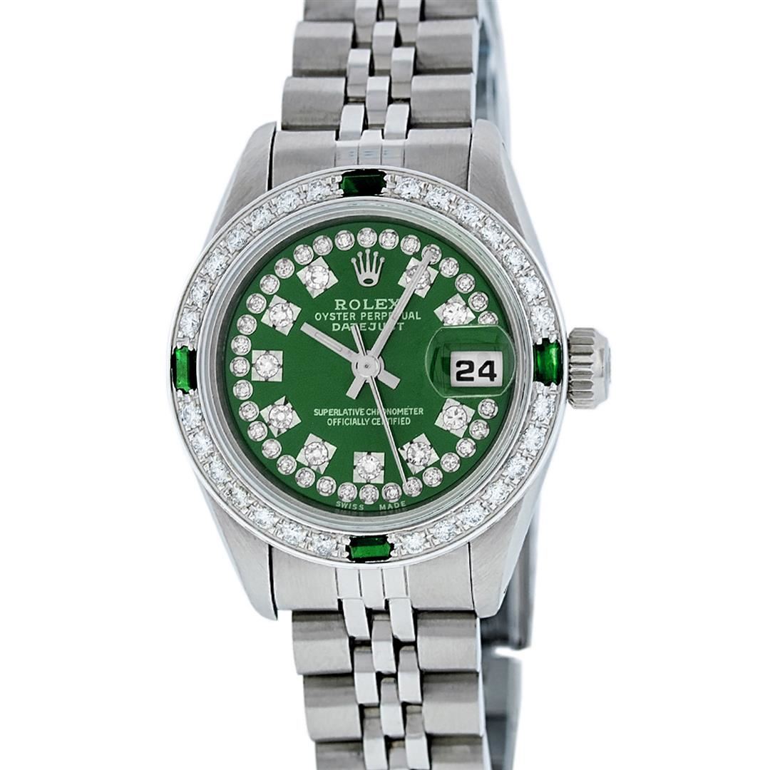 One Ladies Stainless Steel Rolex Datejust Polished Bright with Satin Finish, Serviced & Electronically Tested, Stainless Steel Case: 26mm, Stainless Steel Crown. Custom Bezel: New 18K White Gold Beadset & Emerald Diamond Bezel, Diamond Count: 28 Diamonds + 4 Emeralds. Total Weight .70 Carat, Clarity: SI-VS, Color: G to H. Custom Crystal: New Scratch Resistant Synthetic Sapphire Cyclops Lens. Custom Hands: New Luminescent Hands. Movement: Automatic Winding Movement. Custom Dial: Refinished Green String Single Cut Diamond Dial, Stone Count: 43 Diamonds On Dial, G To H In Color, Clarity: SI-VS. Date Window: 3 O'Clock Position Date Display, Model: Datejust. Condition: G-6 Extra Fine. Bracelet: Stainless Steel Jubilee Band. Bright Polish & Satin Finish. 6.0 Inch Length, Adjustable. Standard Clasp, With Rolex Logo. This Watch Has Been Serviced Time Tested And Is In Excellent Condition It Is Free Of All Scratches And Dents.