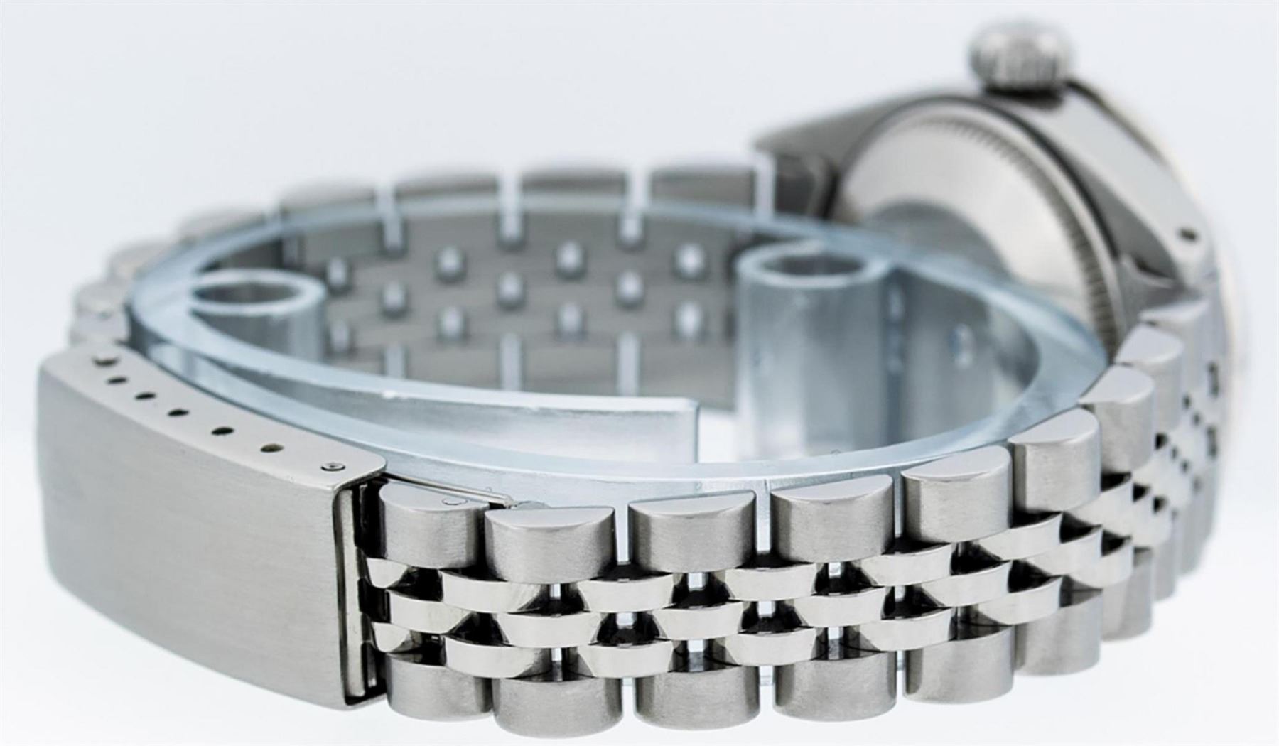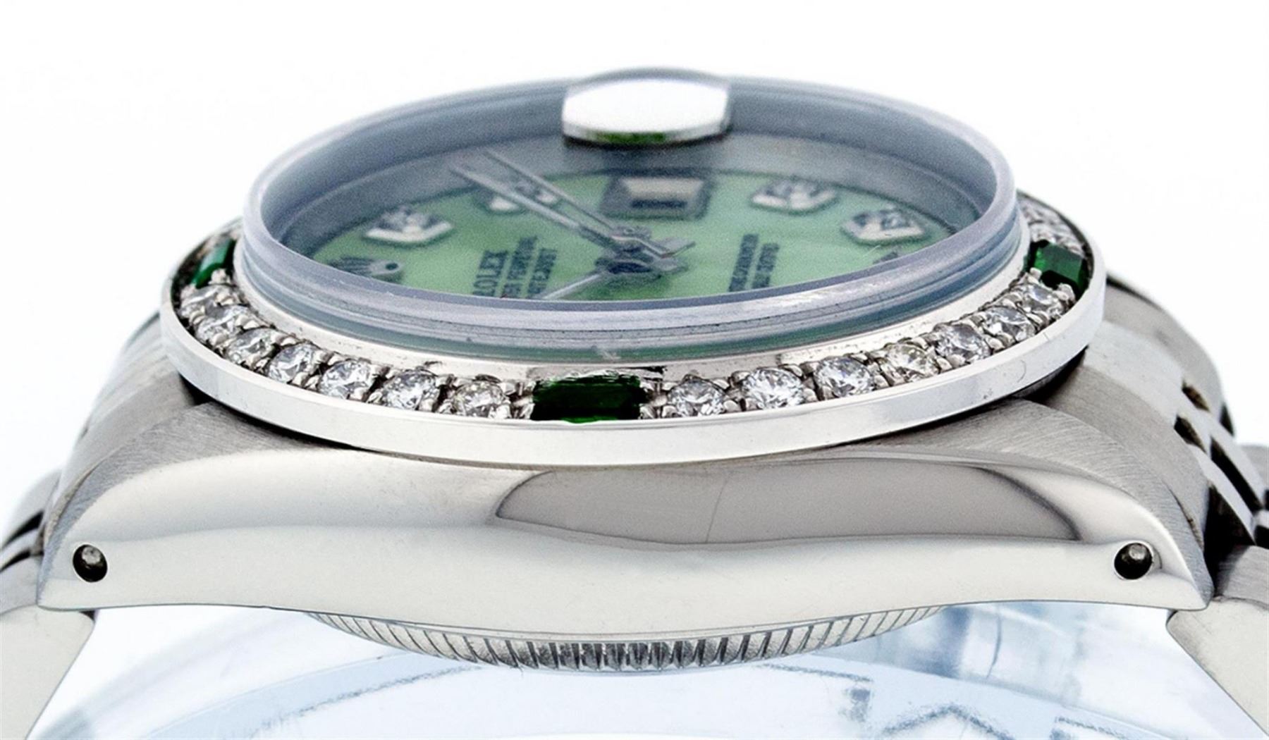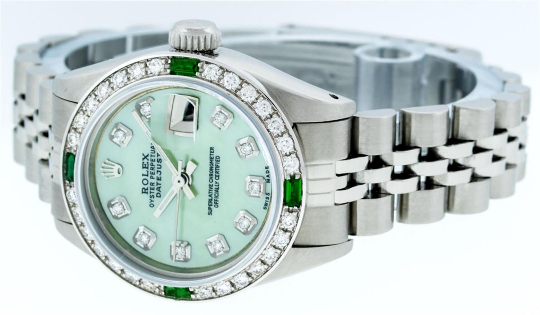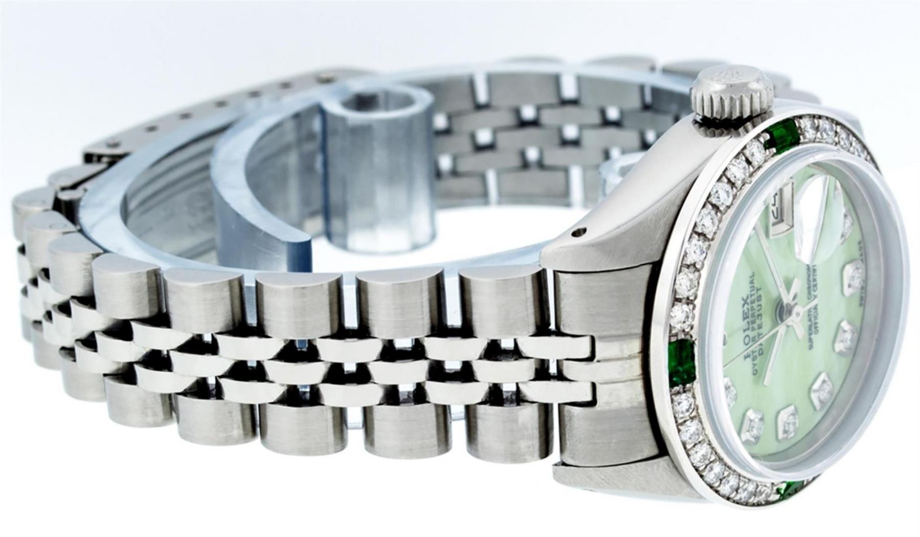 One Ladies Stainless Steel Rolex Datejust Polished Bright with Satin Finish, Serviced & Electronically Tested, Stainless Steel Case: 26mm, Stainless Steel Crown. Custom Bezel: New 18K White Gold Beadset & Synthetic Emerald Diamond Bezel, Diamond Count: 28 Diamonds + 4 Synthetic Emeralds. Total Weight .70 Carat, Clarity: SI-VS, Color: G to H. Custom Crystal: New Synthetic Sapphire Cyclops Lens. Custom Hands: New Luminescent Hands. Movement: Automatic Winding Movement Caliber 2030. Custom Dial: Refinished Green Mother Of Pearl Diamond Dial, Stone Count: 10 Diamonds In Dial, G To H In Color, Clarity: SI-VS. Date Window: 3 O'Clock Position Date Display, Model: Datejust. Condition: G-6 Extra Fine. Bracelet: Stainless Steel Jubilee. Bright Polish & Satin Finish. 6.0 Inch Length, Adjustable. Standard Clasp, With Rolex Logo. This Watch Has Been Serviced Time Tested And Is In Excellent Condition It Is Free Of All Scratches And Dents.
