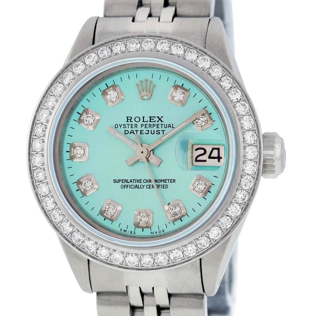 One Ladies Stainless Steel Rolex Datejust Polished Bright with Satin Finish, Serviced & Electronically Tested, Stainless Steel Case: 26mm, Stainless Steel Crown, Custom Bezel: New Stainless Steel Beadset Diamond Bezel, Diamond Count: 44 Diamonds, Total Weight .90 Carat, Clarity: SI-VS, Color: G to H. Custom Crystal: New Synthetic Sapphire Cyclops Lens. Custom Hands: New Luminescent Hands. Movement: Automatic Winding Movement. Custom Dial: Refinished Ice Blue Diamond With Dash Track, Diamond Count: 10 Diamonds in Dial G To H In Color, Clarity: SI-VS. Date Window: 3 O'Clock Position Date Display, Model: Datejust. Condition: G-6 Extra Fine. Bracelet: Stainless Steel Jubilee Band. Bright Polish & Satin Finish. 6.0 Inch Length, Adjustable. Standard Clasp, With Rolex Logo.