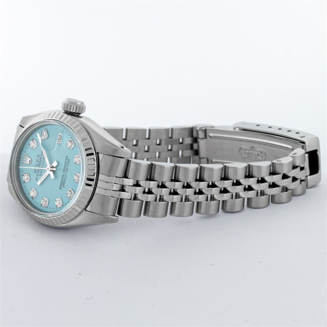 One Ladies Stainless Steel Rolex Datejust Polished Bright with Satin Finish, Serviced & Electronically Tested, Stainless Steel Case: 26mm, Stainless Steel Crown, Bezel: 14K White Gold Bezel. Custom Crystal: New Acrylic Cyclops Lens. Custom Hands: New Luminescent Hands. Movement: Automatic Winding Movement . Dial: Ice Blue Diamond Dial, Diamond Count: 10 Diamonds In Dial, Color: G to H, Clarity: SI-VS. Date Window: 3 O'Clock Position Date Display, Model: Datejust. Condition: G-6 Extra Fine. Bracelet: Stainless Steel Jubilee Band. Bright Polish & Satin Finish. 6.0 Inch Length, Adjustable. Standard Clasp, With Rolex Logo. This Watch Has Been Serviced Time Tested And Is In Excellent Condition It Is Free Of All Scratches And Dents.