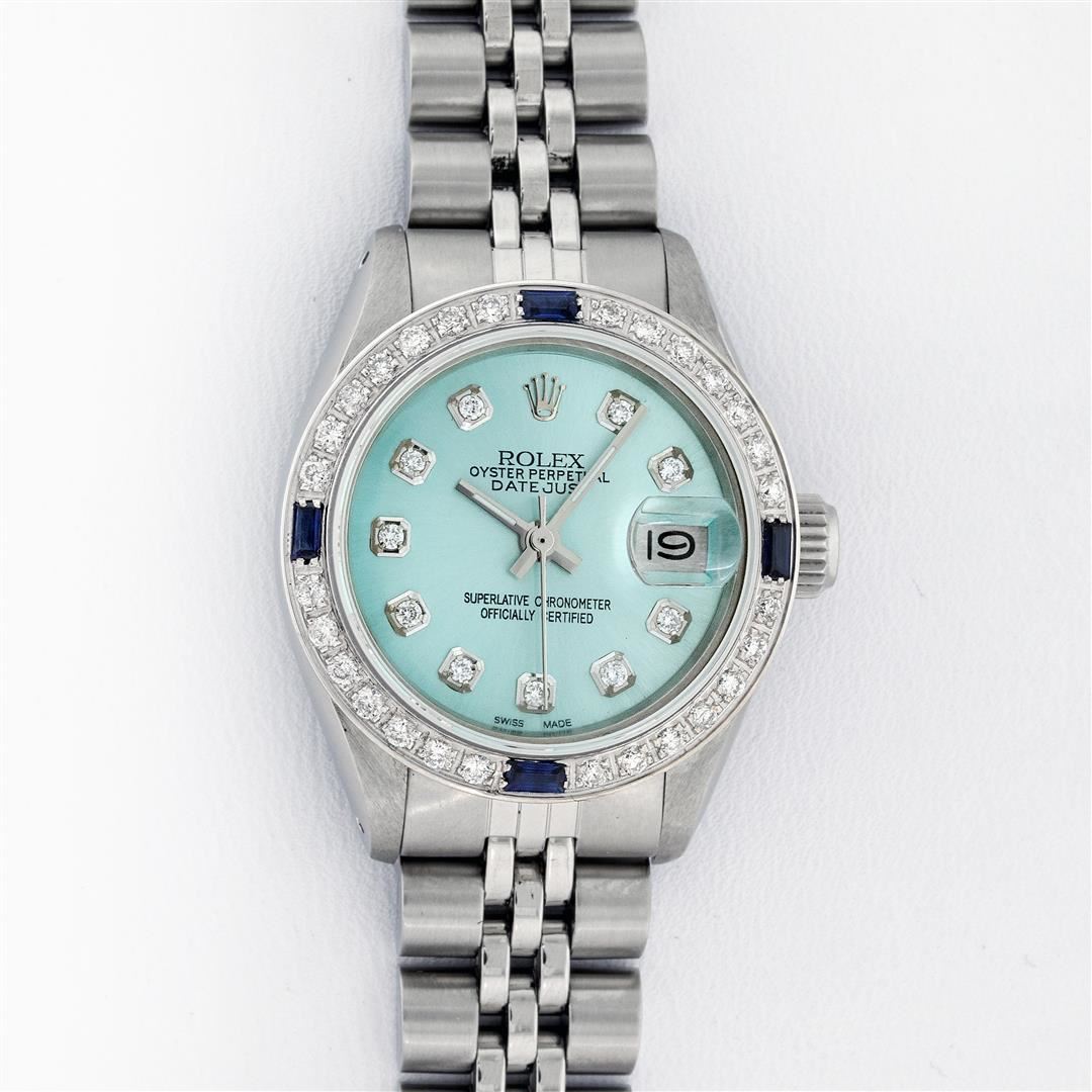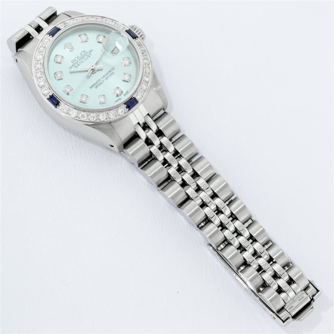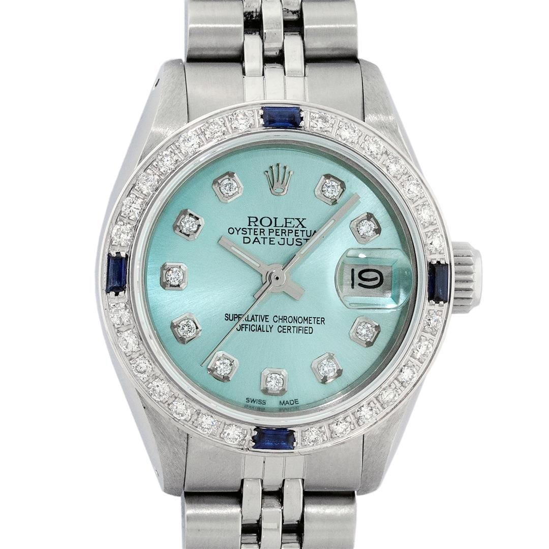 One Ladies Stainless Steel Rolex Datejust Polished Bright with Satin Finish, Serviced & Electronically Tested, Stainless Steel Case: 26mm, Stainless Steel Crown, Bezel: 14K White Gold Bezel. Custom Crystal: New Acrylic Cyclops Lens. Custom Hands: New Luminescent Hands. Movement: Automatic Winding Movement. Dial: Ice Blue Diamond Dial, Diamond Count: 10 Diamonds In Dial, Color: G to H, Clarity: SI-VS. Date Window: 3 O'Clock Position Date Display, Model: Datejust. Condition: G-6 Extra Fine. Bracelet: Stainless Steel Jubilee Band. Bright Polish & Satin Finish. 6.0 Inch Length, Adjustable. Standard Clasp, With Rolex Logo. This Watch Has Been Serviced Time Tested And Is In Excellent Condition It Is Free Of All Scratches And Dents.