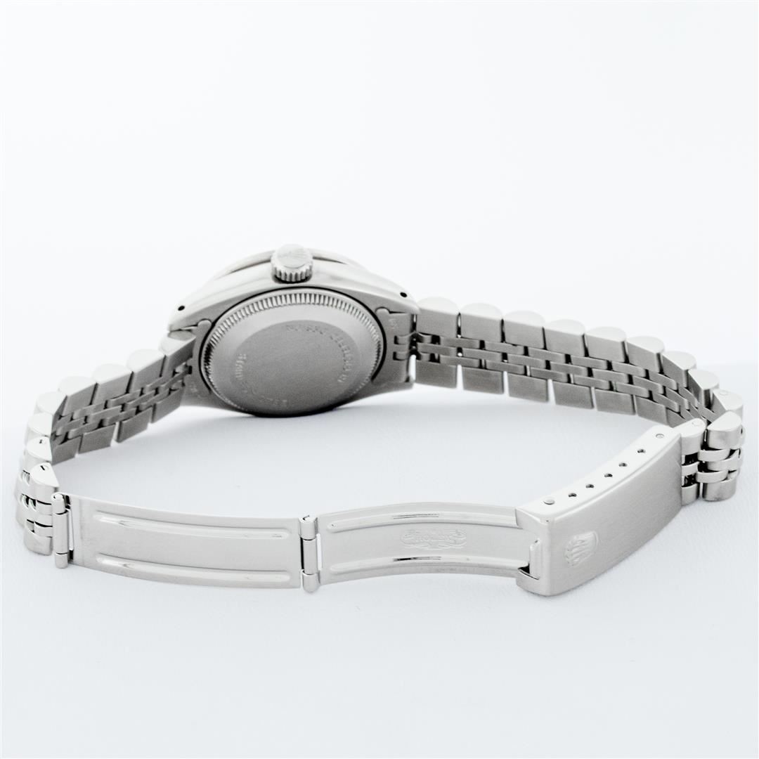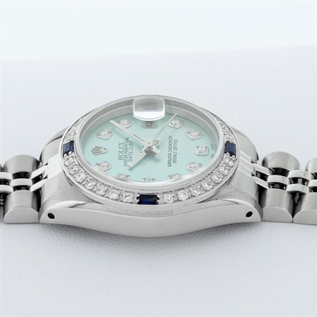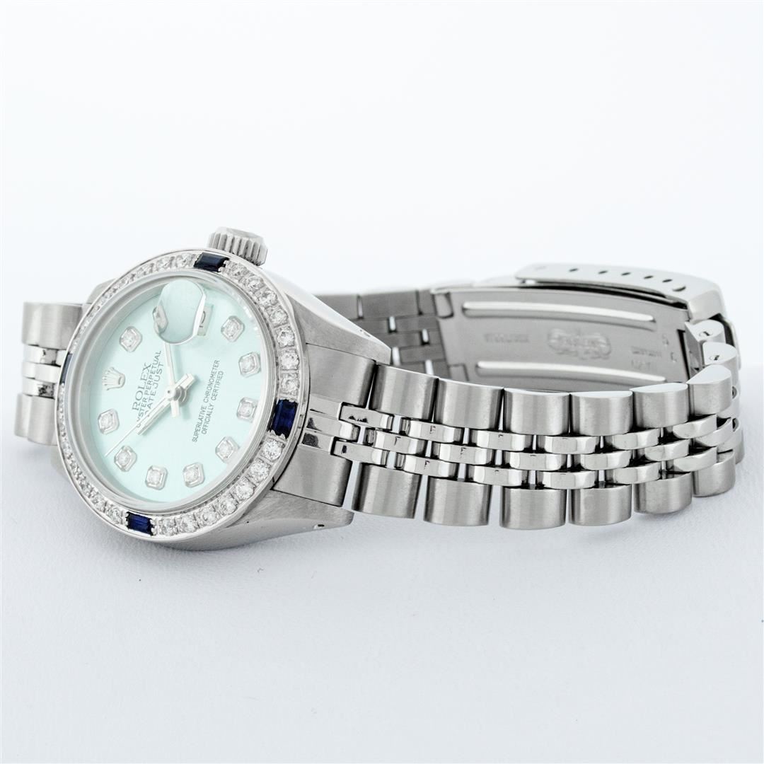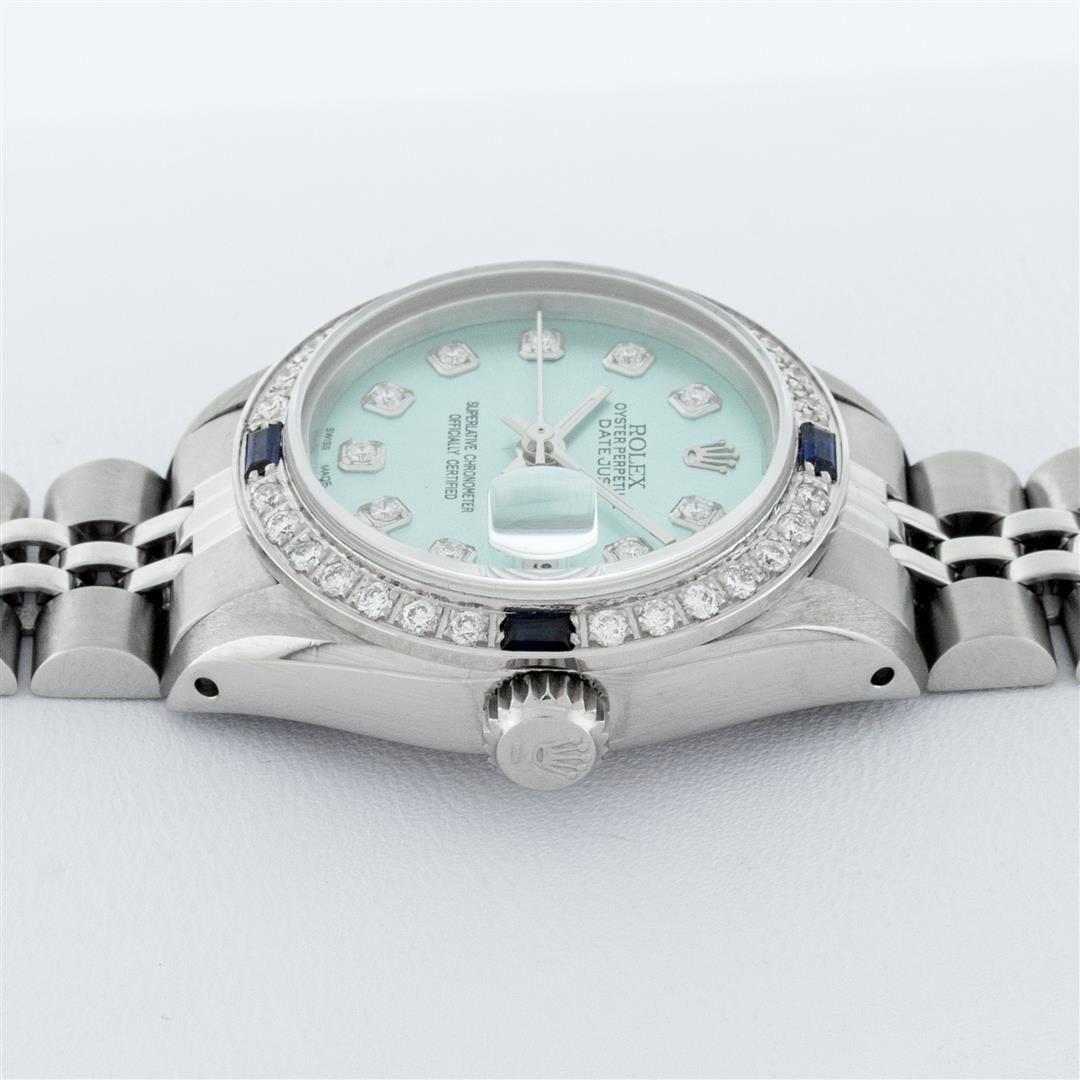 One Ladies Stainless Steel Rolex Datejust Polished Bright with Satin Finish, Serviced & Electronically Tested, Stainless Steel Case: 26mm, Stainless Steel Crown, Bezel: 14K White Gold Bezel. Custom Crystal: New Acrylic Cyclops Lens. Custom Hands: New Luminescent Hands. Movement: Automatic Winding Movement. Dial: Ice Blue Diamond Dial, Diamond Count: 10 Diamonds In Dial, Color: G to H, Clarity: SI-VS. Date Window: 3 O'Clock Position Date Display, Model: Datejust. Condition: G-6 Extra Fine. Bracelet: Stainless Steel Jubilee Band. Bright Polish & Satin Finish. 6.0 Inch Length, Adjustable. Standard Clasp, With Rolex Logo. This Watch Has Been Serviced Time Tested And Is In Excellent Condition It Is Free Of All Scratches And Dents.