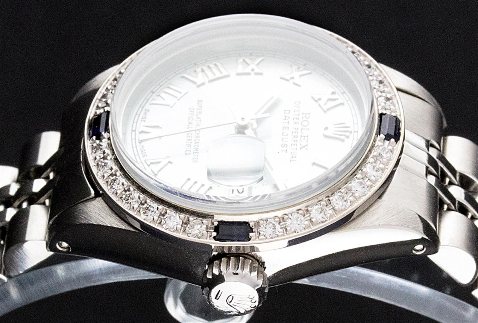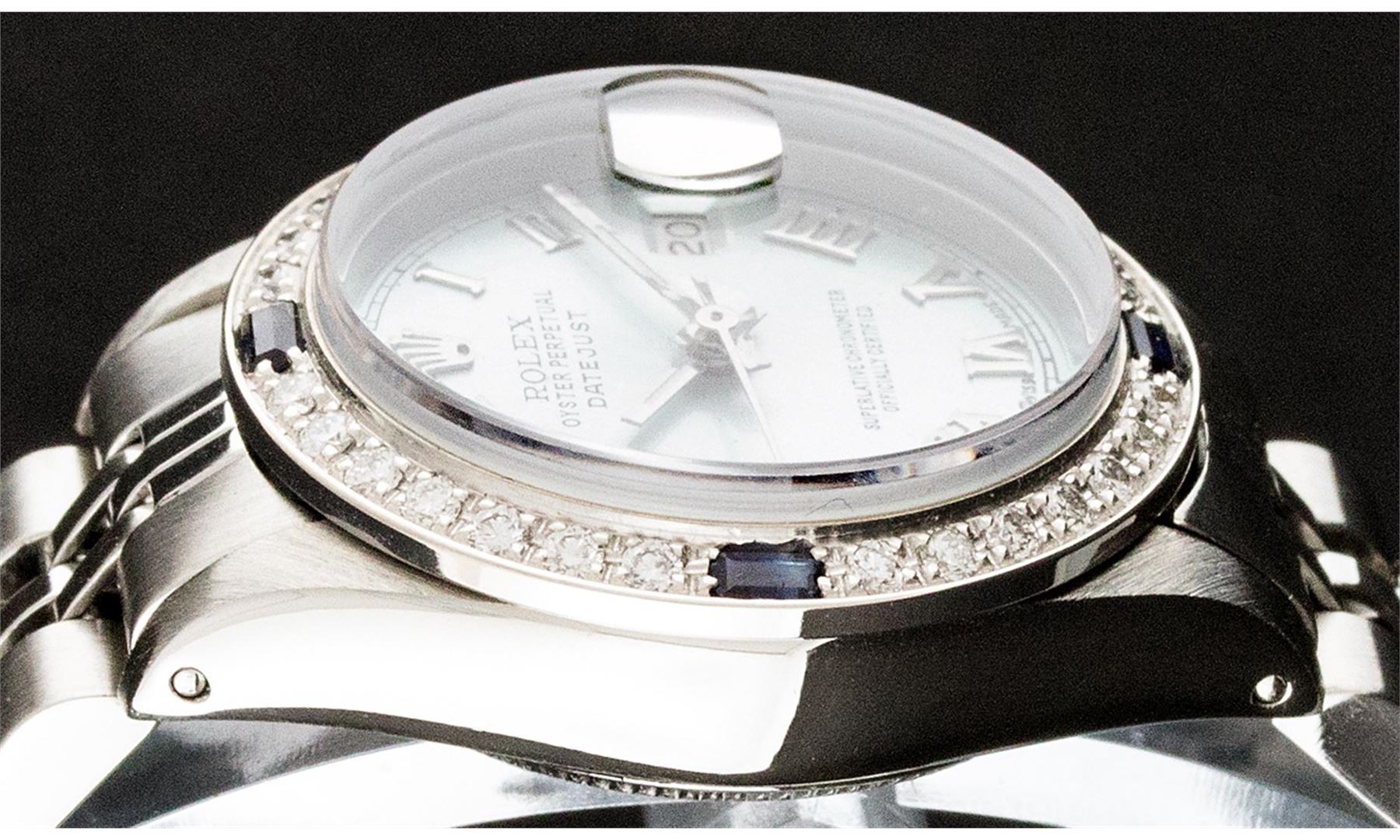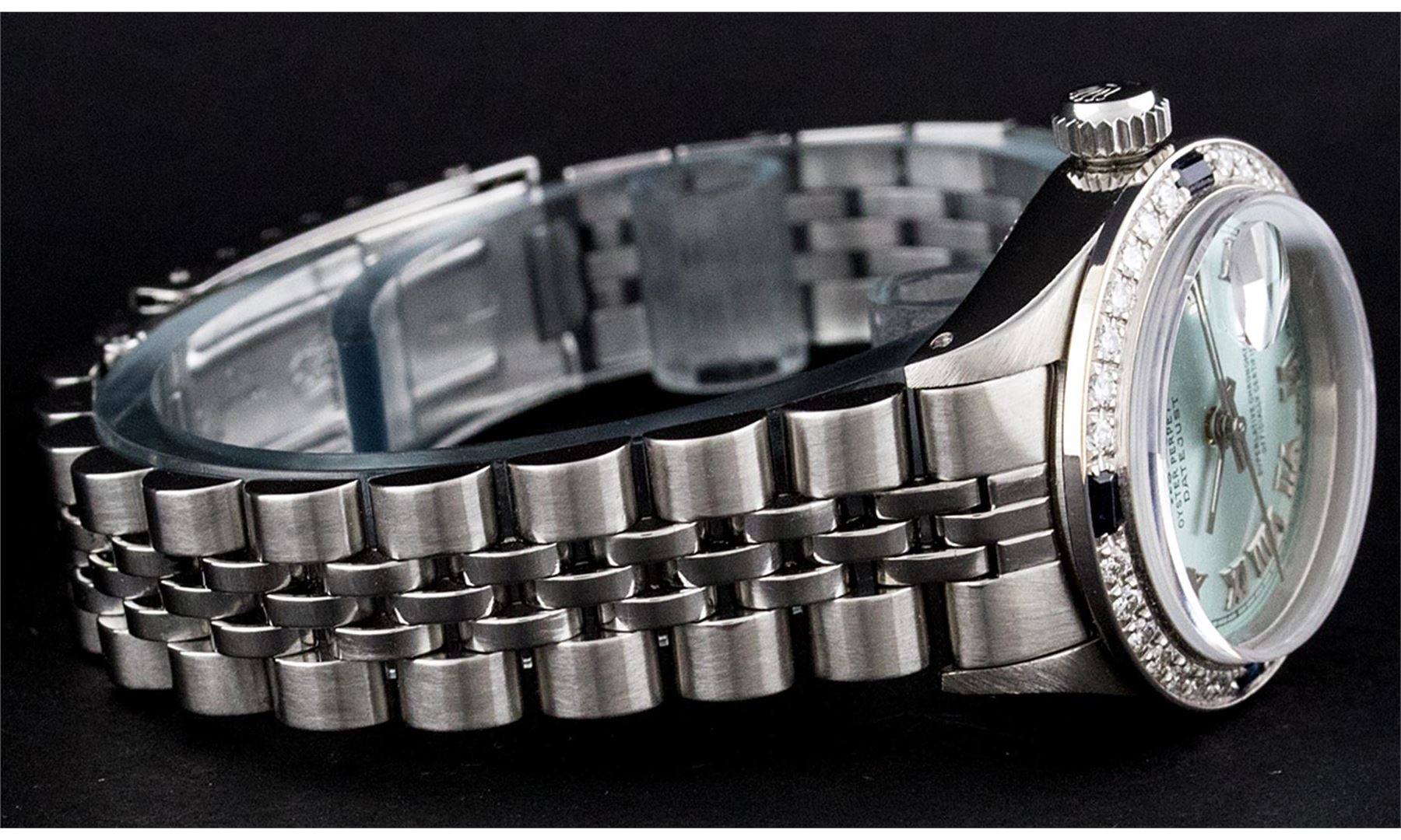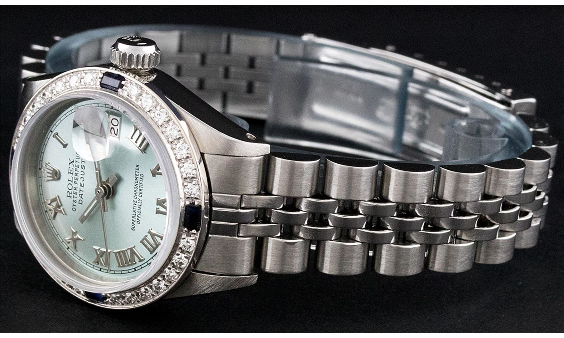 One Ladies Stainless Steel Rolex Datejust Polished Bright with Satin Finish, Serviced & Electronically Tested, Stainless Steel Case: 26mm, Stainless Steel Crown, Custom Bezel: New 18K White Gold Sapphire Beadset Diamond Bezel, Diamond + Gem Count: 28 Diamonds + 4 Sapphires, Total Weight .70 Carat, Clarity: SI-VS, Color: G to H. Custom Crystal: New Scratch Resistant Synthetic Sapphire Cyclops Lens. Custom Hands: New Luminescent Hands. Movement: Automatic Winding Movement. Custom Dial: Ice Blue Roman Dial With Square Track. Date Window: 3 O'Clock Position Date Display, Model: Datejust. Condition: G-6 Extra Fine. Bracelet: Stainless Steel Jubilee. Bright Polish & Satin Finish. 6.0 Inch Length, Adjustable. Standard Clasp, With Rolex Logo. This Watch Has Been Serviced Time Tested And Is In Excellent Condition It Is Free Of All Scratches And Dents.