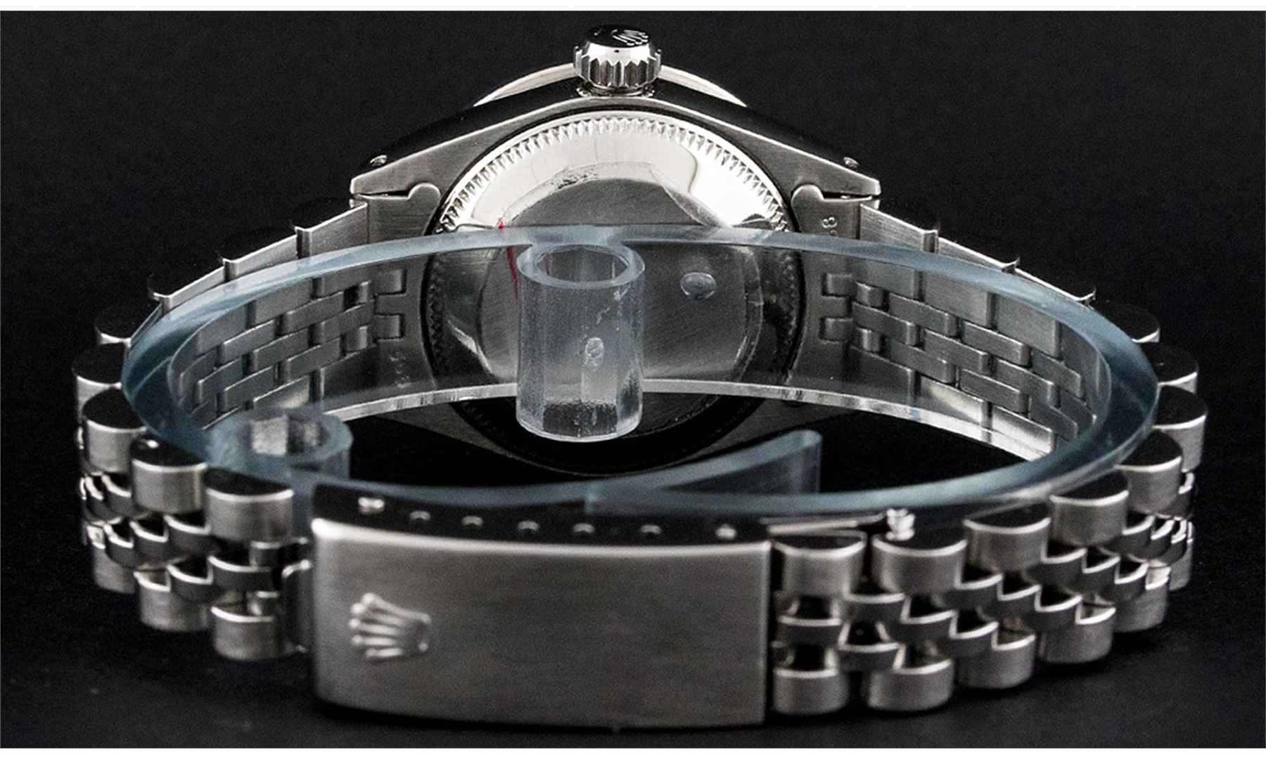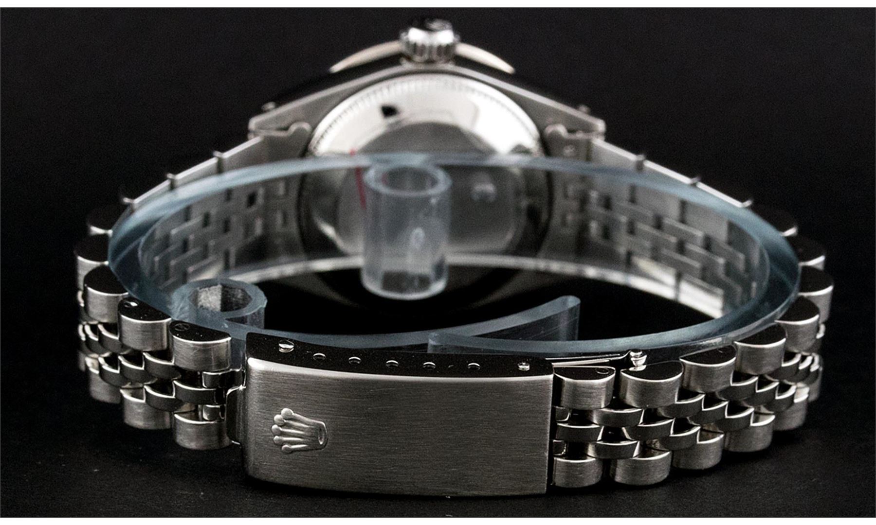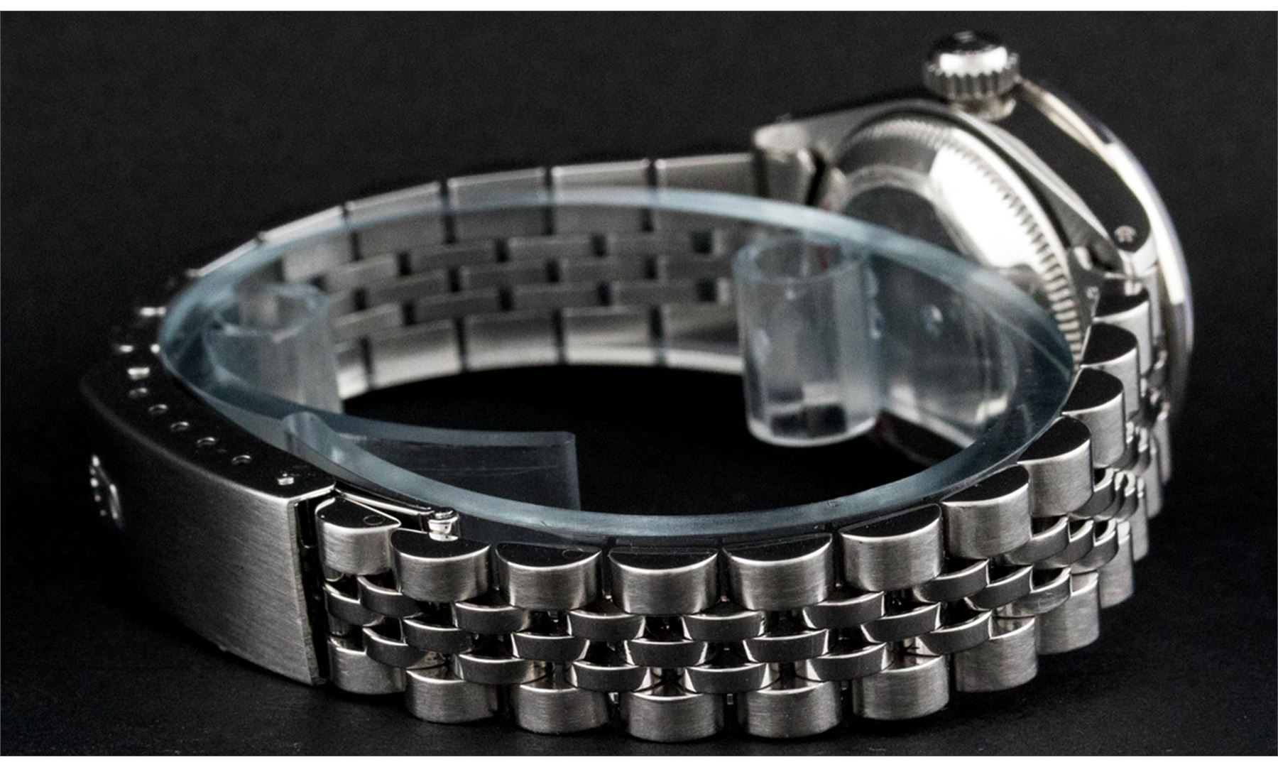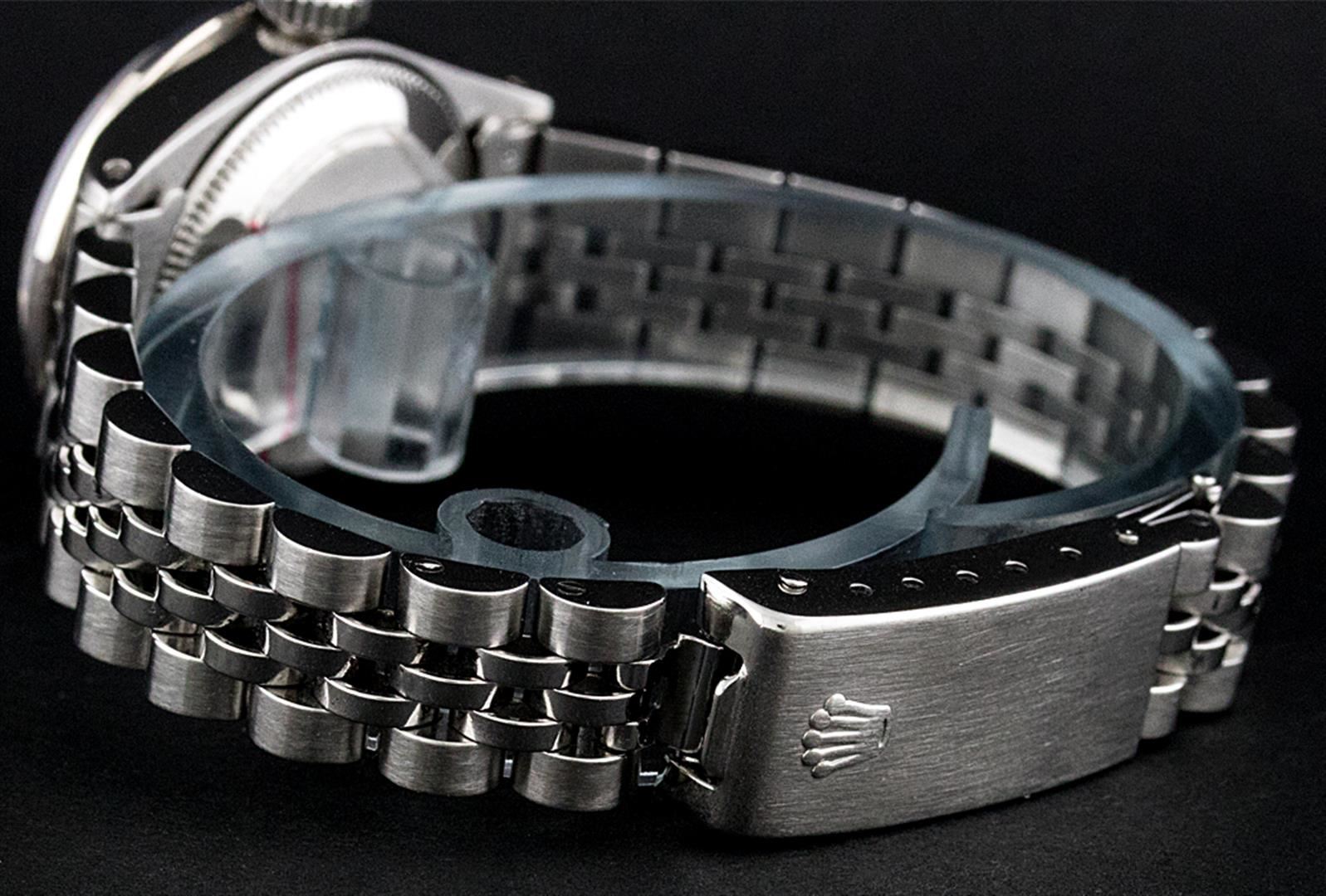 One Ladies Stainless Steel Rolex Datejust Polished Bright with Satin Finish, Serviced & Electronically Tested, Stainless Steel Case: 26mm, Stainless Steel Crown, Custom Bezel: New 18K White Gold Sapphire Beadset Diamond Bezel, Diamond + Gem Count: 28 Diamonds + 4 Sapphires, Total Weight .70 Carat, Clarity: SI-VS, Color: G to H. Custom Crystal: New Scratch Resistant Synthetic Sapphire Cyclops Lens. Custom Hands: New Luminescent Hands. Movement: Automatic Winding Movement. Custom Dial: Ice Blue Roman Dial With Square Track. Date Window: 3 O'Clock Position Date Display, Model: Datejust. Condition: G-6 Extra Fine. Bracelet: Stainless Steel Jubilee. Bright Polish & Satin Finish. 6.0 Inch Length, Adjustable. Standard Clasp, With Rolex Logo. This Watch Has Been Serviced Time Tested And Is In Excellent Condition It Is Free Of All Scratches And Dents.