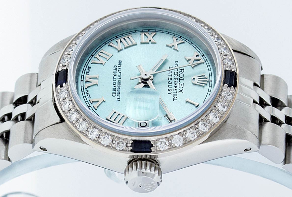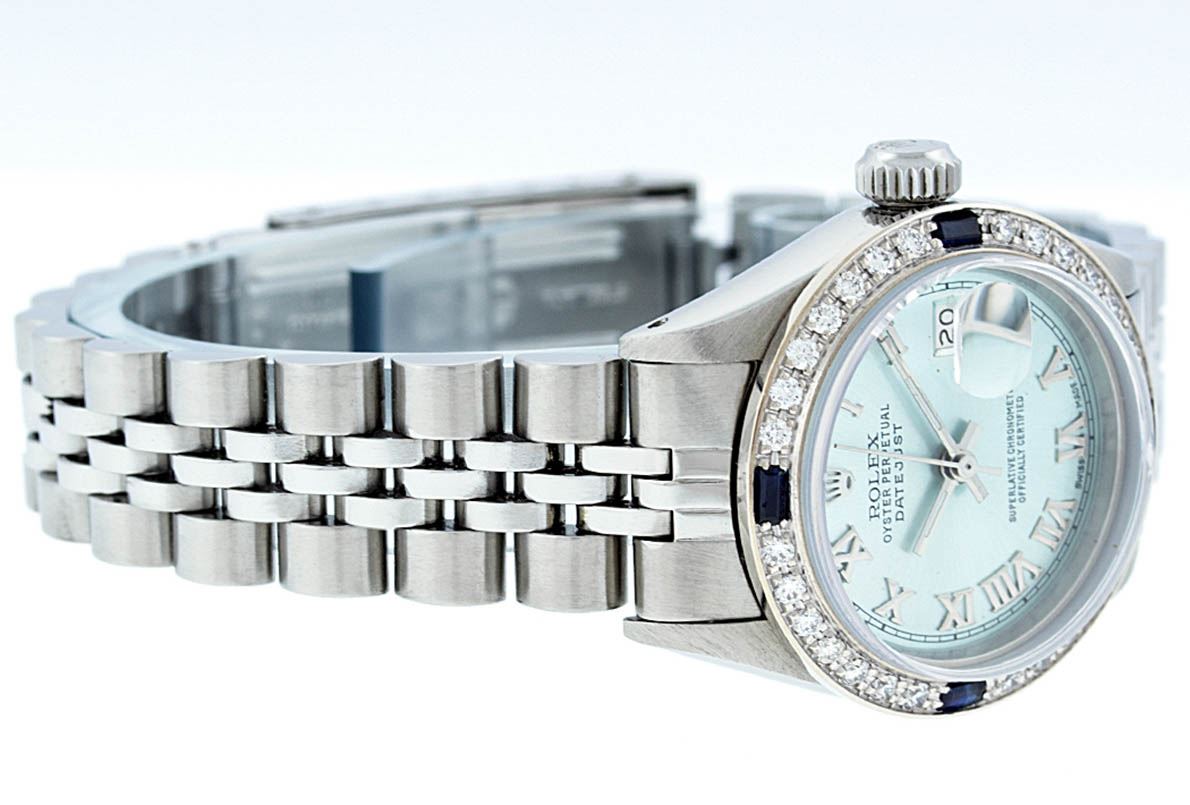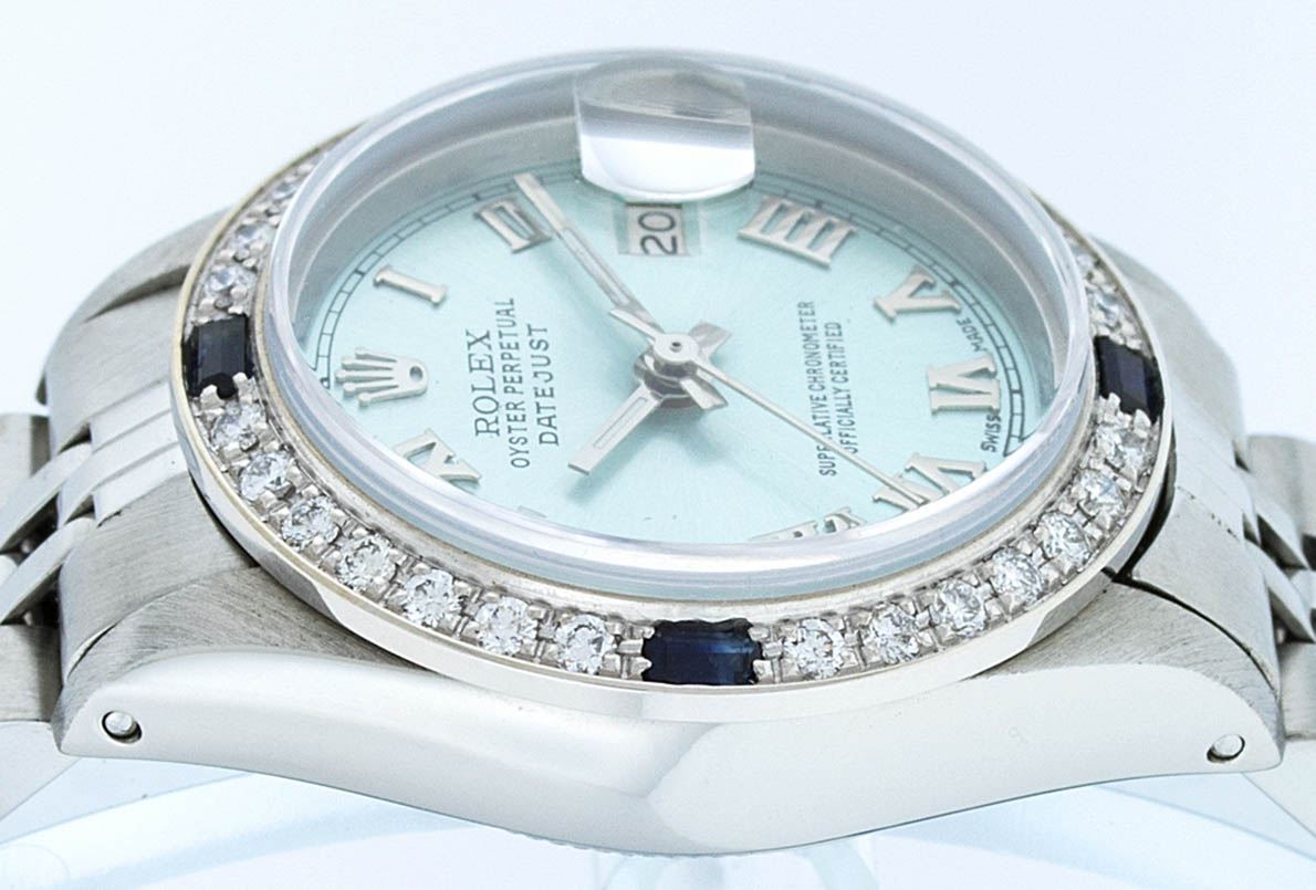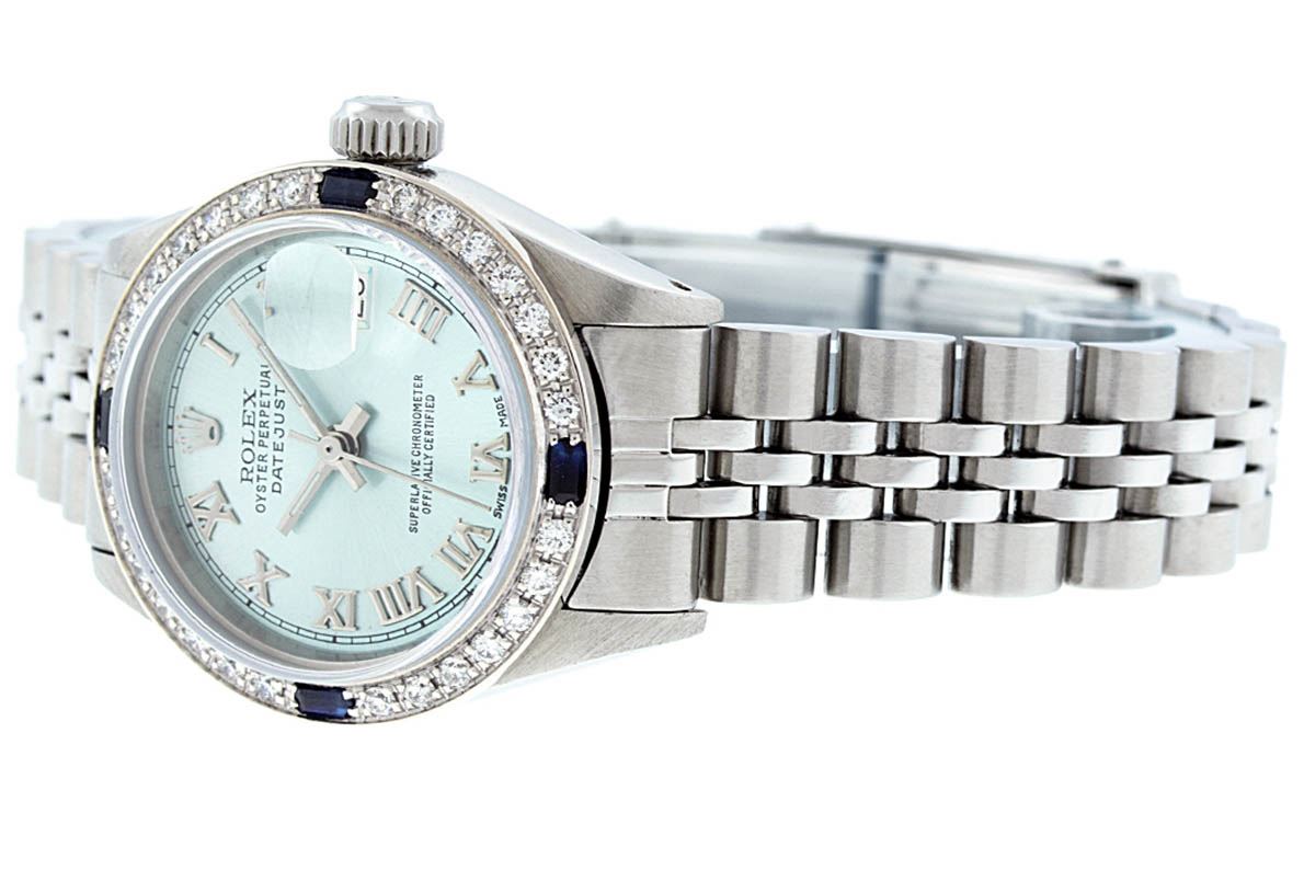One Ladies Stainless Steel Rolex Datejust Polished Bright with Satin Finish, Serviced & Electronically Tested, Stainless Steel Case: 26mm, Stainless Steel Crown, Custom Bezel: New 18K White Gold Sapphire Beadset Diamond Bezel, Diamond + Gem Count: 28 Diamonds + 4 Sapphires, Total Weight .70 Carat, Clarity: SI-VS, Color: G to H. Custom Crystal: New Synthetic Sapphire Cyclops Lens. Custom Hands: New Luminescent Hands. Movement: Automatic Winding Movement. Custom Dial: Ice Blue Roman Dial. Date Window: 3 O'Clock Position Date Display, Model: Datejust. Condition: G-6 Extra Fine. Bracelet: Stainless Steel Jubilee. Bright Polish & Satin Finish. 6.0 Inch Length, Adjustable. Standard Clasp, With Rolex Logo. This Watch Has Been Serviced Time Tested And Is In Excellent Condition It Is Free Of All Scratches And Dents.
