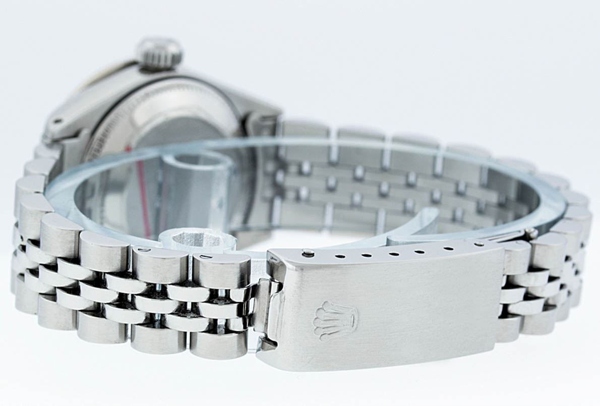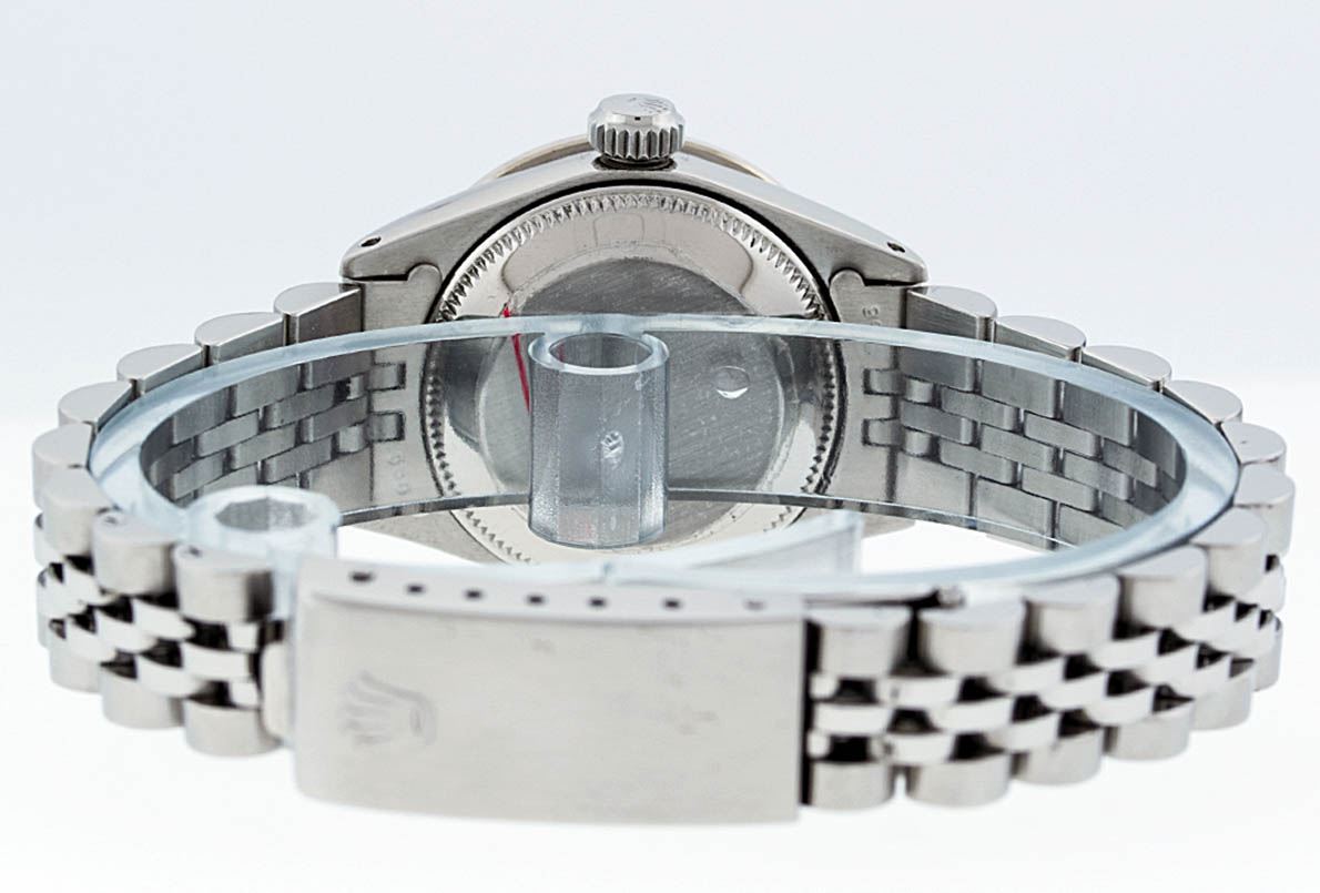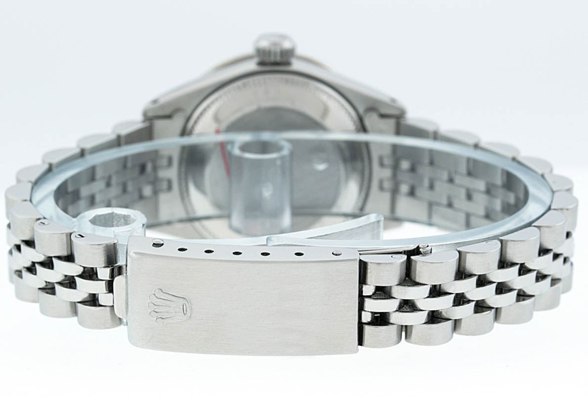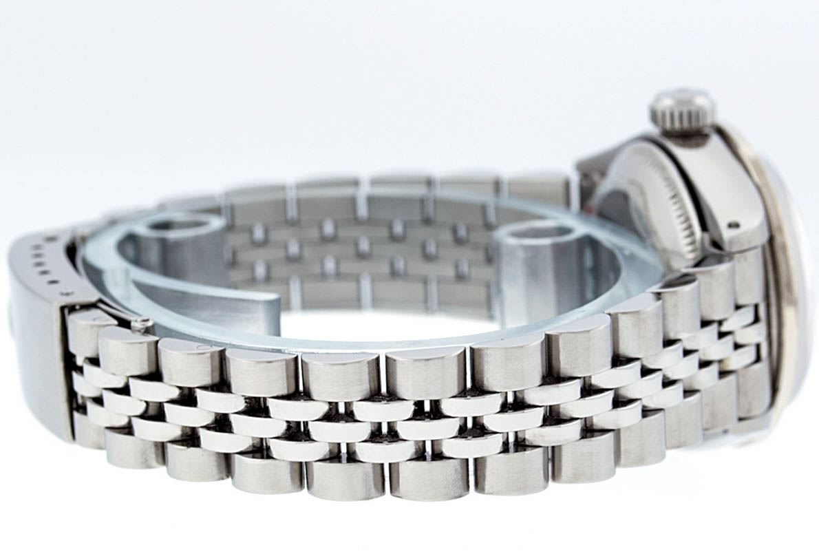 One Ladies Stainless Steel Rolex Datejust Polished Bright with Satin Finish, Serviced & Electronically Tested, Stainless Steel Case: 26mm, Stainless Steel Crown, Custom Bezel: New 18K White Gold Sapphire Beadset Diamond Bezel, Diamond + Gem Count: 28 Diamonds + 4 Sapphires, Total Weight .70 Carat, Clarity: SI-VS, Color: G to H. Custom Crystal: New Synthetic Sapphire Cyclops Lens. Custom Hands: New Luminescent Hands. Movement: Automatic Winding Movement. Custom Dial: Ice Blue Roman Dial. Date Window: 3 O'Clock Position Date Display, Model: Datejust. Condition: G-6 Extra Fine. Bracelet: Stainless Steel Jubilee. Bright Polish & Satin Finish. 6.0 Inch Length, Adjustable. Standard Clasp, With Rolex Logo. This Watch Has Been Serviced Time Tested And Is In Excellent Condition It Is Free Of All Scratches And Dents.