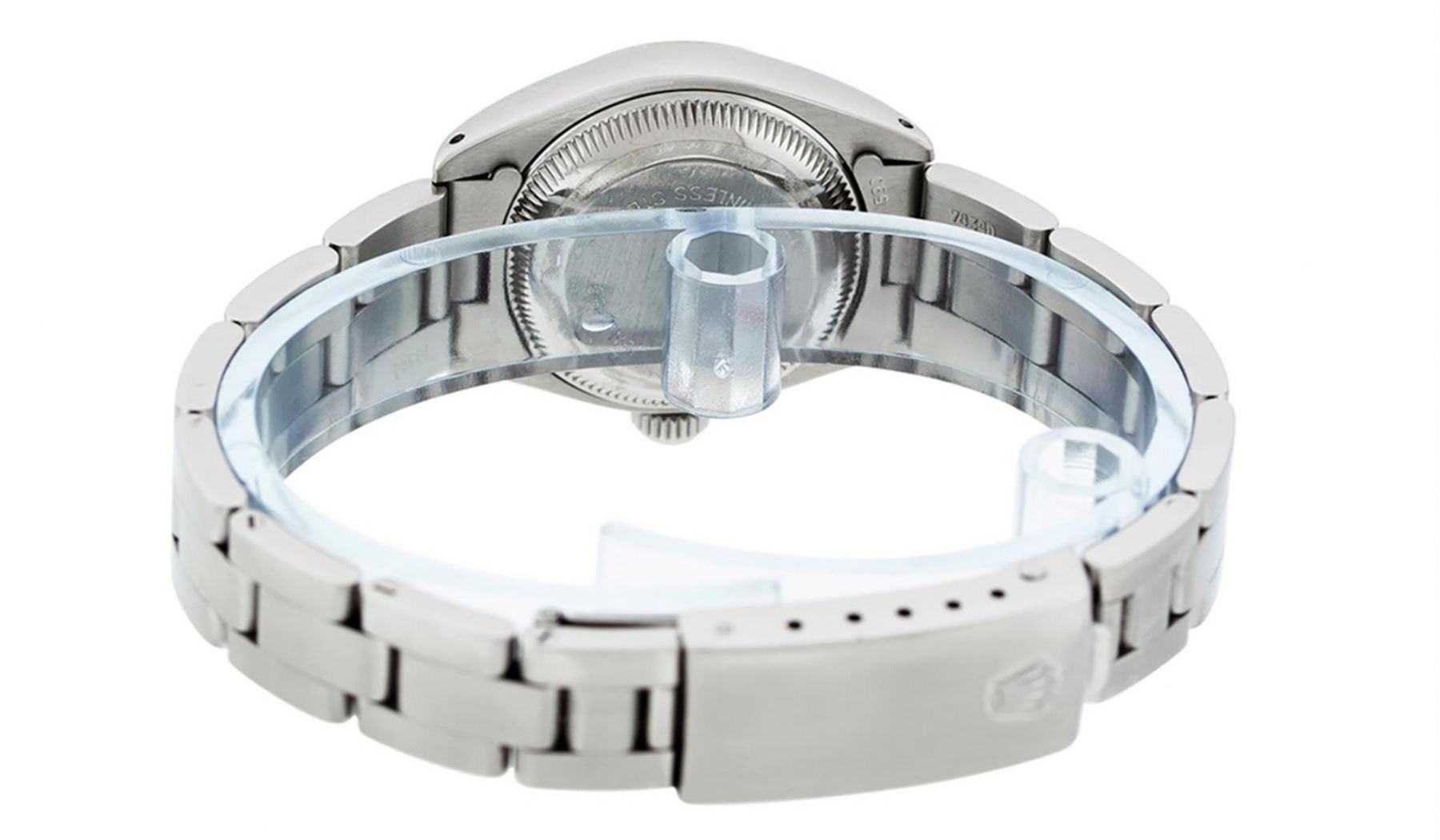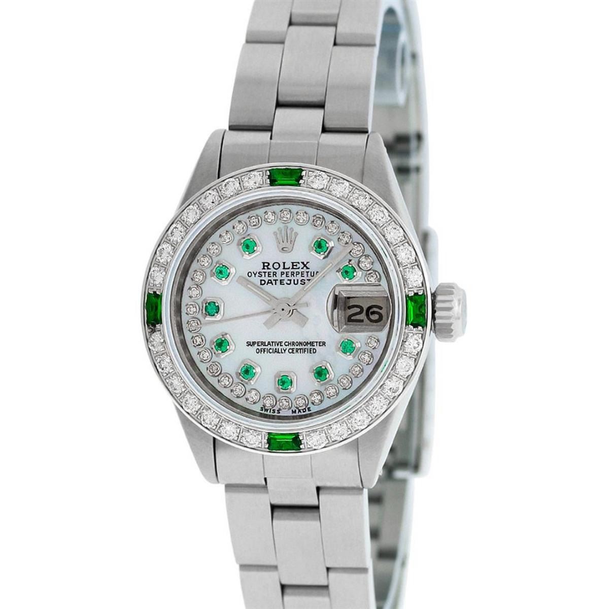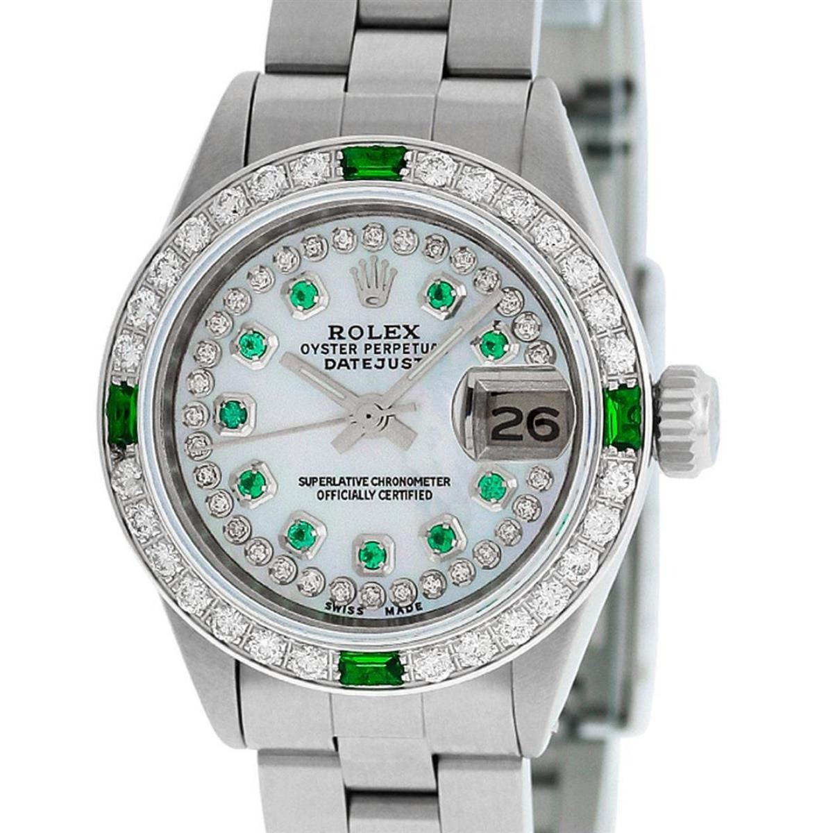 One Ladies Stainless Steel Rolex Datejust Polished Bright with Satin Finish, Serviced & Electronically Tested, Stainless Steel Case: 26mm, Stainless Steel Crown. Custom Bezel: New 18K White Gold Beadset & Synthetic Emerald Diamond Bezel, Diamond Count: 28 Diamonds + 4 Synthetic Emeralds. Total Weight .70 Carat, Clarity: SI-VS, Color: G to H. Custom Crystal: New Synthetic Sapphire Cyclops Lens. Custom Hands: New Luminescent Hands. Movement: Automatic Winding Movement Caliber 2030. Custom Dial: Refinished Mother Of Pearl Emerald String Diamond Dial, Stone Count: 10 Diamonds + 33Emerlads In Dial, G To H In Color, Clarity: SI-VS. Date Window: 3 O'Clock Position Date Display, Model: Datejust. Condition: G-6 Extra Fine. Bracelet: Stainless Steel Oyster. Bright Polish & Satin Finish. 6.0 Inch Length, Adjustable. Standard Clasp, With Rolex Logo. This Watch Has Been Serviced Time Tested And Is In Excellent Condition It Is Free Of All Scratches And Dents.