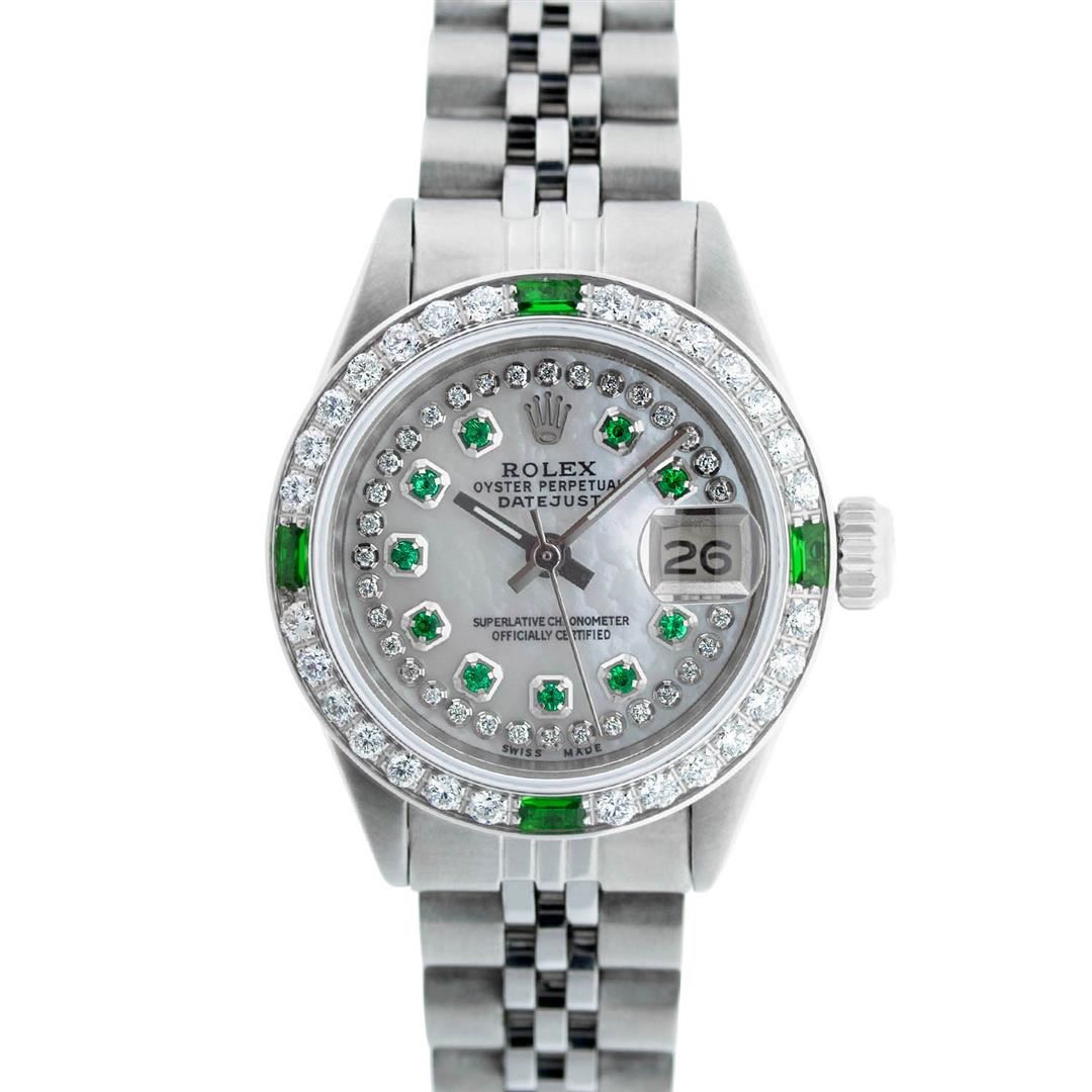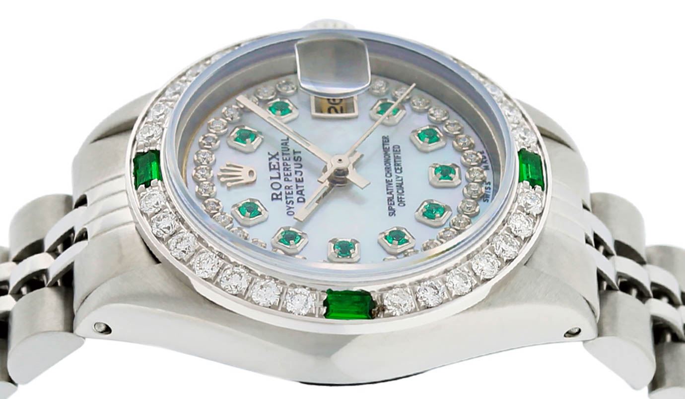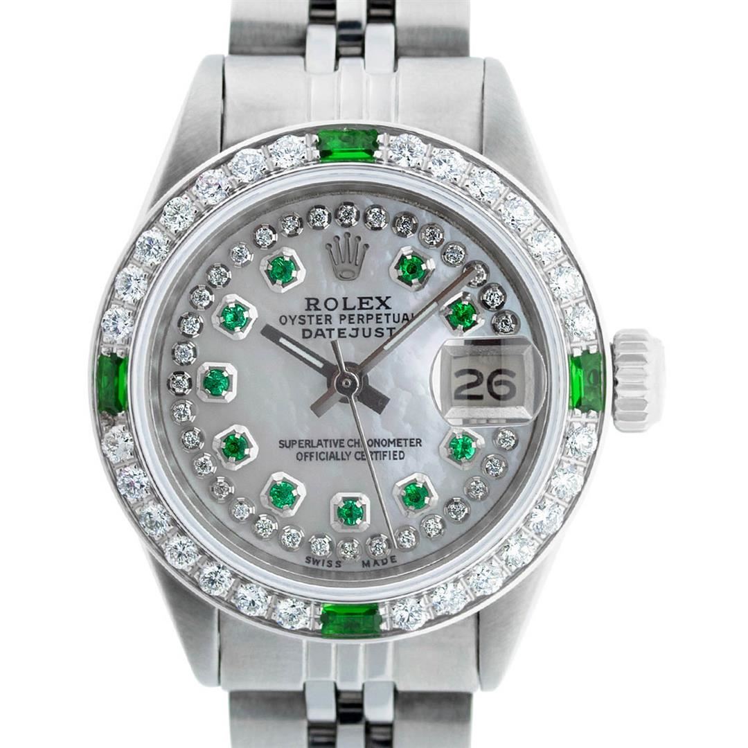 One Ladies Stainless Steel Rolex Datejust Polished Bright with Satin Finish, Serviced & Electronically Tested, Stainless Steel Case: 26mm, Stainless Steel Crown. Custom Bezel: New 18K White Gold Beadset & Emerald Diamond Bezel, Diamond Count: 28 Diamonds + 4 Synthetic Emeralds. Total Weight .70 Carat, Clarity: SI-VS, Color: G to H. Custom Crystal: New Synthetic Sapphire Cyclops Lens. Custom Hands: New Luminescent Hands. Movement: Automatic Winding Movement. Custom Dial: Refinished Mother Of Pearl Emerald String Diamond Dial, Stone Count: 10 Diamonds + 33 Diamonds In Dial, G To H In Color, Clarity: SI-VS. Date Window: 3 O'Clock Position Date Display, Model: Datejust. Condition: G-6 Extra Fine. Bracelet: Stainless Steel Jubilee. Bright Polish & Satin Finish. 6.0 Inch Length, Adjustable. Standard Clasp, With Rolex Logo. This Watch Has Been Serviced Time Tested And Is In Excellent Condition It Is Free Of All Scratches And Dents.