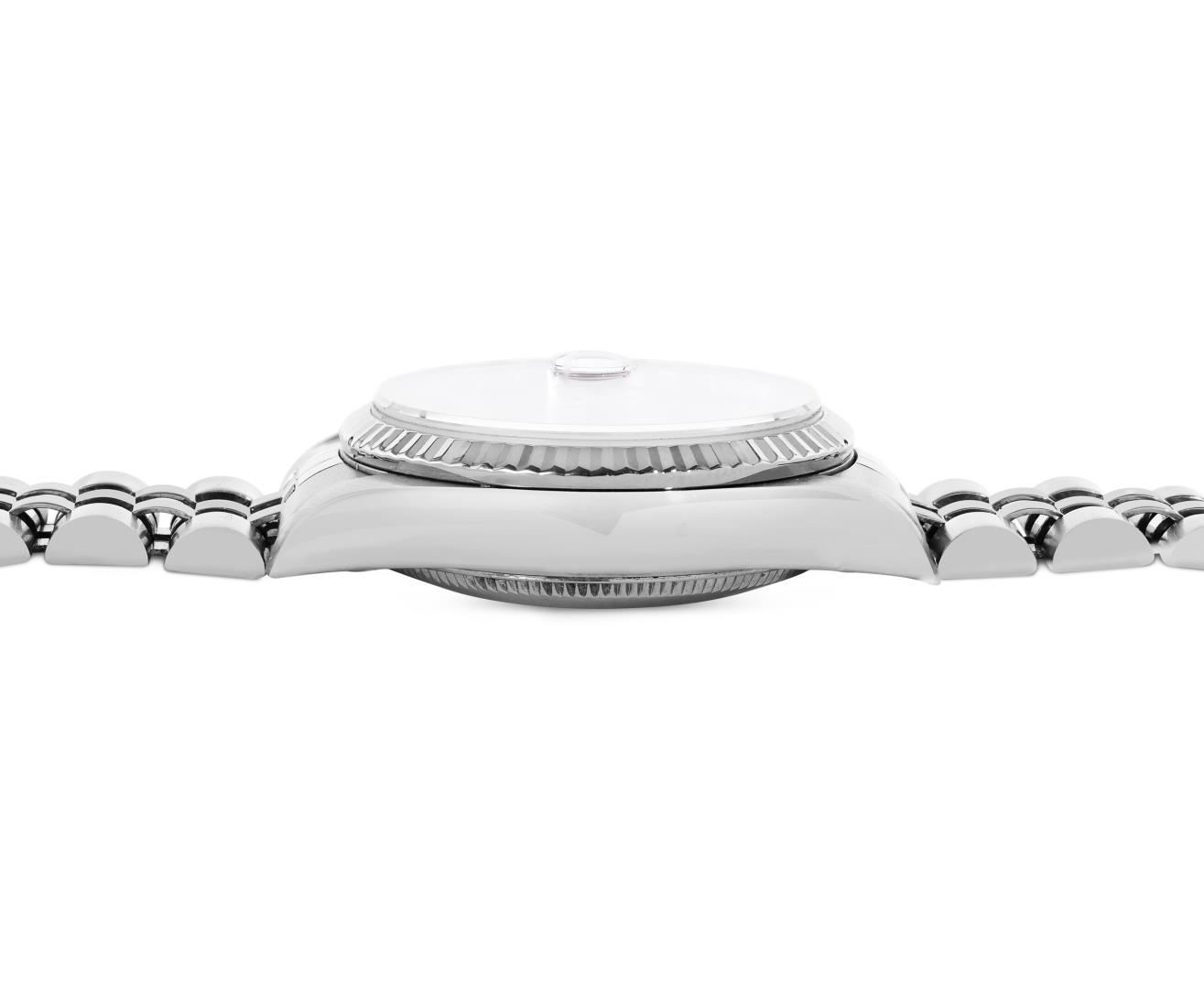 One Rolex Ladies Midsize Pre Owned Stainless Steel Datejust Wristwatch Polished with Satin Finish, Serviced And Electronically Tested, Stainless Steel Case: 31mm, Stainless Steel Crown, Bezel: 18K White Gold Fluted Bezel. Crystal: Sapphire With Magnifying Date Window. Hands: Solid Hands. Rolex Movement: Automatic Winding Movement 2235. Rolex Factory Dial: Cream Dial With Arabic Hour Markers. Date Window: 3 O'Clock Position Date Display, Model: Quickset Datejust. Condition: G-6 Extra Fine. Rolex Bracelet: Stainless Steel Jubilee Band. Bright Polish And Satin Finish. 6.0 Inch Length, Adjustable. Standard Clasp, With Rolex Logo. This Watch Has Been Serviced Time Tested And Is In Excellent Condition It Is Free Of All Scratches And Dents. This Watch Comes With A Rolex Box.