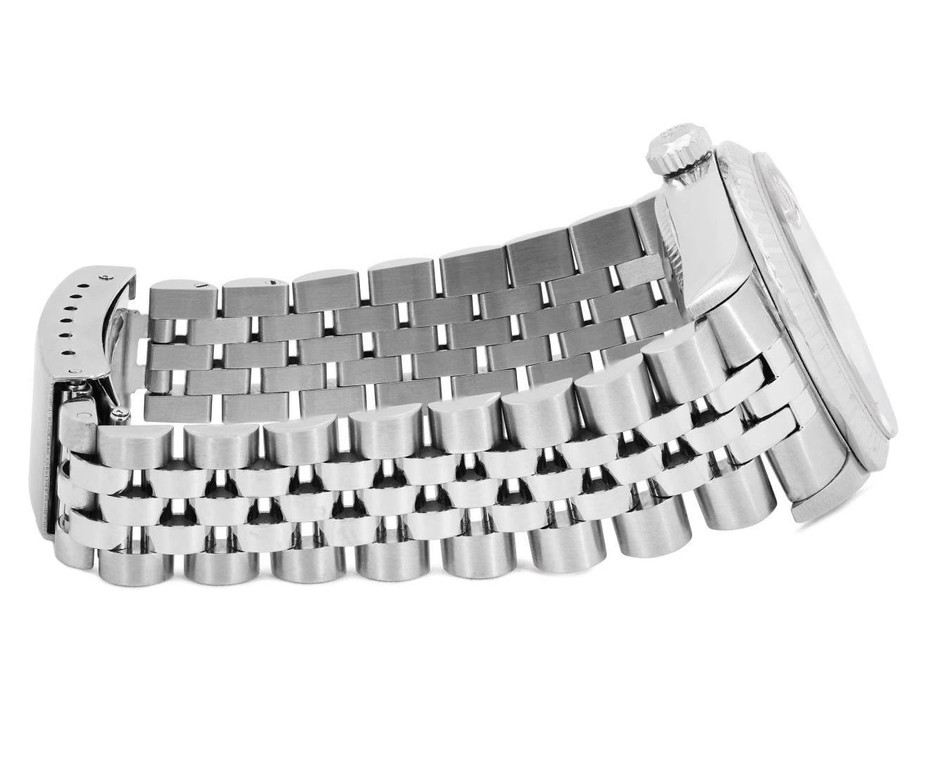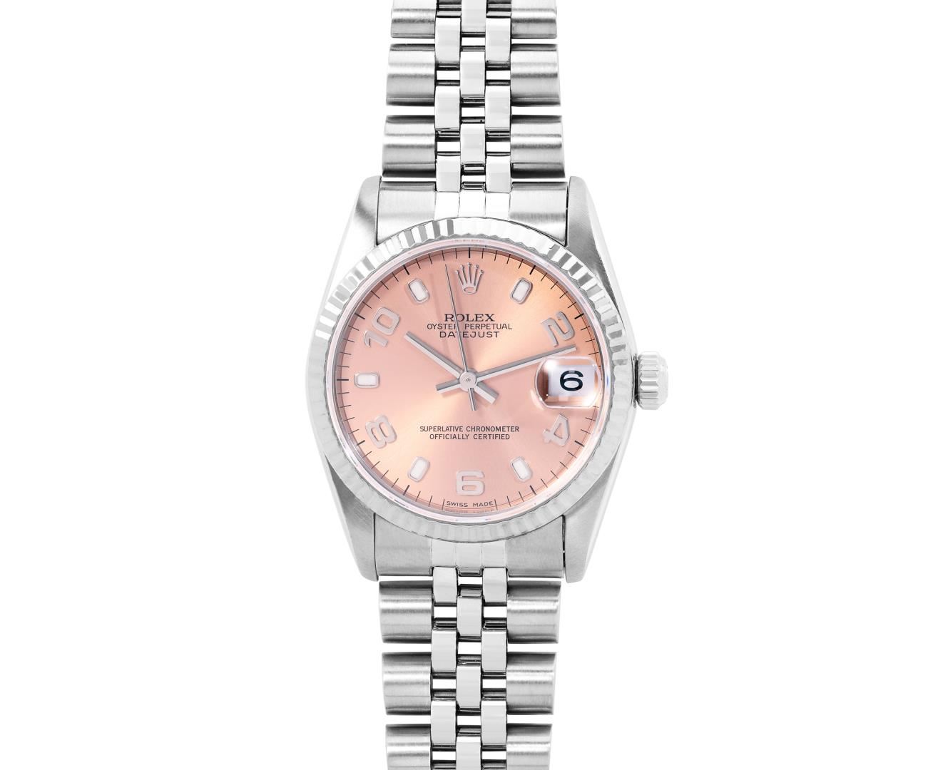 One Rolex Ladies Midsize Pre Owned Stainless Steel Datejust Wristwatch Polished with Satin Finish, Serviced And Electronically Tested, Stainless Steel Case: 31mm, Stainless Steel Crown, Bezel: 18K White Gold Fluted Bezel. Crystal: Sapphire With Magnifying Date Window. Hands: Solid Hands. Rolex Movement: Automatic Winding Movement 2235. Rolex Factory Dial: Salmon Dial With Arabic Hour Markers. Date Window: 3 O'Clock Position Date Display, Model: Quickset Datejust. Condition: G-6 Extra Fine. Rolex Bracelet: Stainless Steel Jubilee Band. Bright Polish And Satin Finish. 6.0 Inch Length, Adjustable. Standard Clasp, With Rolex Logo. This Watch Has Been Serviced Time Tested And Is In Excellent Condition It Is Free Of All Scratches And Dents. This Watch Comes With A Rolex Box.
