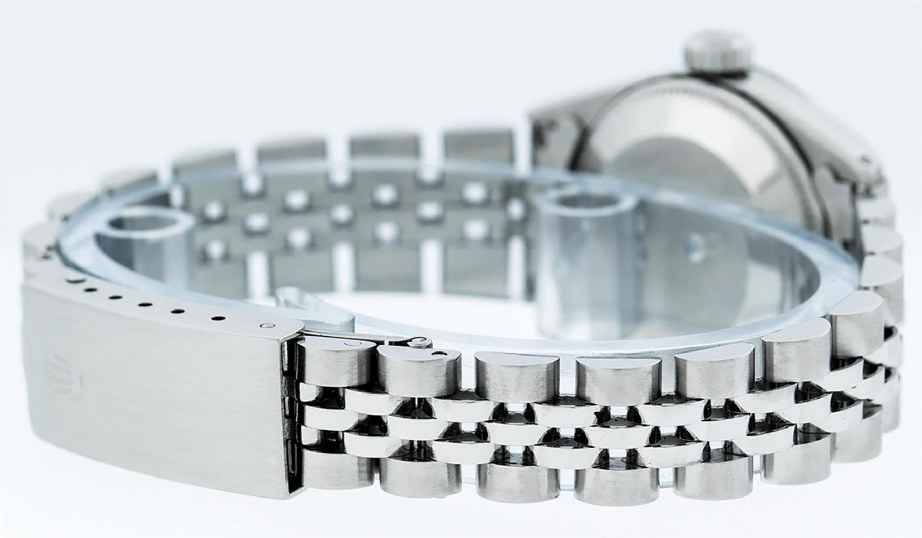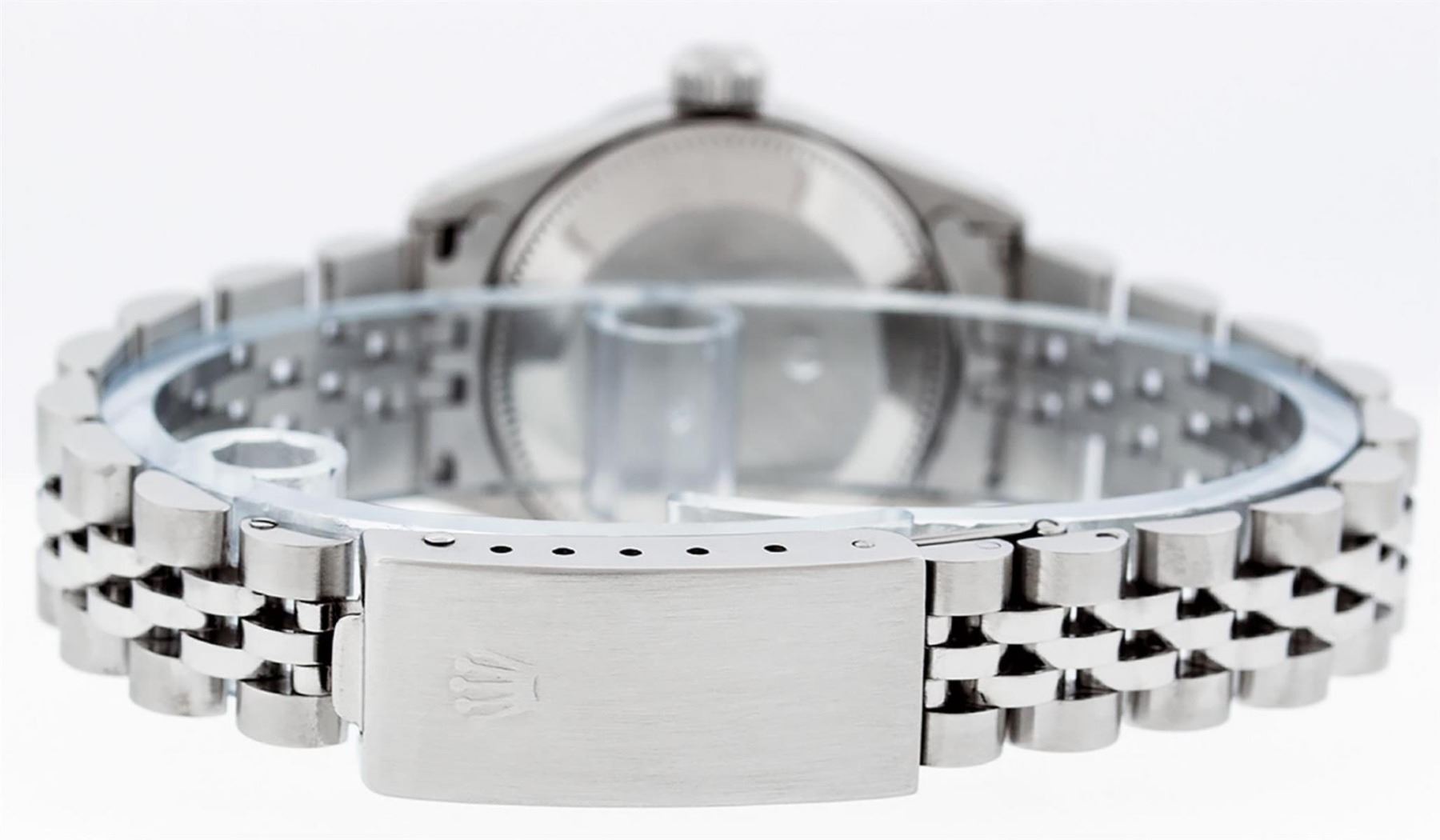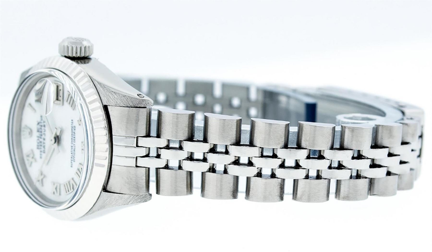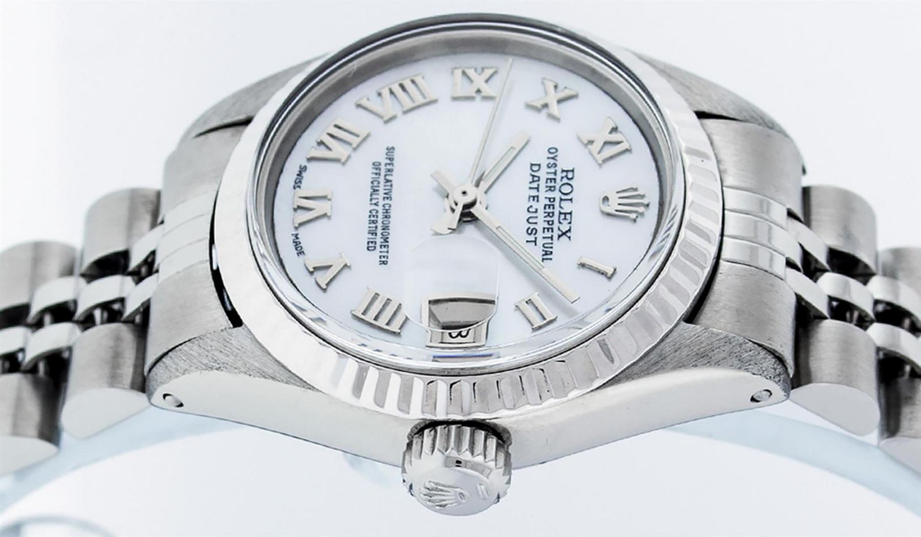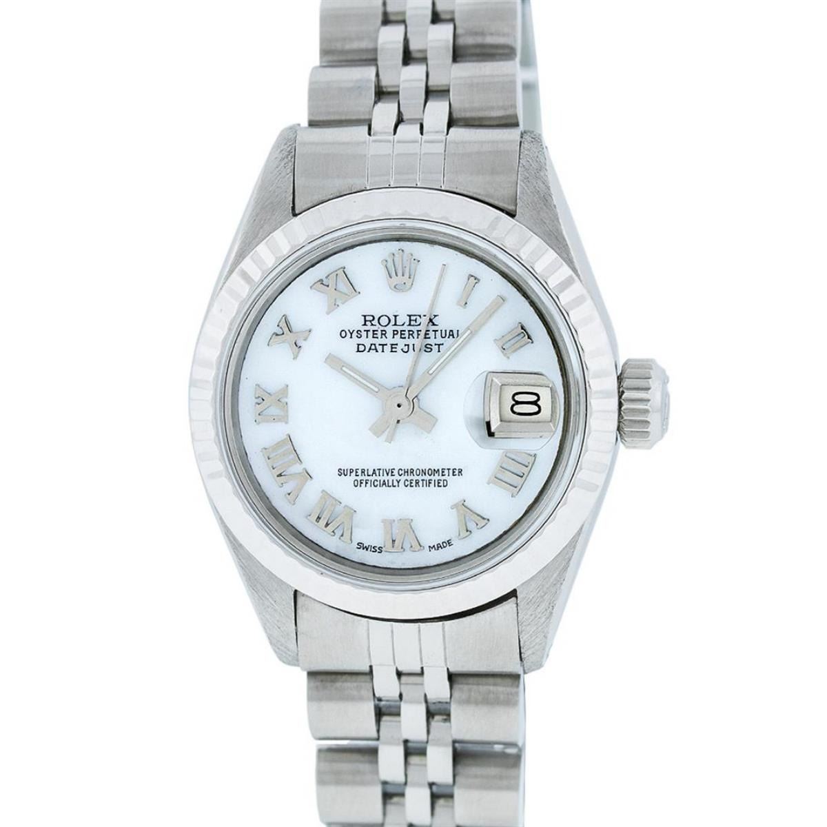 One Ladies Stainless Steel Rolex Datejust Polished Bright with Satin Finish, Serviced & Electronically Tested, Stainless Steel Case: 26mm, Stainless Steel Crown, Bezel: 14K White Gold Bezel. Custom Crystal: New Acrylic Cyclops Lens. Custom Hands: New Luminescent Hands. Movement: Automatic Winding Movement Caliber 2030. Custom Dial: Refinished Mother Of Pearl Roman Dial. Date Window: 3 O'Clock Position Date Display, Model: Datejust. Condition: G-6 Extra Fine. Bracelet: Stainless Steel Jubilee Band. Bright Polish & Satin Finish. 6.0 Inch Length, Adjustable. Standard Clasp, With Rolex Logo. This Watch Has Been Serviced Time Tested And Is In Excellent Condition It Is Free Of All Scratches And Dents.