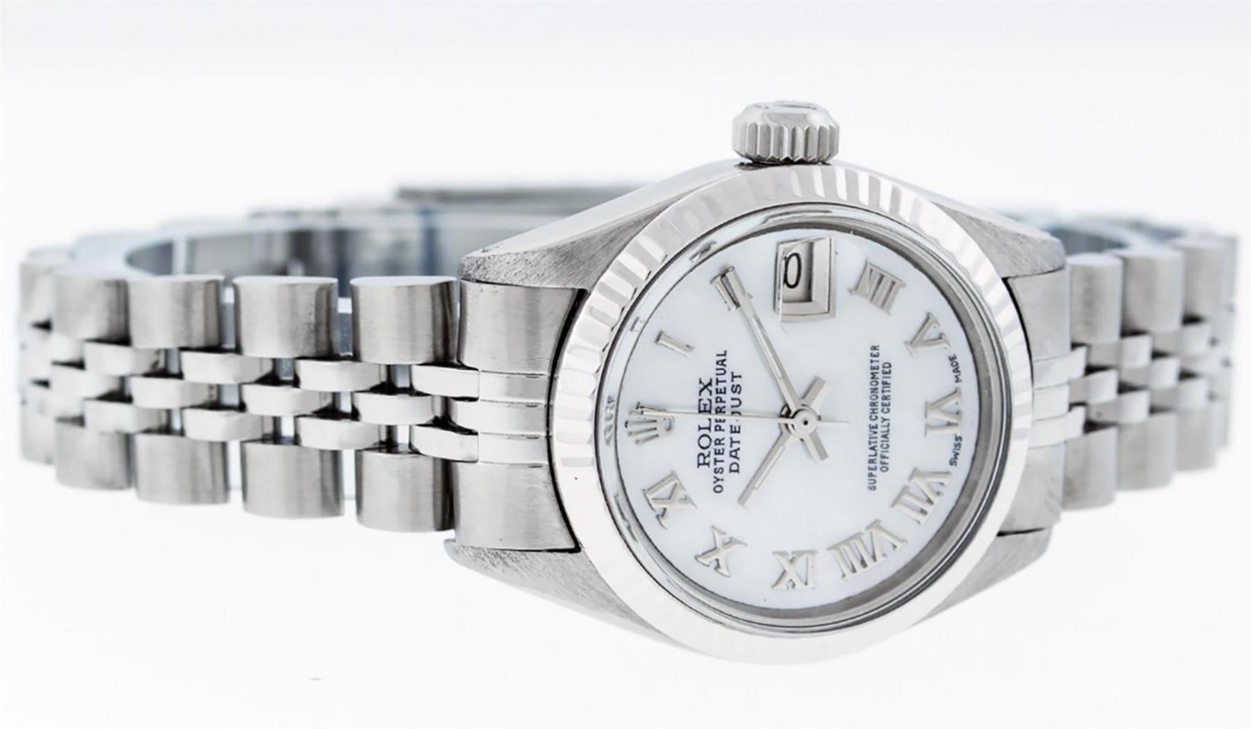 One Ladies Stainless Steel Rolex Datejust Polished Bright with Satin Finish, Serviced & Electronically Tested, Stainless Steel Case: 26mm, Stainless Steel Crown, Bezel: 14K White Gold Bezel. Custom Crystal: New Acrylic Cyclops Lens. Custom Hands: New Luminescent Hands. Movement: Automatic Winding Movement. Custom Dial: Refinished Mother Of Pearl Roman Dial. Date Window: 3 O'Clock Position Date Display, Model: Datejust. Condition: G-6 Extra Fine. Bracelet: Stainless Steel Jubilee Band. Bright Polish & Satin Finish. 6.0 Inch Length, Adjustable. Standard Clasp, With Rolex Logo. This Watch Has Been Serviced Time Tested And Is In Excellent Condition It Is Free Of All Scratches And Dents.