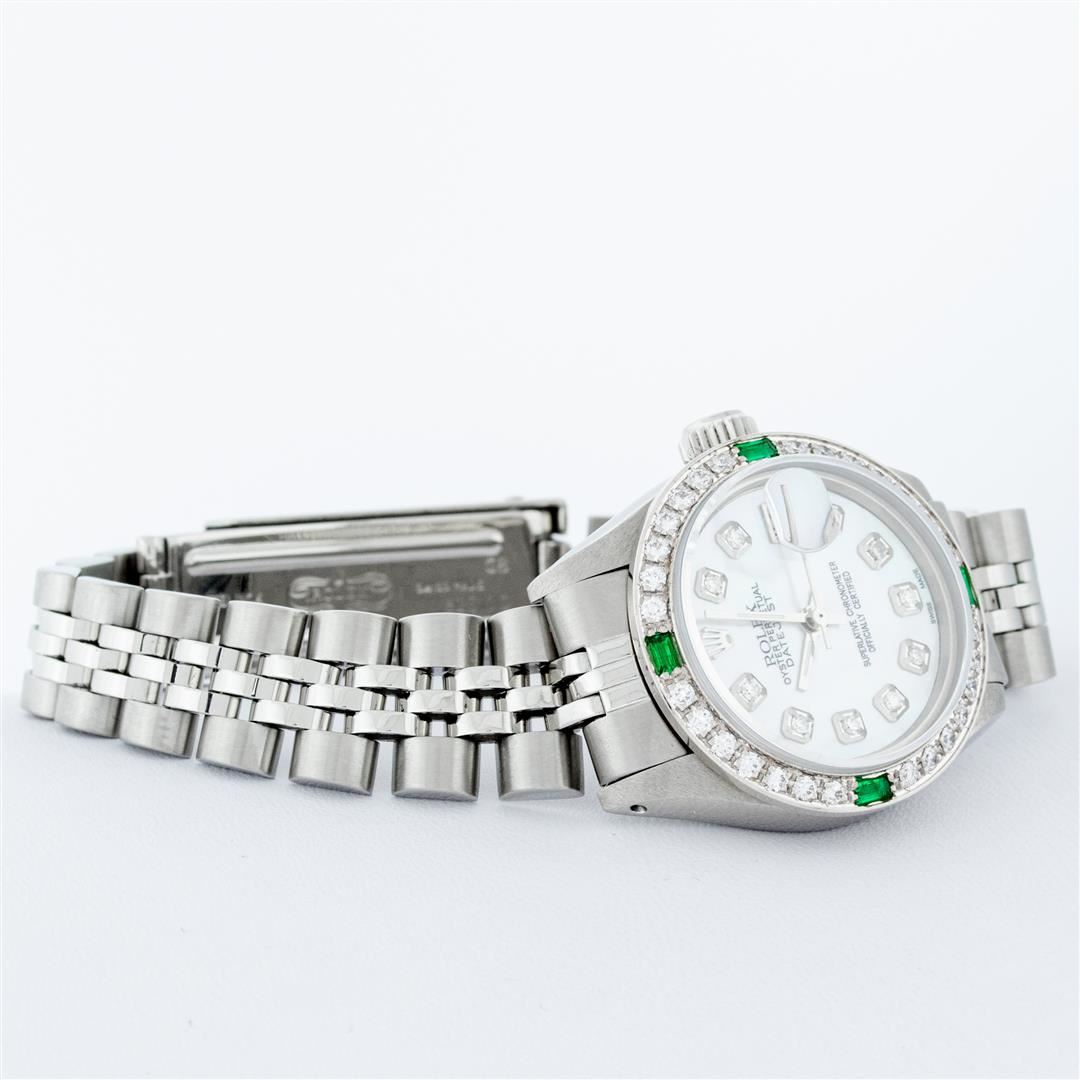 One Ladies Stainless Steel Rolex Datejust Polished Bright with Satin Finish, Serviced & Electronically Tested, Stainless Steel Case: 26mm, Stainless Steel Crown, Custom Bezel: New 18K White Gold Synthetic Emerald Beadset Diamond Bezel, Diamond + Gem Count: 28 Diamonds + 4 Synthetic Emeralds. Total Weight .70 Carat, Clarity: SI-VS, Color: G to H. Custom Crystal: New Synthetic Sapphire Cyclops Lens. Custom Hands: New Luminescent Hands. Movement: Automatic Winding Movement . Custom Dial: Refinished Mother Of Pearl With Diamond Hour Markers, 10 Diamond in Dial G To H In Color, Clarity: SI-VS. Date Window: 3 O'Clock Position Date Display, Model: Datejust. Condition: G-6 Extra Fine. Bracelet: Stainless Steel Jubilee. Bright Polish & Satin Finish. 6.0 Inch Length, Adjustable. Standard Clasp, With Rolex Logo. This Watch Has Been Serviced Time Tested And Is In Excellent Condition It Is Free Of All Scratches And Dents.