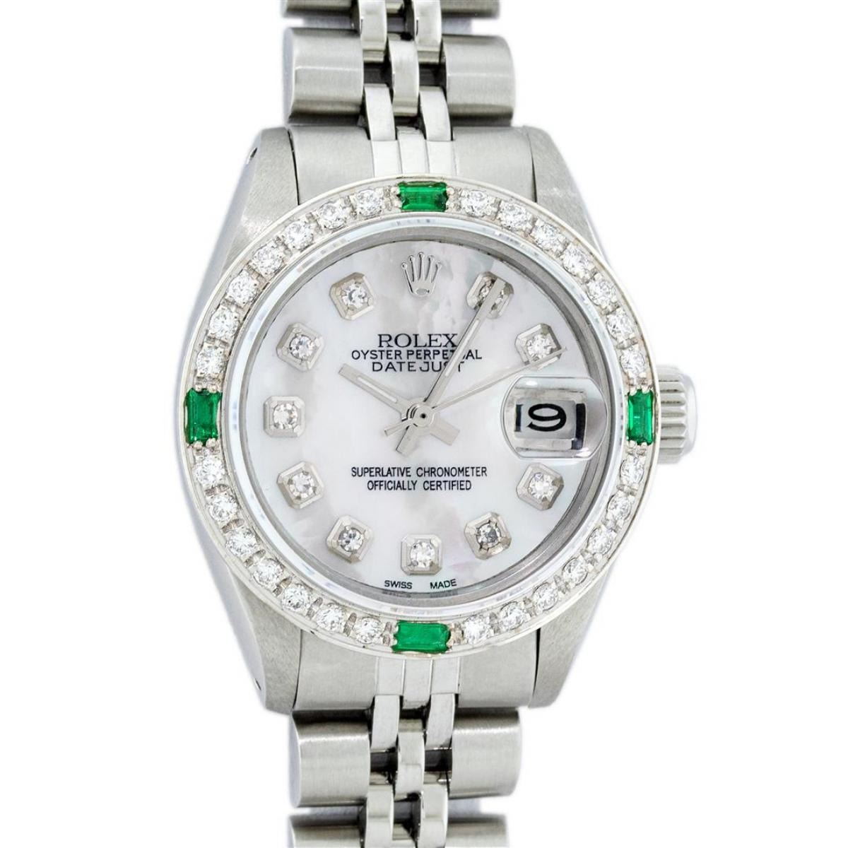 One Ladies Stainless Steel Rolex Datejust Polished Bright with Satin Finish, Serviced & Electronically Tested, Stainless Steel Case: 26mm, Stainless Steel Crown, Custom Bezel: New 18K White Gold Synthetic Emerald Beadset Diamond Bezel, Diamond + Gem Count: 28 Diamonds + 4 Synthetic Emeralds. Total Weight .70 Carat, Clarity: SI-VS, Color: G to H. Custom Crystal: New Synthetic Sapphire Cyclops Lens. Custom Hands: New Luminescent Hands. Movement: Automatic Winding Movement . Custom Dial: Refinished Mother Of Pearl With Diamond Hour Markers, 10 Diamond in Dial G To H In Color, Clarity: SI-VS. Date Window: 3 O'Clock Position Date Display, Model: Datejust. Condition: G-6 Extra Fine. Bracelet: Stainless Steel Jubilee. Bright Polish & Satin Finish. 6.0 Inch Length, Adjustable. Standard Clasp, With Rolex Logo. This Watch Has Been Serviced Time Tested And Is In Excellent Condition It Is Free Of All Scratches And Dents.
