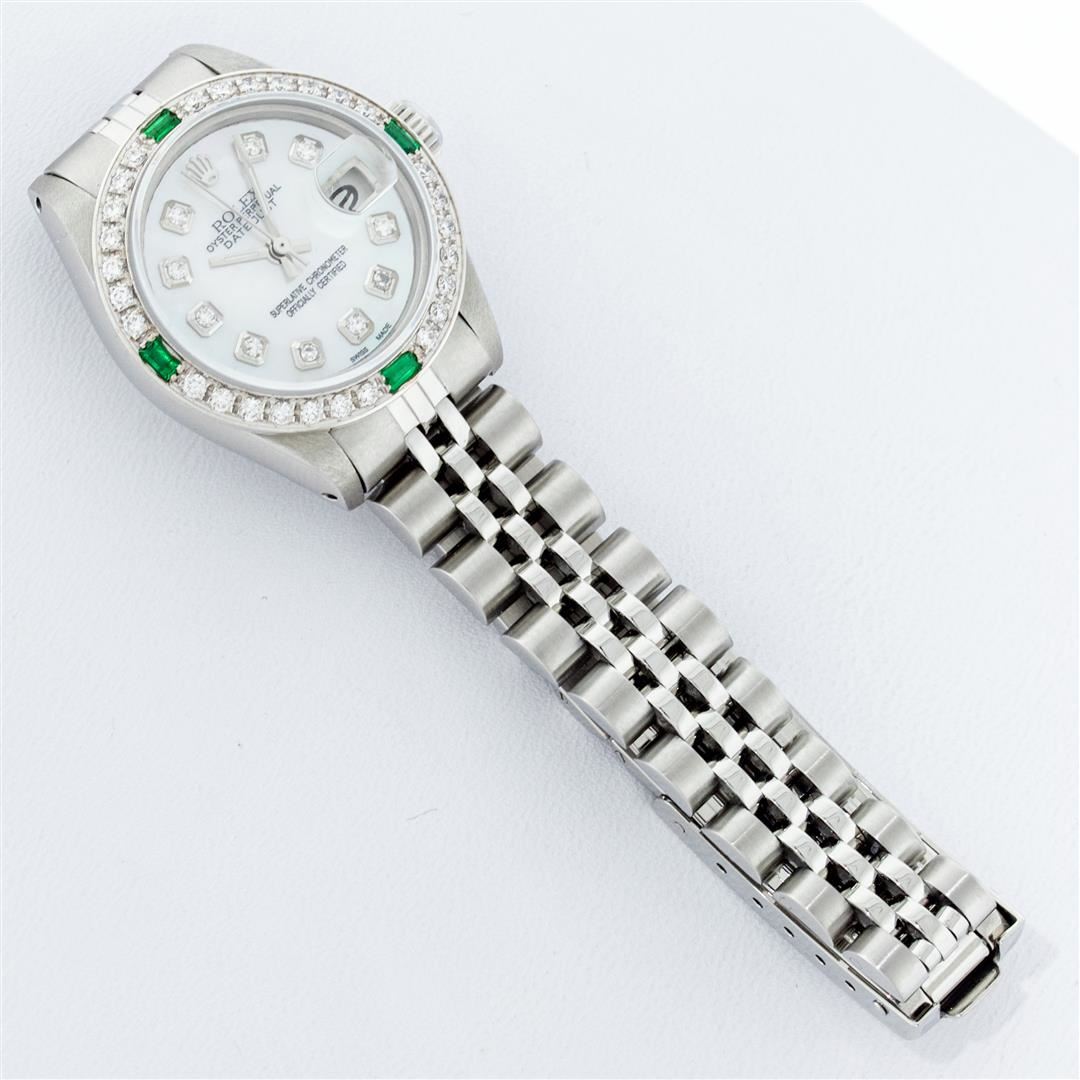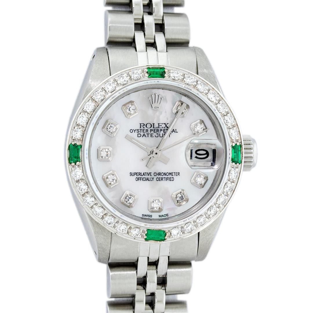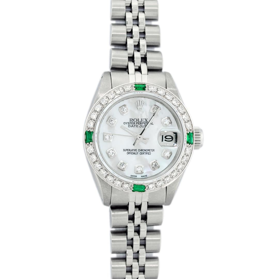 One Ladies Stainless Steel Rolex Datejust Polished Bright with Satin Finish, Serviced & Electronically Tested, Stainless Steel Case: 26mm, Stainless Steel Crown, Custom Bezel: New 18K White Gold Synthetic Emerald Beadset Diamond Bezel, Diamond + Gem Count: 28 Diamonds + 4 Synthetic Emeralds. Total Weight .70 Carat, Clarity: SI-VS, Color: G to H. Custom Crystal: New Synthetic Sapphire Cyclops Lens. Custom Hands: New Luminescent Hands. Movement: Automatic Winding Movement . Custom Dial: Refinished Mother Of Pearl With Diamond Hour Markers, 10 Diamond in Dial G To H In Color, Clarity: SI-VS. Date Window: 3 O'Clock Position Date Display, Model: Datejust. Condition: G-6 Extra Fine. Bracelet: Stainless Steel Jubilee. Bright Polish & Satin Finish. 6.0 Inch Length, Adjustable. Standard Clasp, With Rolex Logo. This Watch Has Been Serviced Time Tested And Is In Excellent Condition It Is Free Of All Scratches And Dents.