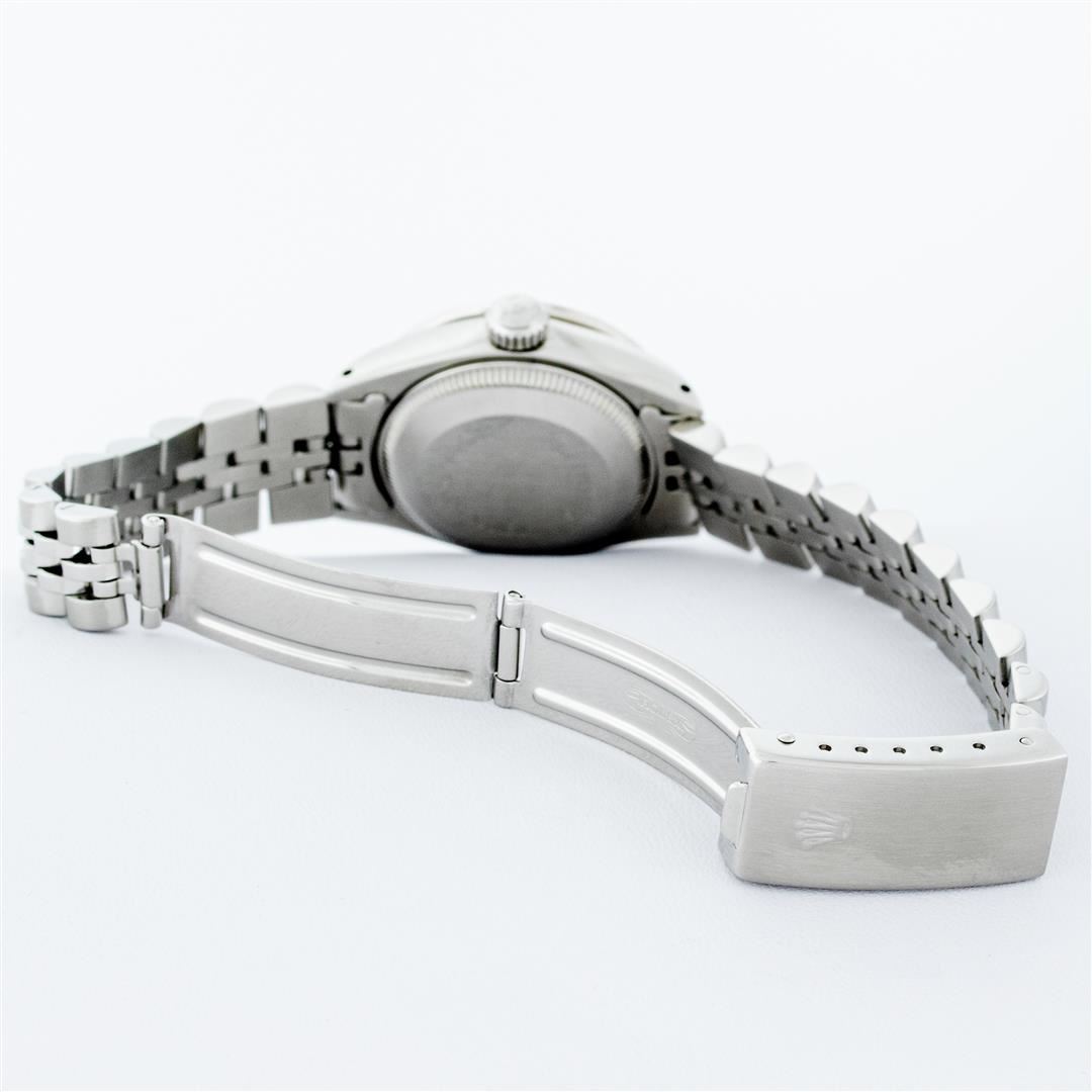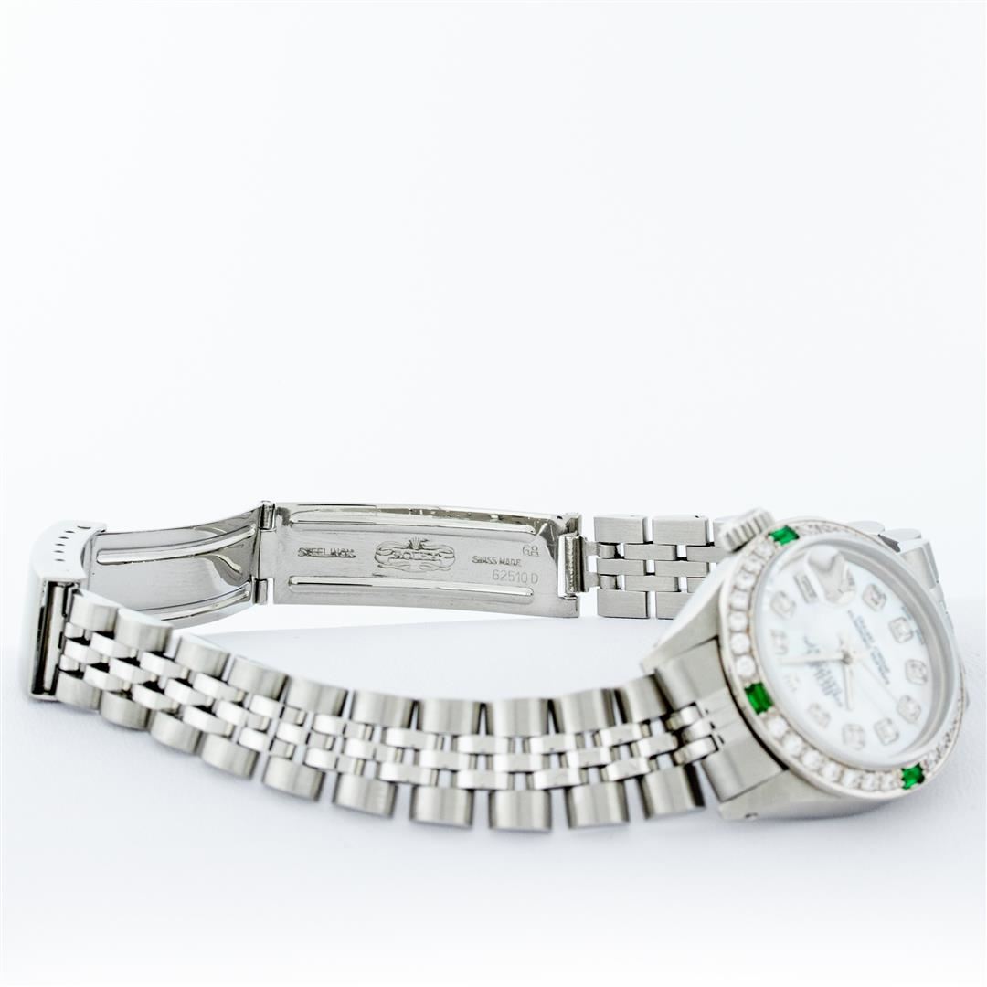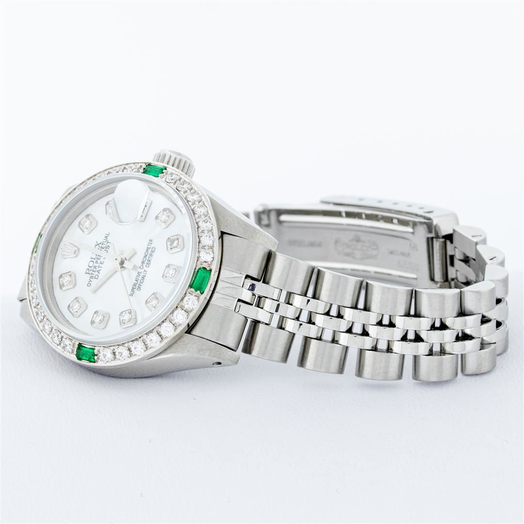 One Ladies Stainless Steel Rolex Datejust Polished Bright with Satin Finish, Serviced & Electronically Tested, Stainless Steel Case: 26mm, Stainless Steel Crown, Custom Bezel: New 18K White Gold Synthetic Emerald Beadset Diamond Bezel, Diamond + Gem Count: 28 Diamonds + 4 Synthetic Emeralds. Total Weight .70 Carat, Clarity: SI-VS, Color: G to H. Custom Crystal: New Synthetic Sapphire Cyclops Lens. Custom Hands: New Luminescent Hands. Movement: Automatic Winding Movement . Custom Dial: Refinished Mother Of Pearl With Diamond Hour Markers, 10 Diamond in Dial G To H In Color, Clarity: SI-VS. Date Window: 3 O'Clock Position Date Display, Model: Datejust. Condition: G-6 Extra Fine. Bracelet: Stainless Steel Jubilee. Bright Polish & Satin Finish. 6.0 Inch Length, Adjustable. Standard Clasp, With Rolex Logo. This Watch Has Been Serviced Time Tested And Is In Excellent Condition It Is Free Of All Scratches And Dents.