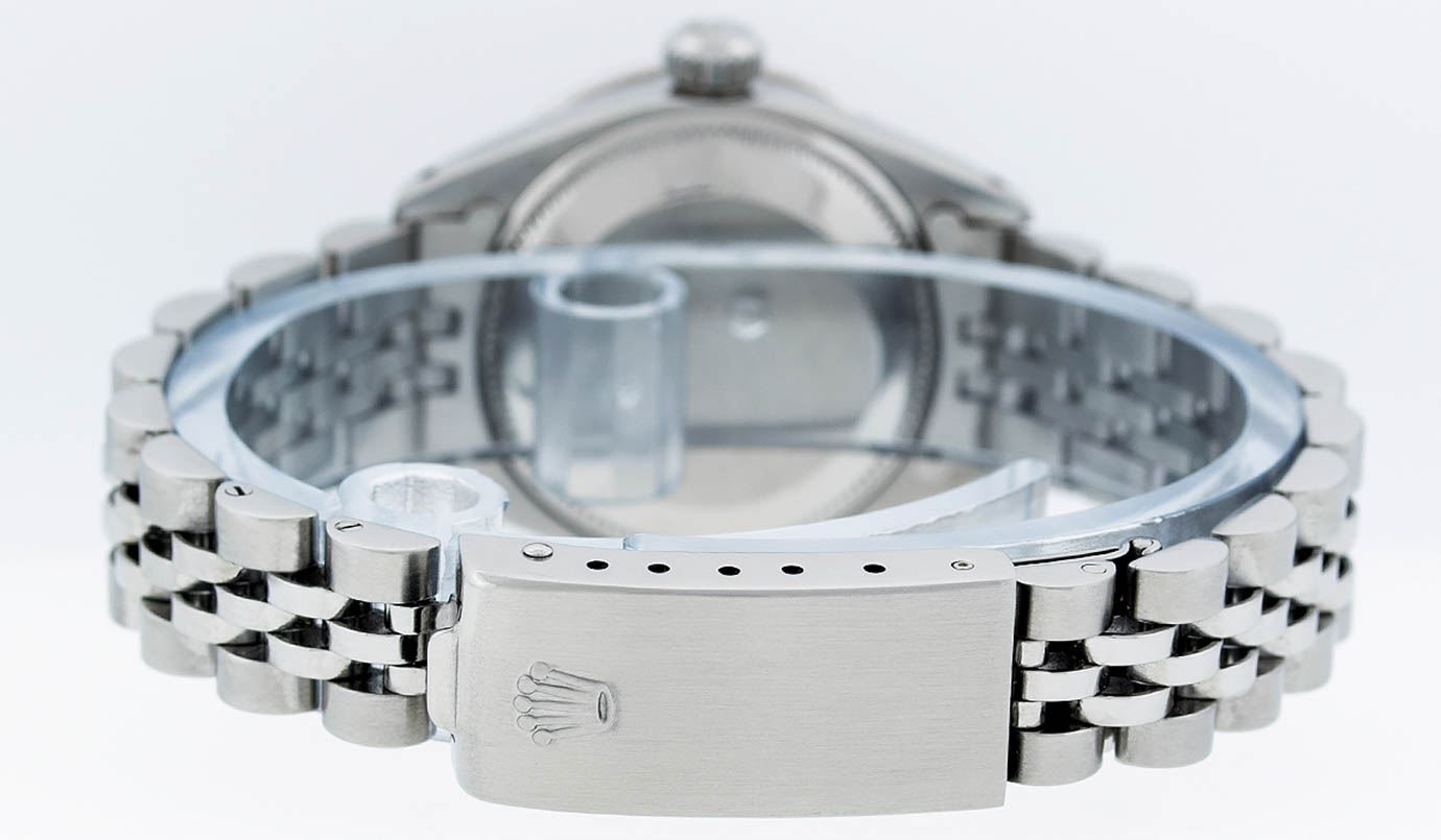 One Ladies Stainless Steel Rolex Datejust Polished Bright with Satin Finish, Serviced & Electronically Tested, Stainless Steel Case: 26mm, Stainless Steel Crown, Custom Bezel: New 18K White Gold Sapphire Beadset Diamond Bezel, Diamond + Gem Count: 28 Diamonds + 4 Sapphires Total Weight .70 Carat, Clarity: SI-VS, Color: G to H. Custom Crystal: New Synthetic Sapphire Cyclops Lens. Custom Hands: New Luminescent Hands. Movement: Automatic Winding Movement. Custom Dial: Refinished Mother Of Pearl With Diamond Hour Markers, 10 Diamond in Dial, G To H In Color, Clarity: SI-VS. Date Window: 3 O'Clock Position Date Display, Model: Datejust. Condition: G-6 Extra Fine. Bracelet: Stainless Steel Jubilee. Bright Polish & Satin Finish. 6.0 Inch Length, Adjustable. Standard Clasp, With Rolex Logo. This Watch Has Been Serviced Time Tested And Is In Excellent Condition It Is Free Of All Scratches And Dents.