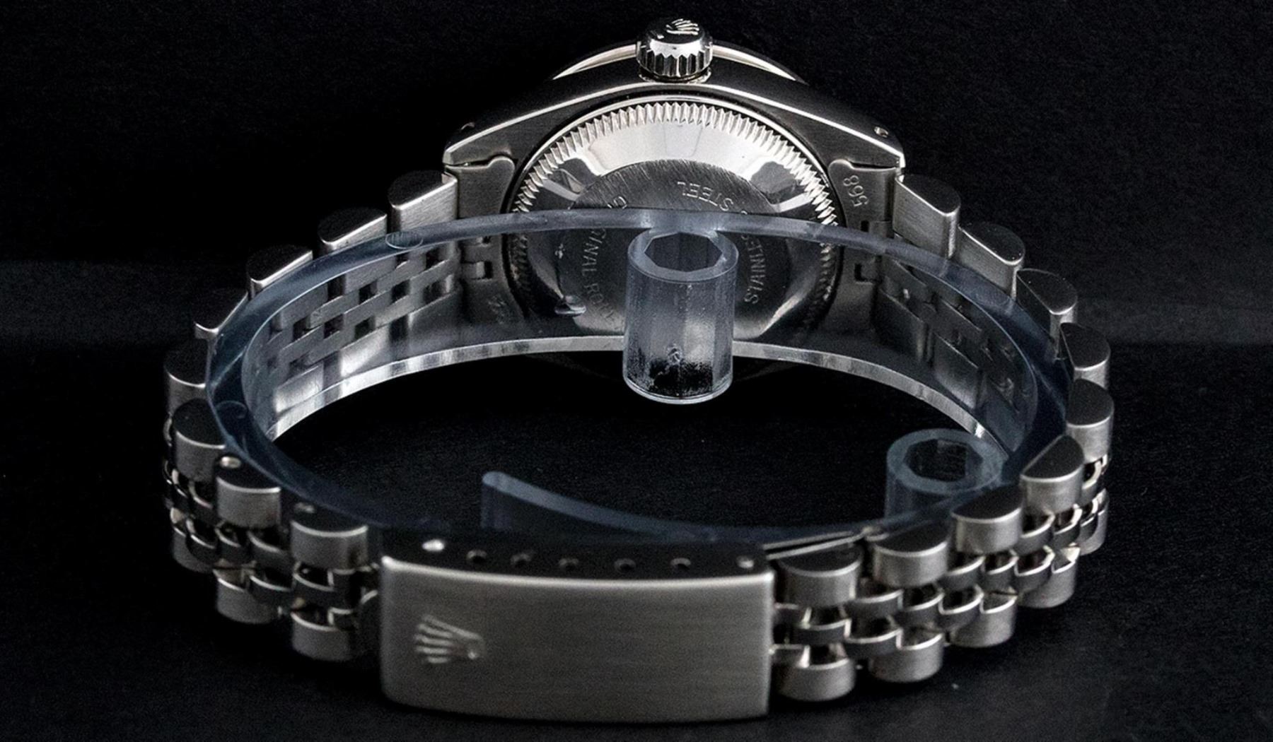 One Ladies Stainless Steel Rolex Datejust Polished Bright with Satin Finish, Serviced & Electronically Tested, Stainless Steel Case: 26mm, Stainless Steel Crown, Custom Bezel: New 18K White Gold Sapphire Beadset Diamond Bezel, Diamond + Gem Count: 28 Diamonds + 4 Sapphires Total Weight .70 Carat, Clarity: SI-VS, Color: G to H. Custom Crystal: New Synthetic Sapphire Cyclops Lens. Custom Hands: New Luminescent Hands. Movement: Automatic Winding Movement. Custom Dial: Refinished Mother Of Pearl With Diamond Hour Markers, 10 Diamond in Dial, G To H In Color, Clarity: SI-VS. Date Window: 3 O'Clock Position Date Display, Model: Datejust. Condition: G-6 Extra Fine. Bracelet: Stainless Steel Jubilee. Bright Polish & Satin Finish. 6.0 Inch Length, Adjustable. Standard Clasp, With Rolex Logo. This Watch Has Been Serviced Time Tested And Is In Excellent Condition It Is Free Of All Scratches And Dents.