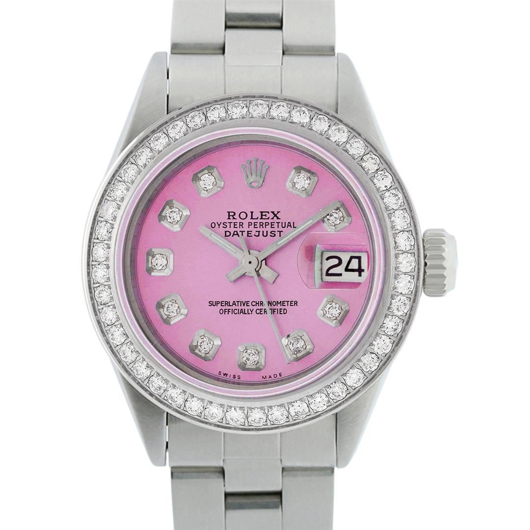 One Ladies Stainless Steel Rolex Datejust Polished Bright with Satin Finish, Serviced & Electronically Tested, Stainless Steel Case: 26mm, Stainless Steel Crown, Custom Bezel: New Stainless Steel Beadset Diamond Bezel, Diamond Count: 44 Diamonds, Total Bezel Weight .80 Carat, Clarity: SI-VS, Color: G to H. Custom Crystal: New Scratch Resistant Synthetic Sapphire Cyclops Lens. Custom Hands: New Luminescent Hands. Movement: Automatic Winding Movement. Custom Dial: Refinished Pink Diamond, Diamond Count: 10 Diamonds On Dial, G To H In Color, Clarity: SI-VS. Date Window: 3 O'Clock Position Date Display, Model: Datejust. Condition: G-6 Extra Fine. Bracelet: Stainless Steel Oyster Band. Bright Polish & Satin Finish. 6.0 Inch Length, Adjustable. Standard Clasp, With Rolex Logo.