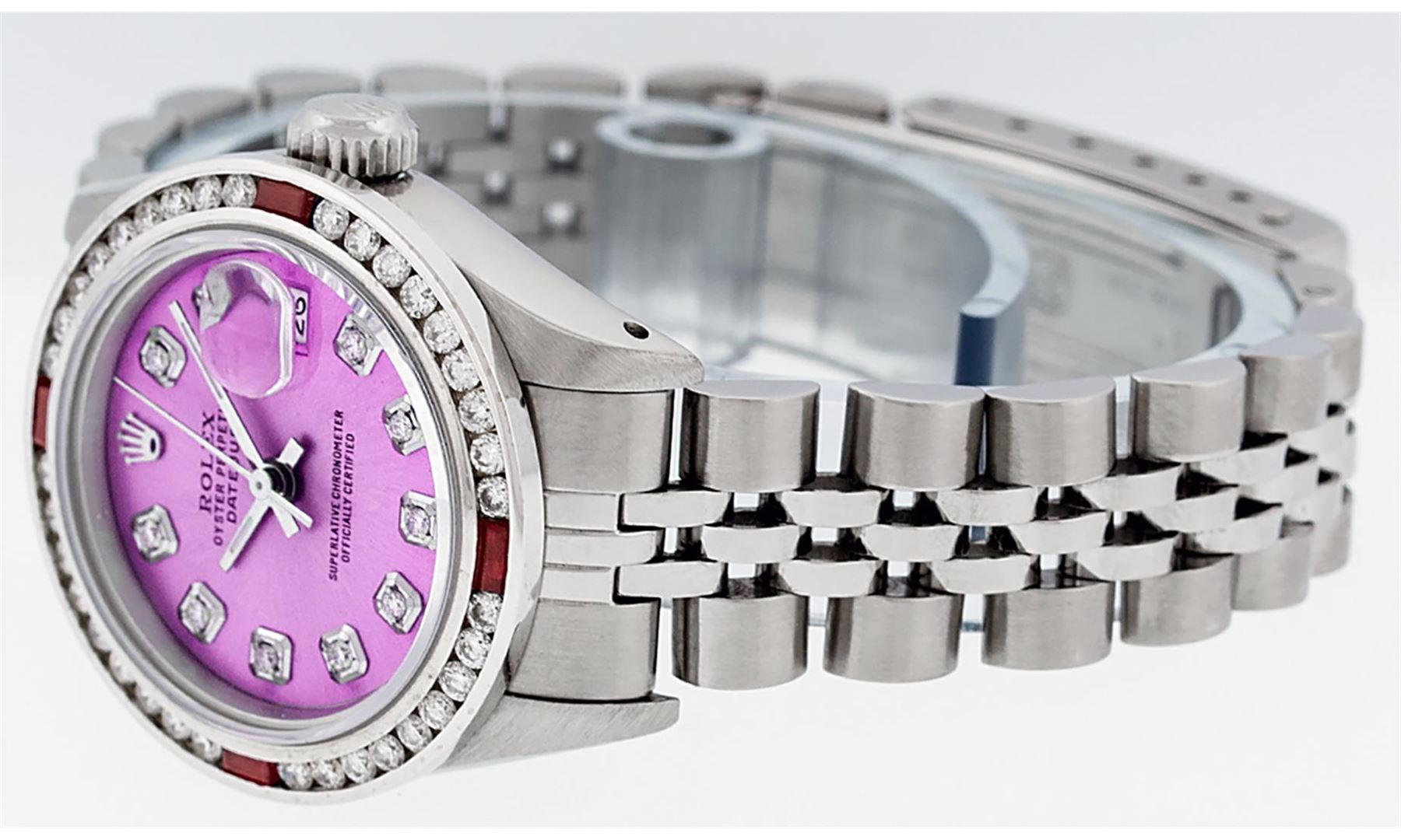 One Ladies Stainless Steel Rolex Datejust Polished Bright with Satin Finish, Serviced & Electronically Tested, Stainless Steel Case: 26mm, Stainless Steel Crown, Custom Bezel: New 18K White Gold Ruby Channel Set Diamond Bezel, Diamond + Gem Count: 36 Diamonds + 4 Rubies Total Weight 1.00 Carat, Clarity: SI-VS, Color: G to H. Custom Crystal: New Scratch Resistant Synthetic Sapphire Cyclops Lens. Custom Hands: New Luminescent Hands. Movement: Automatic Winding Movement. Custom Dial: Refinished Pink With Diamond Hour Markers. Date Window: 3 O'Clock Position Date Display, Model: Datejust. Condition: G-6 Extra Fine. Bracelet: Stainless Steel Jubilee Band. Bright Polish & Satin Finish. 6.0 Inch Length, Adjustable. Standard Clasp, With Rolex Logo. This Watch Has Been Serviced Time Tested And Is In Excellent Condition It Is Free Of All Scratches And Dents.