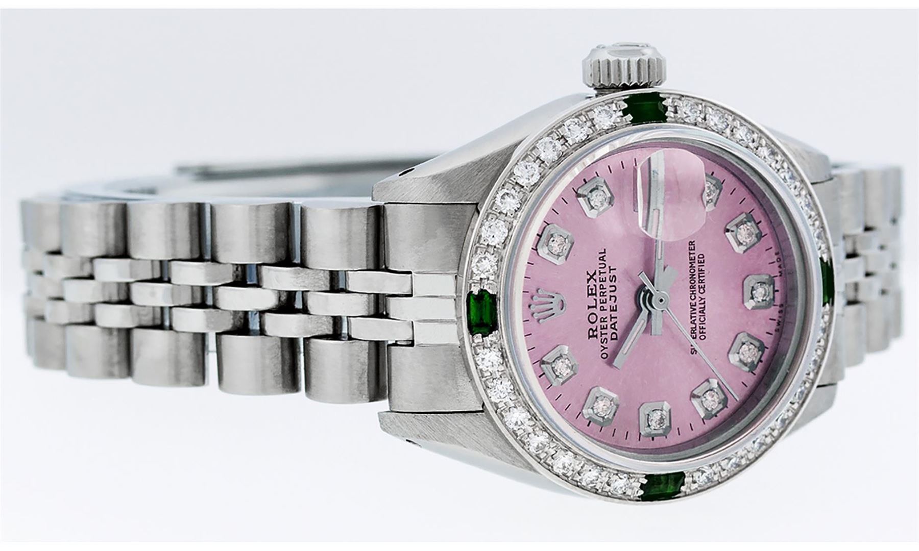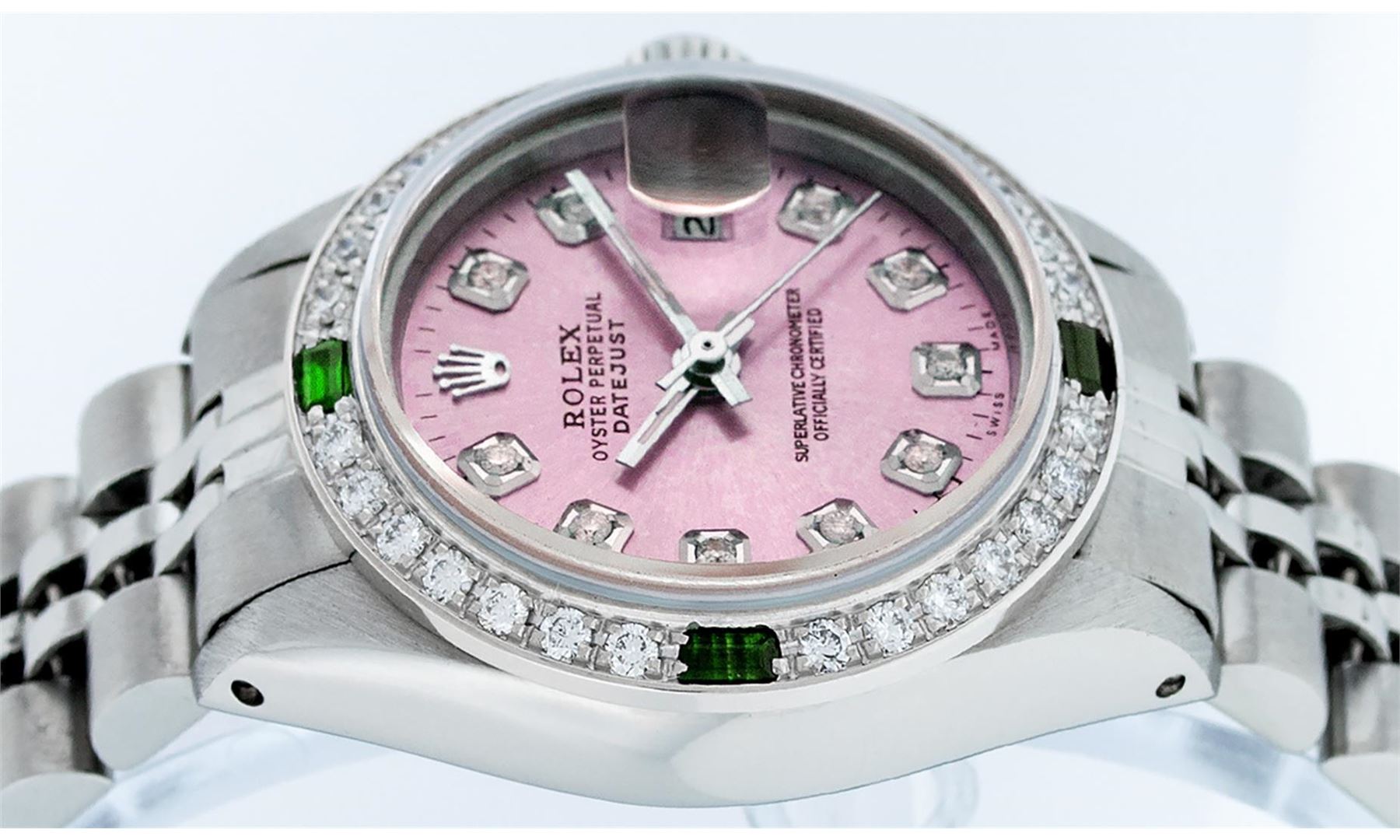 One Ladies Stainless Steel Rolex Datejust Polished Bright with Satin Finish, Serviced & Electronically Tested, Stainless Steel Case: 26mm, Stainless Steel Crown, Custom Bezel: New 18K White Gold Emerald Beadset Diamond Bezel, Diamond + Gem Count: 28 Diamonds + 4 Emeralds. Total Weight .70 Carat, Clarity: SI-VS, Color: G to H. Custom Crystal: New Scratch Resistant Synthetic Sapphire Cyclops Lens. Custom Hands: New Luminescent Hands. Movement: Automatic Winding Movement. Custom Dial: Refinished Pink With Diamond Hour Markers & Dash Track, 10 Diamonds in Dial, G To H In Color, Clarity: SI-VS. Date Window: 3 O'Clock Position Date Display, Model: Datejust. Condition: G-6 Extra Fine. Bracelet: Stainless Steel Jubilee. Bright Polish & Satin Finish. 6.0 Inch Length, Adjustable. Standard Clasp, With Rolex Logo. This Watch Has Been Serviced Time Tested And Is In Excellent Condition It Is Free Of All Scratches And Dents.