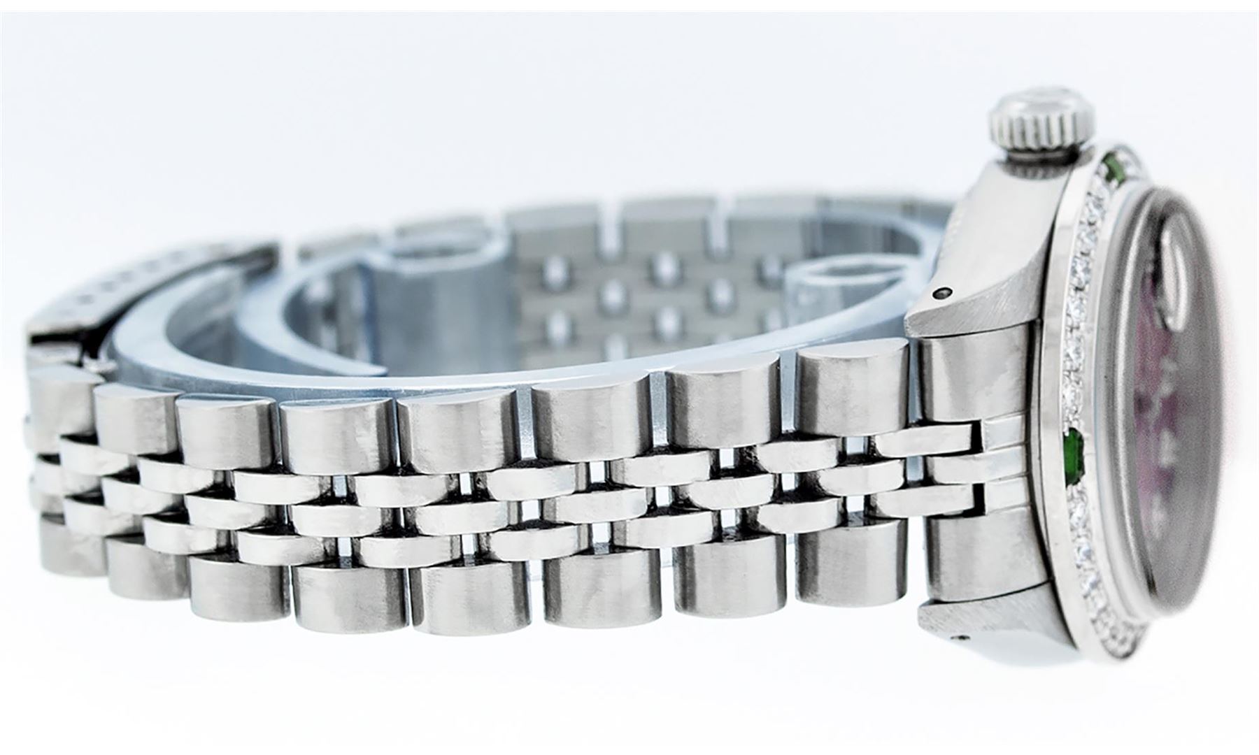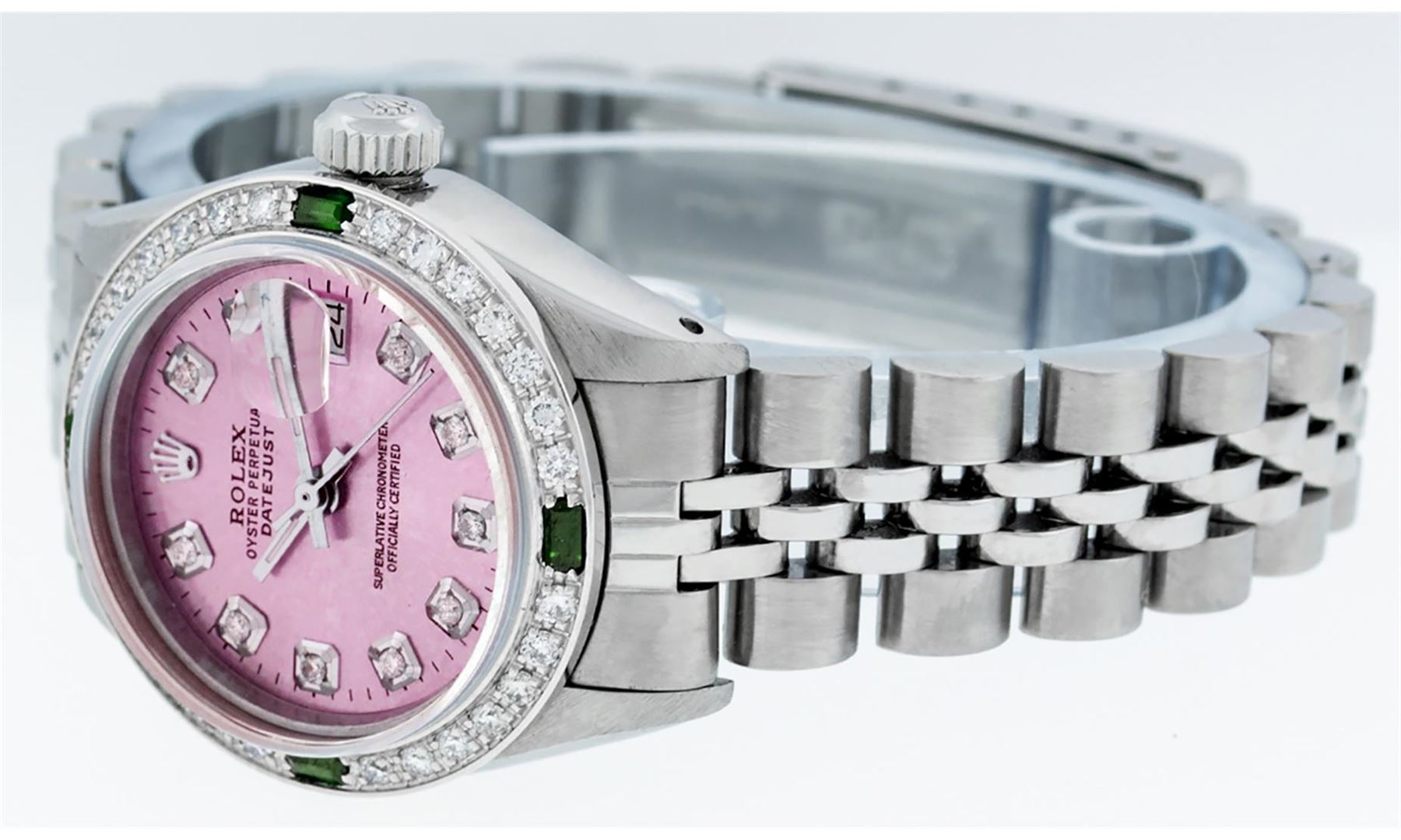 One Ladies Stainless Steel Rolex Datejust Polished Bright with Satin Finish, Serviced & Electronically Tested, Stainless Steel Case: 26mm, Stainless Steel Crown, Custom Bezel: New 18K White Gold Emerald Beadset Diamond Bezel, Diamond + Gem Count: 28 Diamonds + 4 Emeralds. Total Weight .70 Carat, Clarity: SI-VS, Color: G to H. Custom Crystal: New Scratch Resistant Synthetic Sapphire Cyclops Lens. Custom Hands: New Luminescent Hands. Movement: Automatic Winding Movement. Custom Dial: Refinished Pink With Diamond Hour Markers & Dash Track, 10 Diamonds in Dial, G To H In Color, Clarity: SI-VS. Date Window: 3 O'Clock Position Date Display, Model: Datejust. Condition: G-6 Extra Fine. Bracelet: Stainless Steel Jubilee. Bright Polish & Satin Finish. 6.0 Inch Length, Adjustable. Standard Clasp, With Rolex Logo. This Watch Has Been Serviced Time Tested And Is In Excellent Condition It Is Free Of All Scratches And Dents.