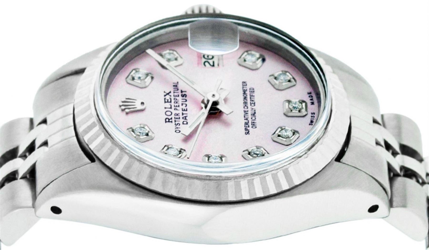 One Ladies Stainless Steel Rolex Datejust Polished Bright with Satin Finish, Serviced & Electronically Tested, Stainless Steel Case: 26mm, Stainless Steel Crown, Bezel: 14K White Gold Fluted Bezel. Custom Crystal: New Acrylic Cyclops Lens. Custom Hands: New Luminescent Hands. Movement: Automatic Winding Movement. Custom Dial: Pink Diamond Dial, Diamond Count: 10 Diamonds In Dial, Color: G to H, Clarity: SI-VS. Date Window: 3 O'Clock Position Date Display, Model: Datejust. Condition: G-6 Extra Fine. Bracelet: Stainless Steel Jubilee Band. Bright Polish & Satin Finish. 6.0 Inch Length, Adjustable. Standard Clasp, With Rolex Logo. This Watch Has Been Serviced Time Tested And Is In Excellent Condition It Is Free Of All Scratches And Dents.