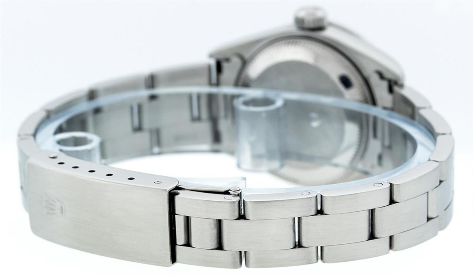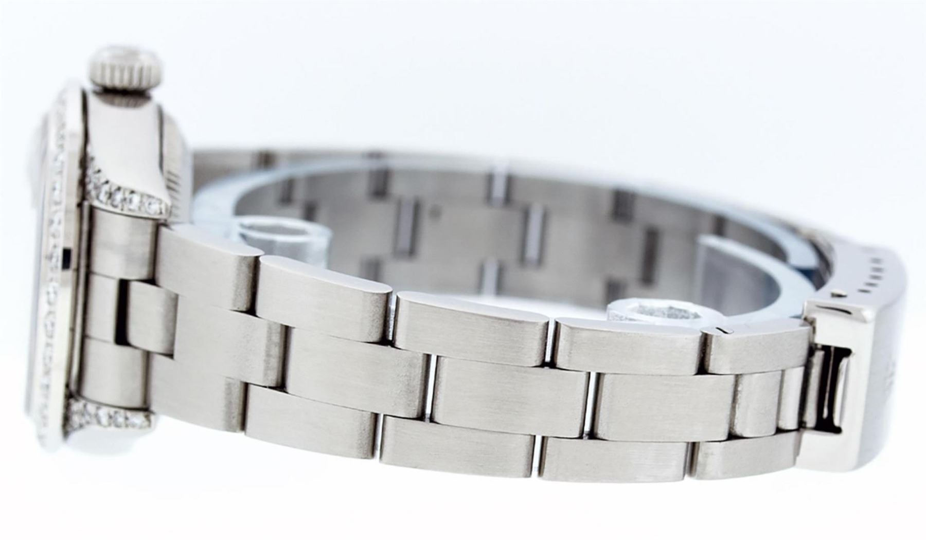 One Quickset Ladies Stainless Steel Rolex Datejust Polished Bright with Satin Finish, Serviced & Electronically Tested, Stainless Steel Case: 26mm, Stainless Steel Crown, Custom Diamond Lugs: 24 Diamonds On Lugs, Clarity: SI-VS, Color: G to H. Custom Bezel: New 18K White Gold Beadset Diamond Bezel, Stone Count: 32 Diamonds On Bezel, Total Bezel Weight .70 Carat, Clarity: SI-VS, Color: G to H. Custom Crystal: New Scratch Resistant Synthetic Sapphire Cyclops Lens. Custom Hands: New Luminescent Hands. Movement: Automatic Winding Movement Caliber 2235. Custom Dial: Refinished Single Cut Pink String Diamond Dial, 43 Diamonds in Dial G To H In Color, Clarity: VS. Date Window: 3 O'Clock Position Date Display, Model: 79160 Quickset Datejust. Condition: G-6 Extra Fine. Bracelet: Stainless Steel Oyster Band. Bright Polish & Satin Finish. 6.0 Inch Length, Adjustable. Standard Clasp, With Rolex Logo. This Watch Has Been Serviced Time Tested And Is In Excellent Condition It Is Free Of All Scratches And Dents.