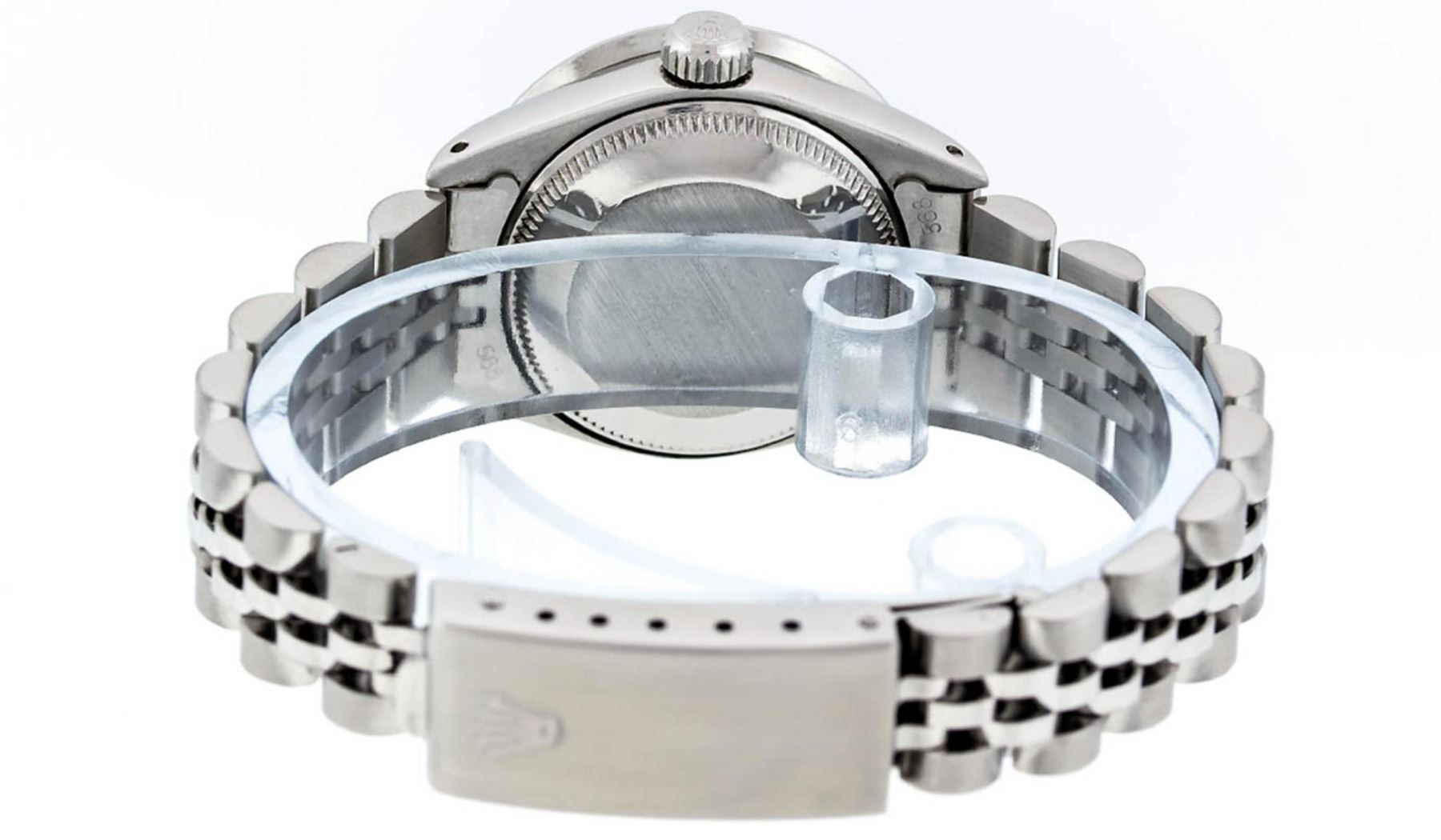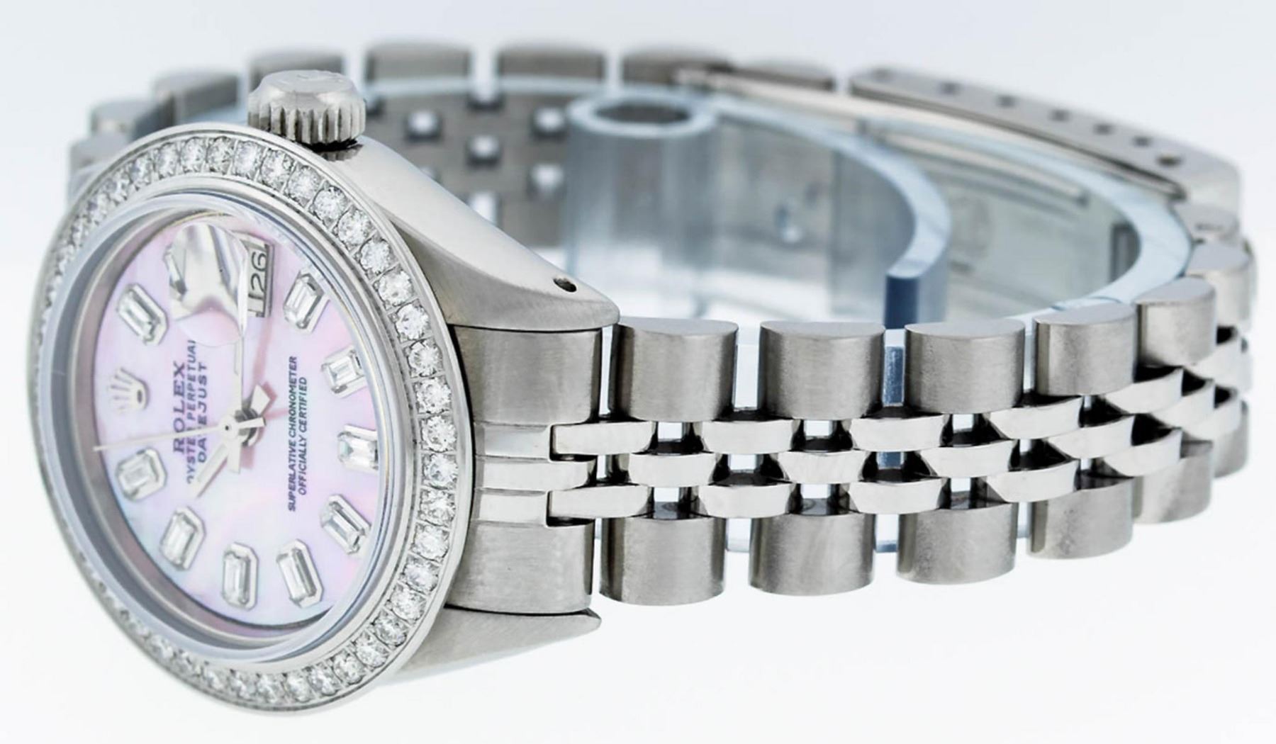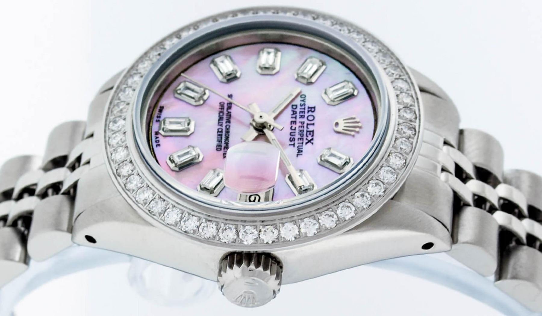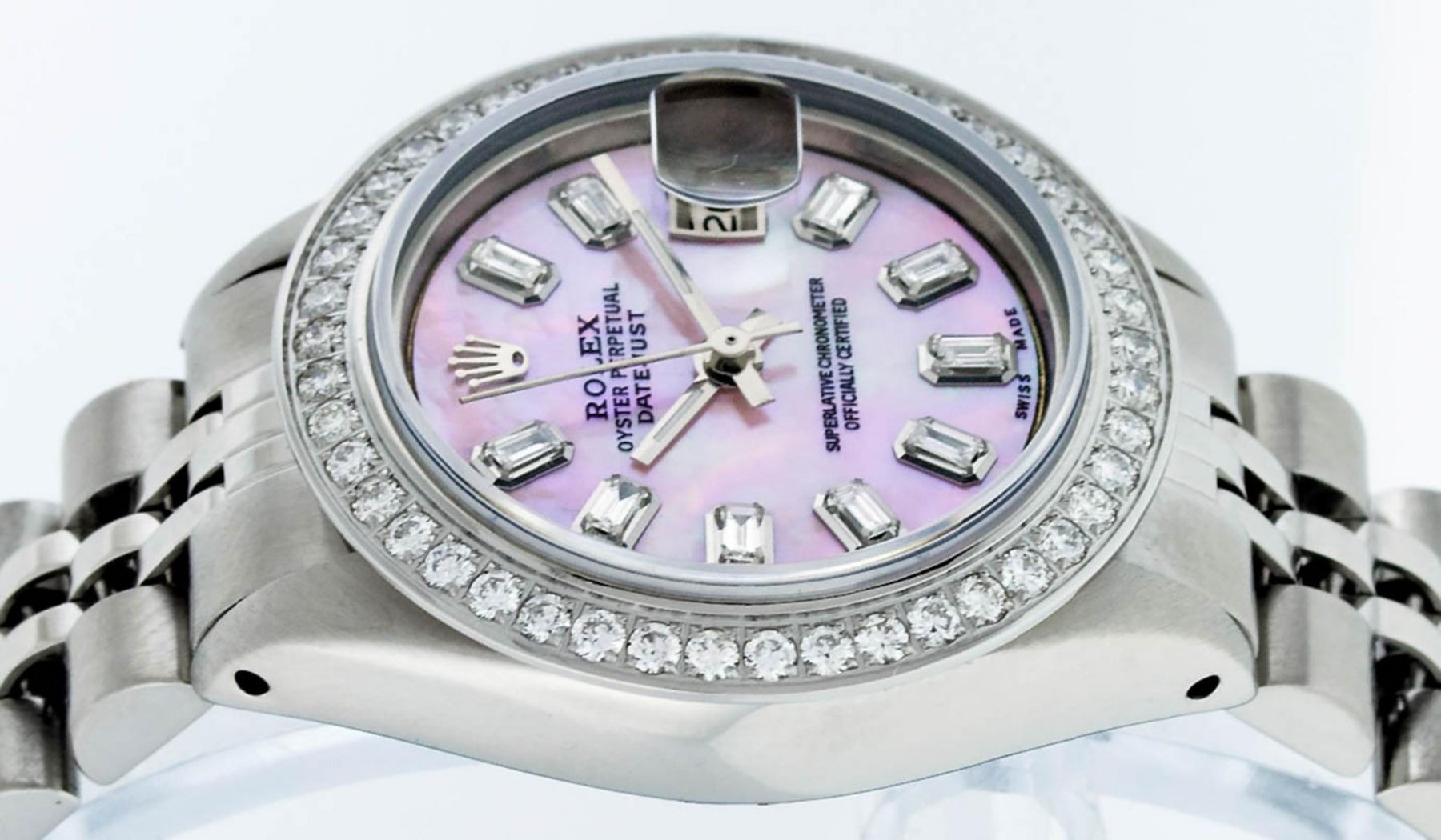One Ladies Stainless Steel Rolex Datejust Polished Bright with Satin Finish, Serviced & Electronically Tested, Stainless Steel Case: 26mm, Stainless Steel Crown, Custom Bezel: New Stainless Steel Beadset Diamond Bezel, Diamond Count: 44 Diamonds Total Weight 1.00 Carat, Clarity: SI-VS, Color: G to H. Custom Crystal: New Synthetic Sapphire Cyclops Lens. Custom Hands: New Luminescent Hands. Movement: Automatic Winding Movement Caliber 2030. Custom Dial: Refinished Pink Mother Of Pearl With Baguette Diamond Hour Markers, Diamond Count: 10 Baguette Diamonds in Dial G To H In Color, Clarity: SI-VS. Date Window: 3 O'Clock Position Date Display, Model: Datejust. Condition: G-6 Extra Fine. Bracelet: Stainless Steel Jubilee Band. Bright Polish & Satin Finish. 6.0 Inch Length, Adjustable. Standard Clasp, With Rolex Logo. This Watch Has Been Serviced Time Tested And Is In Excellent Condition It Is Free Of All Scratches And Dents.