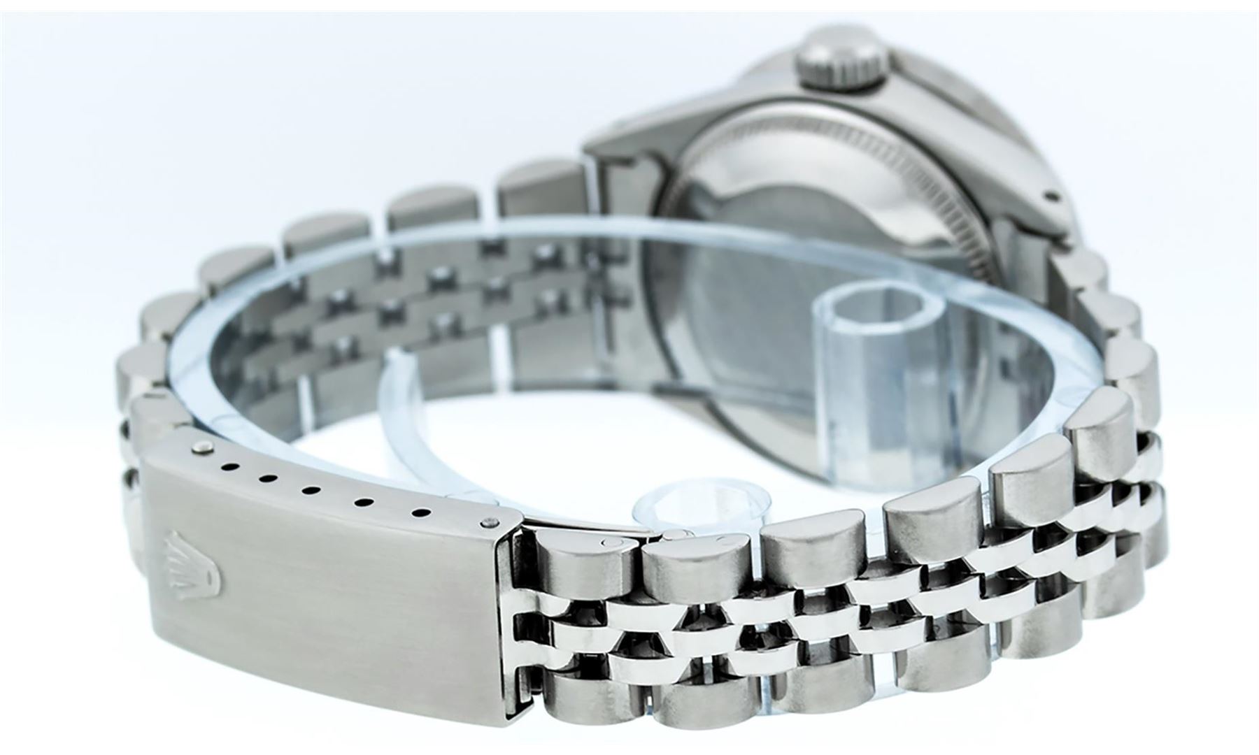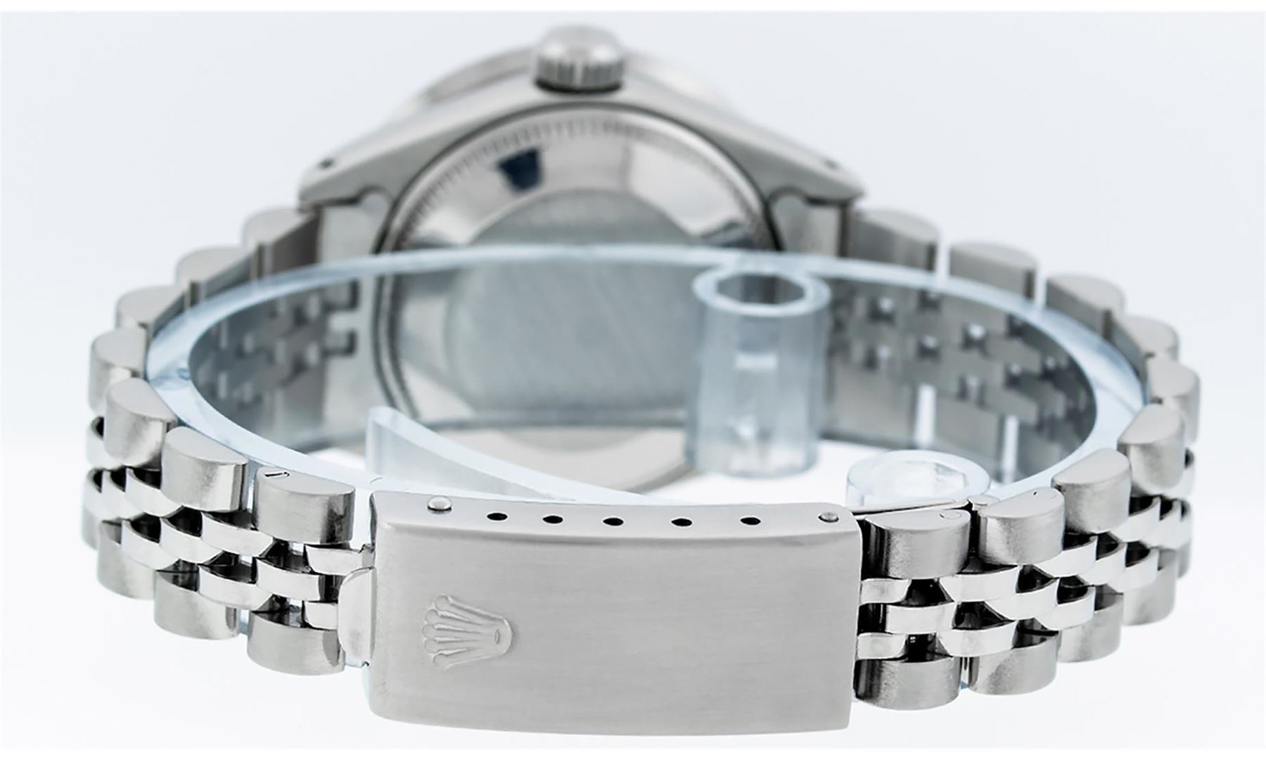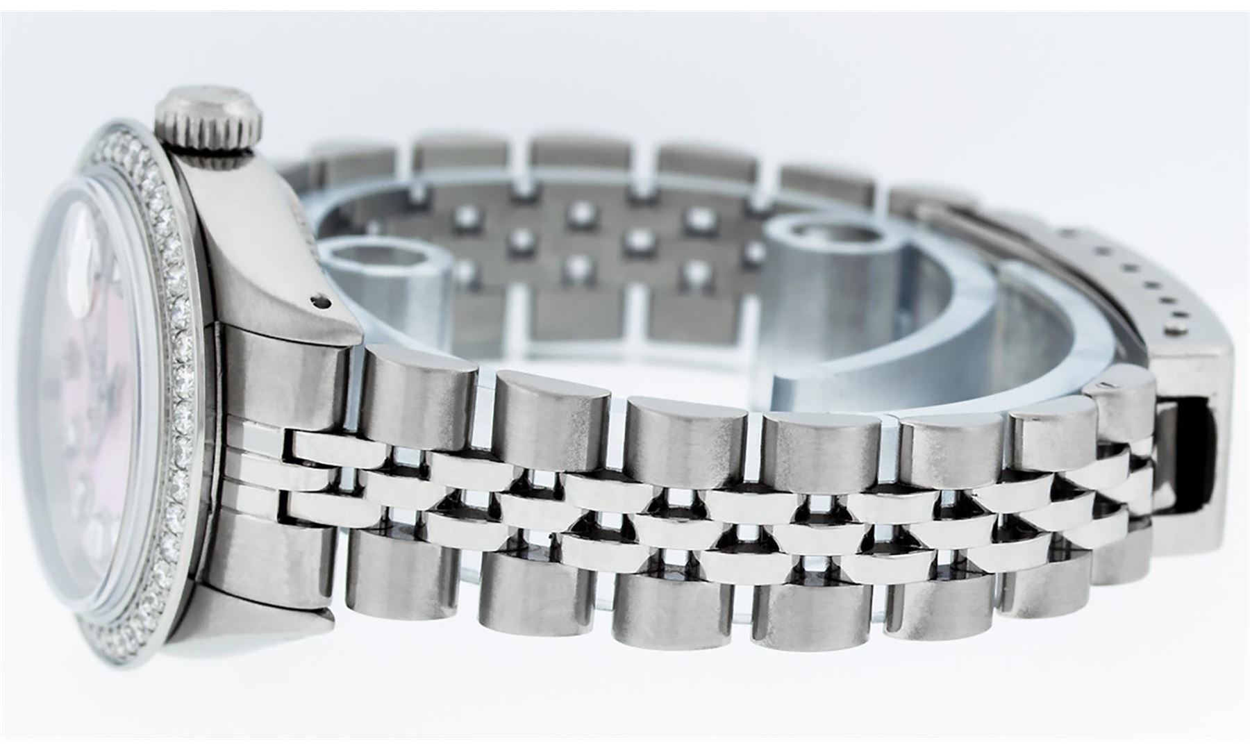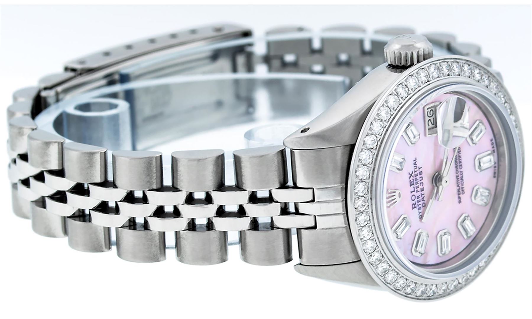 One Ladies Stainless Steel Rolex Datejust Polished Bright with Satin Finish, Serviced & Electronically Tested, Stainless Steel Case: 26mm, Stainless Steel Crown, Custom Bezel: New Stainless Steel Beadset Diamond Bezel, Diamond Count: 44 Diamonds Total Weight 1.00 Carat, Clarity: SI-VS, Color: G to H. Custom Crystal: New Synthetic Sapphire Cyclops Lens. Custom Hands: New Luminescent Hands. Movement: Automatic Winding Movement . Custom Dial: Refinished Pink Mother Of Pearl With Baguette Diamond Hour Markers, Diamond Count: 10 Baguette Diamonds in Dial G To H In Color, Clarity: SI-VS. Date Window: 3 O'Clock Position Date Display, Model: Datejust. Condition: G-6 Extra Fine. Bracelet: Stainless Steel Jubilee Band. Bright Polish & Satin Finish. 6.0 Inch Length, Adjustable. Standard Clasp, With Rolex Logo. This Watch Has Been Serviced Time Tested And Is In Excellent Condition It Is Free Of All Scratches And Dents.