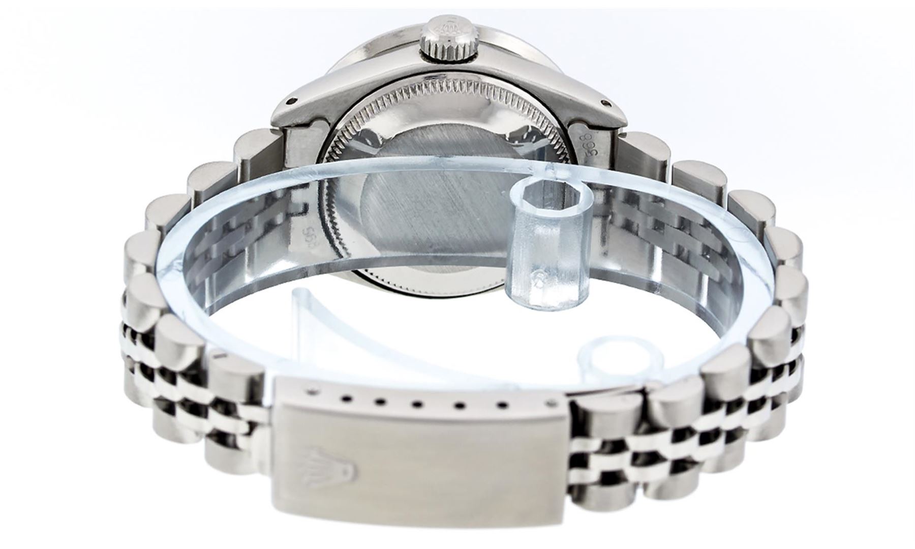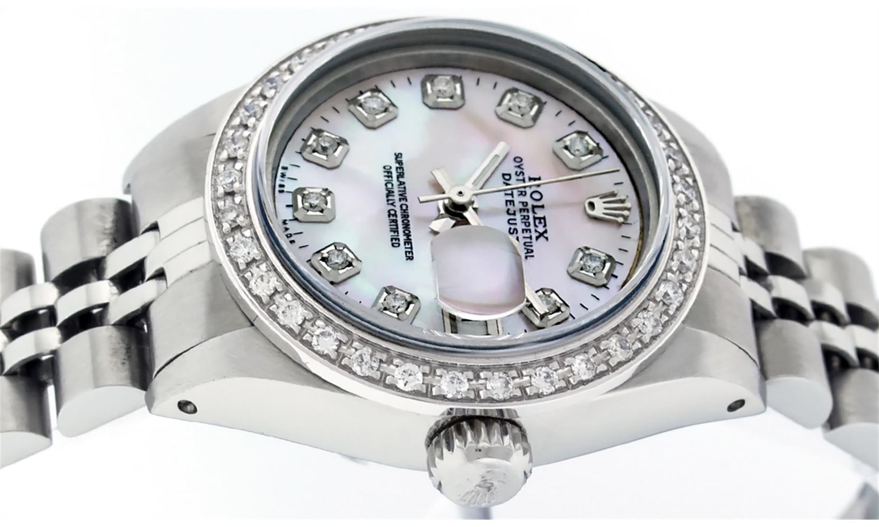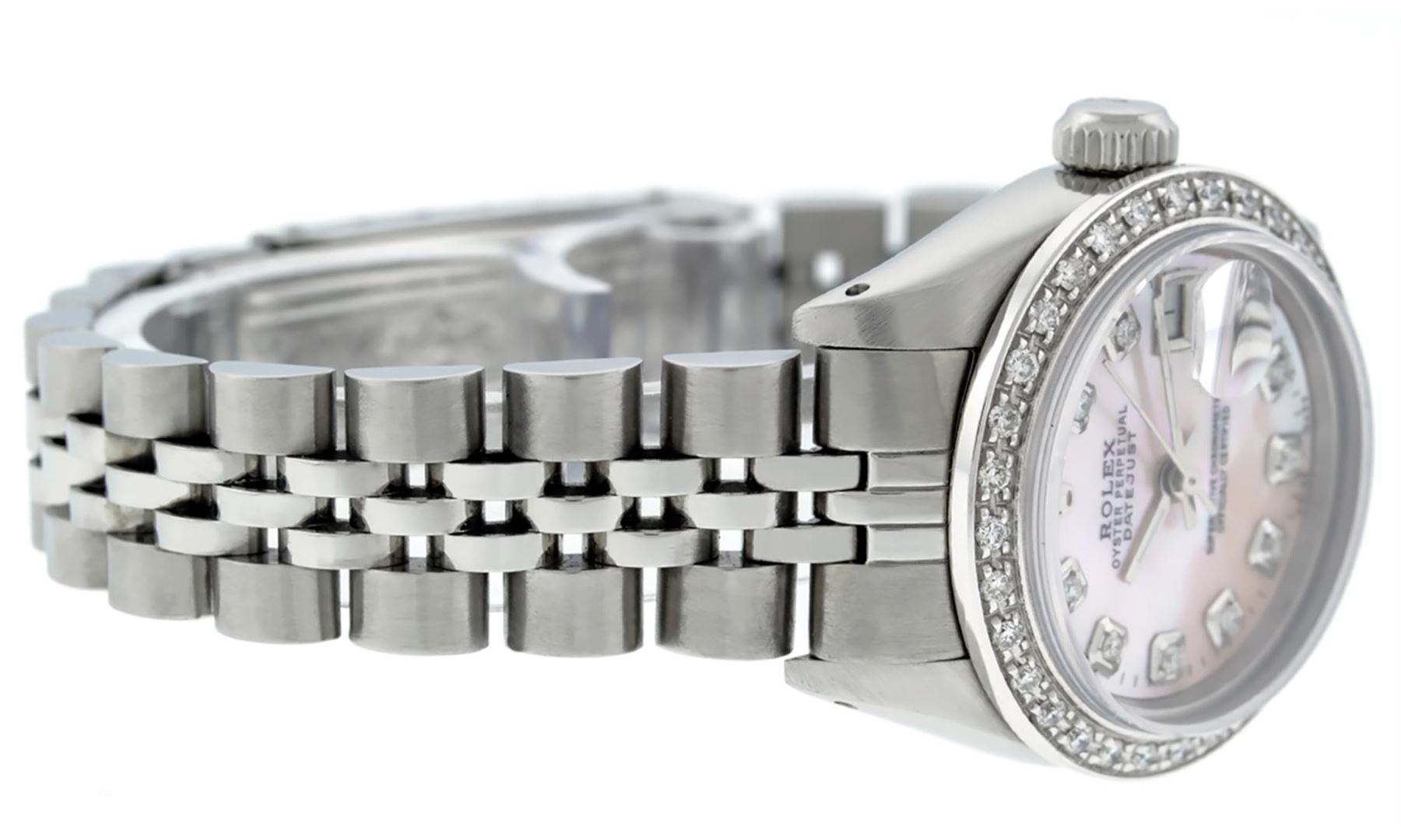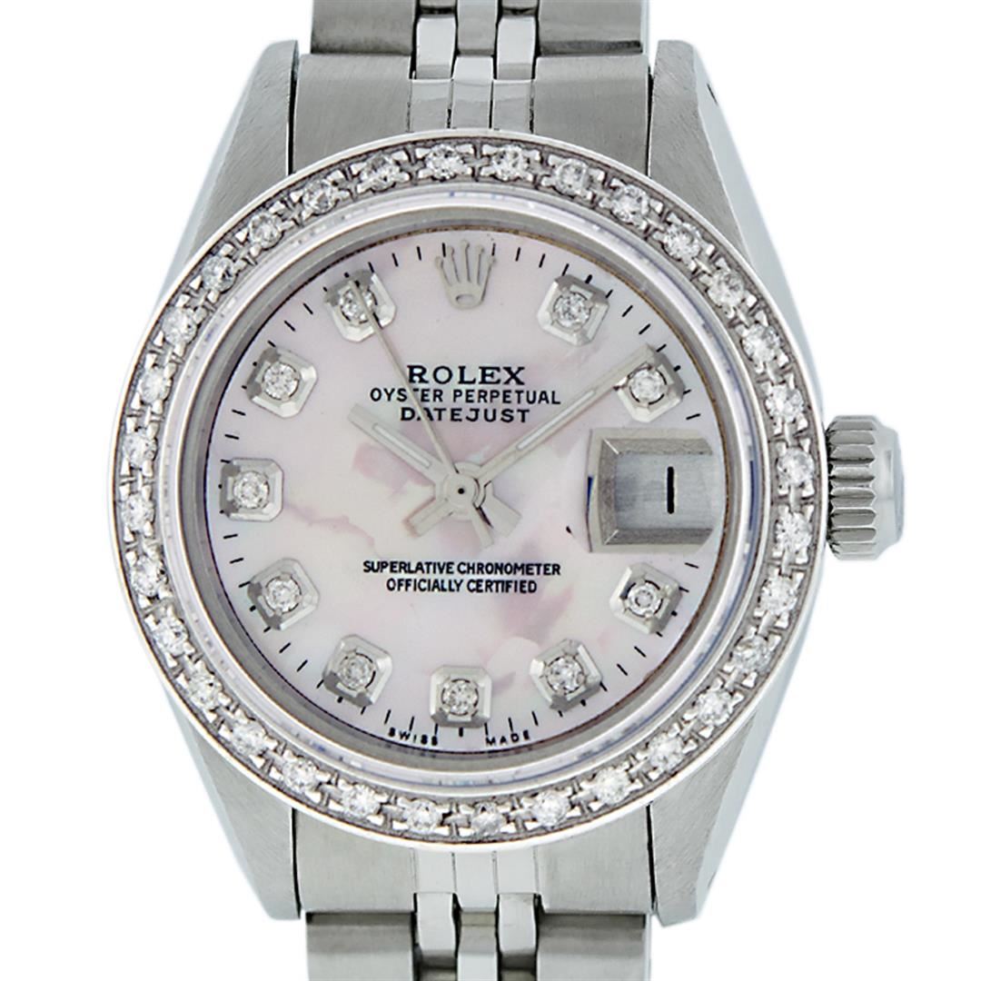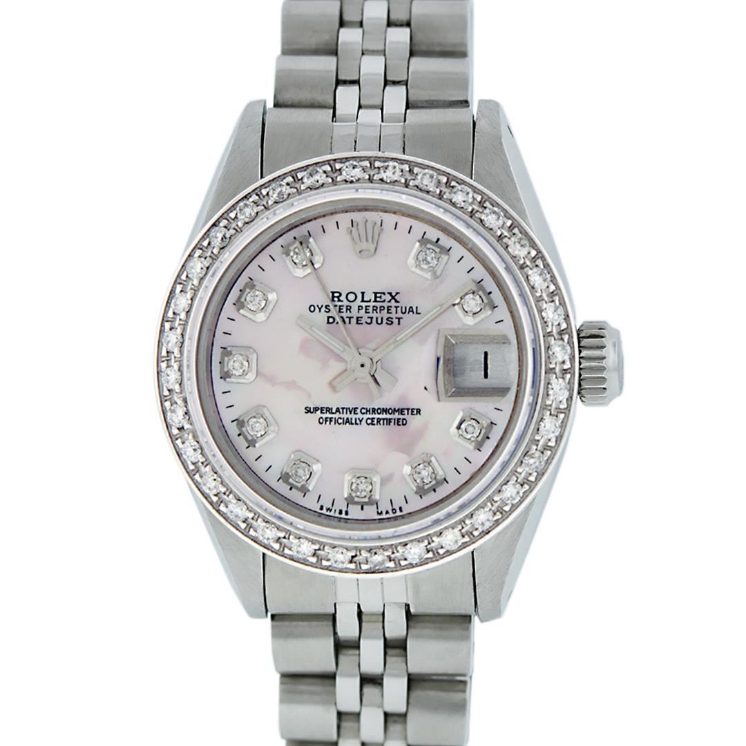 One Ladies Stainless Steel Rolex Datejust Polished Bright with Satin Finish, Serviced & Electronically Tested, Stainless Steel Case: 26mm, Stainless Steel Crown, Custom Bezel: New 18K White Gold Beadset Diamond Bezel, Diamond Count: 32 Diamonds, Total Weight .70 Carat, Clarity: SI-VS, Color: G to H. Custom Crystal: New Synthetic Sapphire Cyclops Lens. Custom Hands: New Luminescent Hands. Movement: Automatic Winding Movement Caliber 2030. Custom Dial: Pink Mother Of Pearl Diamond Dial, Diamond Count: 10 Diamonds In Dial, Color: G To H, Clarity: SI-VS. Date Window: 3 O'Clock Position Date Display, Model: Datejust. Condition: G-6 Extra Fine. Bracelet: Stainless Steel Jubilee. Bright Polish & Satin Finish. 6.0 Inch Length, Adjustable. Standard Clasp, With Rolex Logo. This Watch Has Been Serviced Time Tested And Is In Excellent Condition It Is Free Of All Scratches And Dents.