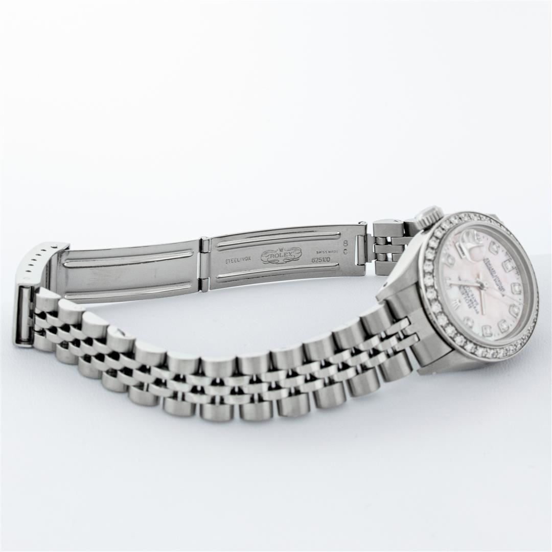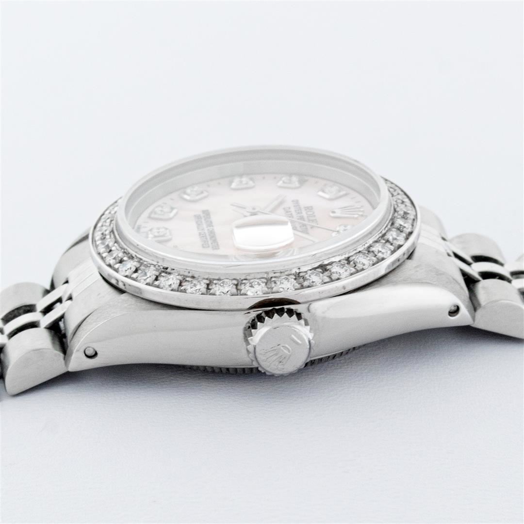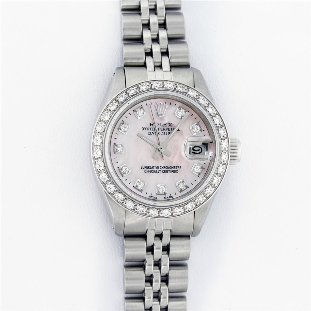 One Ladies Stainless Steel Rolex Datejust Polished Bright with Satin Finish, Serviced & Electronically Tested, Stainless Steel Case: 26mm, Stainless Steel Crown, Custom Bezel: New 18K White Gold Beadset Diamond Bezel, Diamond Count: 32 Diamonds, Total Weight .70 Carat, Clarity: SI-VS, Color: G to H. Custom Crystal: New Synthetic Sapphire Cyclops Lens. Custom Hands: New Luminescent Hands. Movement: Automatic Winding Movement Caliber 2030. Custom Dial: Pink Mother Of Pearl Diamond Dial, Diamond Count: 10 Diamonds In Dial, Color: G To H, Clarity: SI-VS. Date Window: 3 O'Clock Position Date Display, Model: Datejust. Condition: G-6 Extra Fine. Bracelet: Stainless Steel Jubilee. Bright Polish & Satin Finish. 6.0 Inch Length, Adjustable. Standard Clasp, With Rolex Logo. This Watch Has Been Serviced Time Tested And Is In Excellent Condition It Is Free Of All Scratches And Dents.
