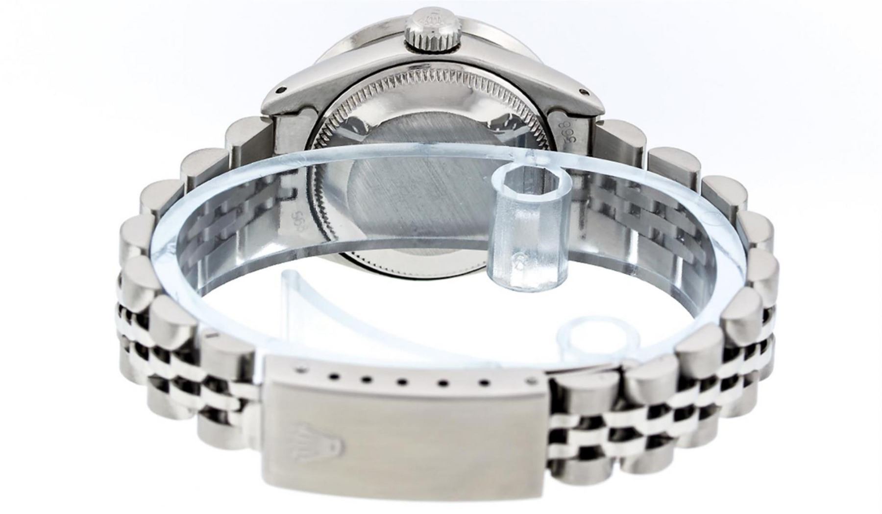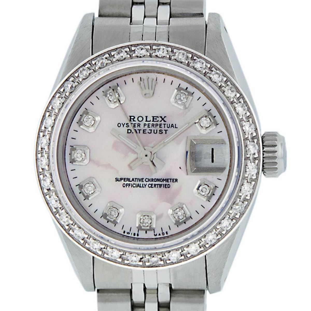 One Ladies Stainless Steel Rolex Datejust Polished Bright with Satin Finish, Serviced & Electronically Tested, Stainless Steel Case: 26mm, Stainless Steel Crown, Custom Bezel: New 18K White Gold Beadset Diamond Bezel, Diamond Count: 32 Diamonds, Total Weight .70 Carat, Clarity: SI-VS, Color: G to H. Custom Crystal: New Synthetic Sapphire Cyclops Lens. Custom Hands: New Luminescent Hands. Movement: Automatic Winding Movement. Custom Dial: Pink Mother Of Pearl Diamond Dial, Diamond Count: 10 Diamonds In Dial, Color: G To H, Clarity: SI-VS. Date Window: 3 O'Clock Position Date Display, Model: Datejust. Condition: G-6 Extra Fine. Bracelet: Stainless Steel Jubilee. Bright Polish & Satin Finish. 6.0 Inch Length, Adjustable. Standard Clasp, With Rolex Logo. This Watch Has Been Serviced Time Tested And Is In Excellent Condition It Is Free Of All Scratches And Dents.