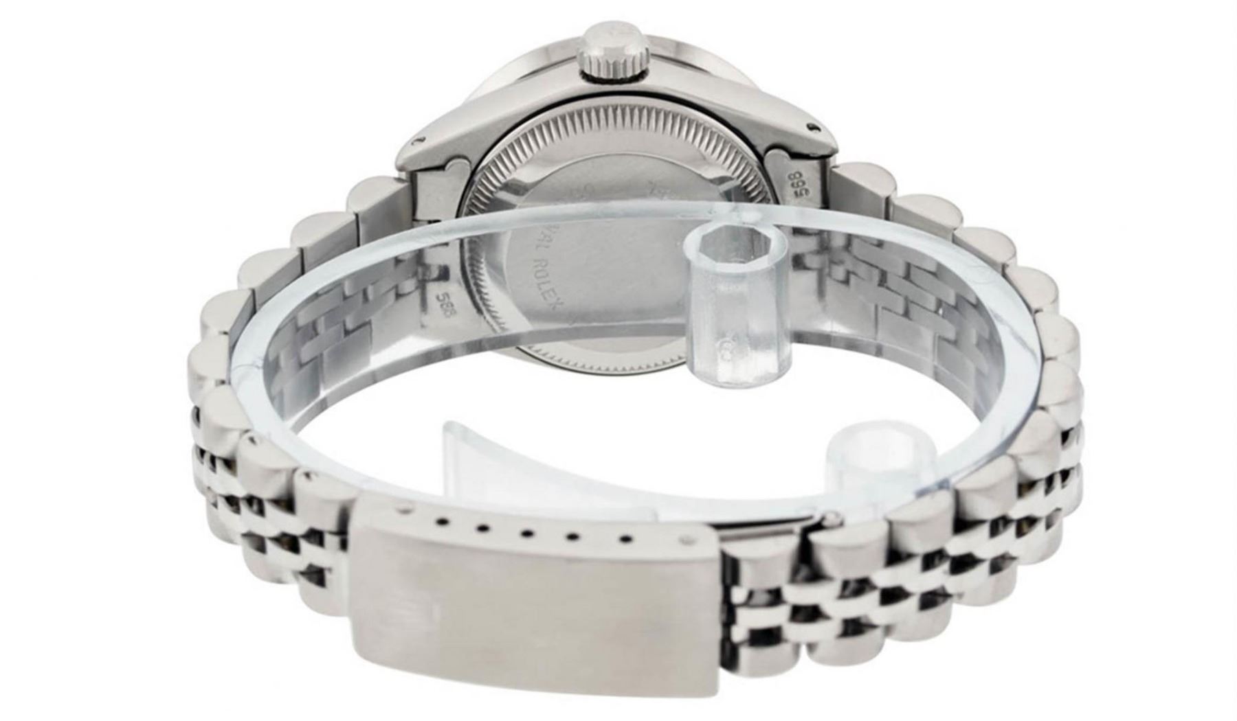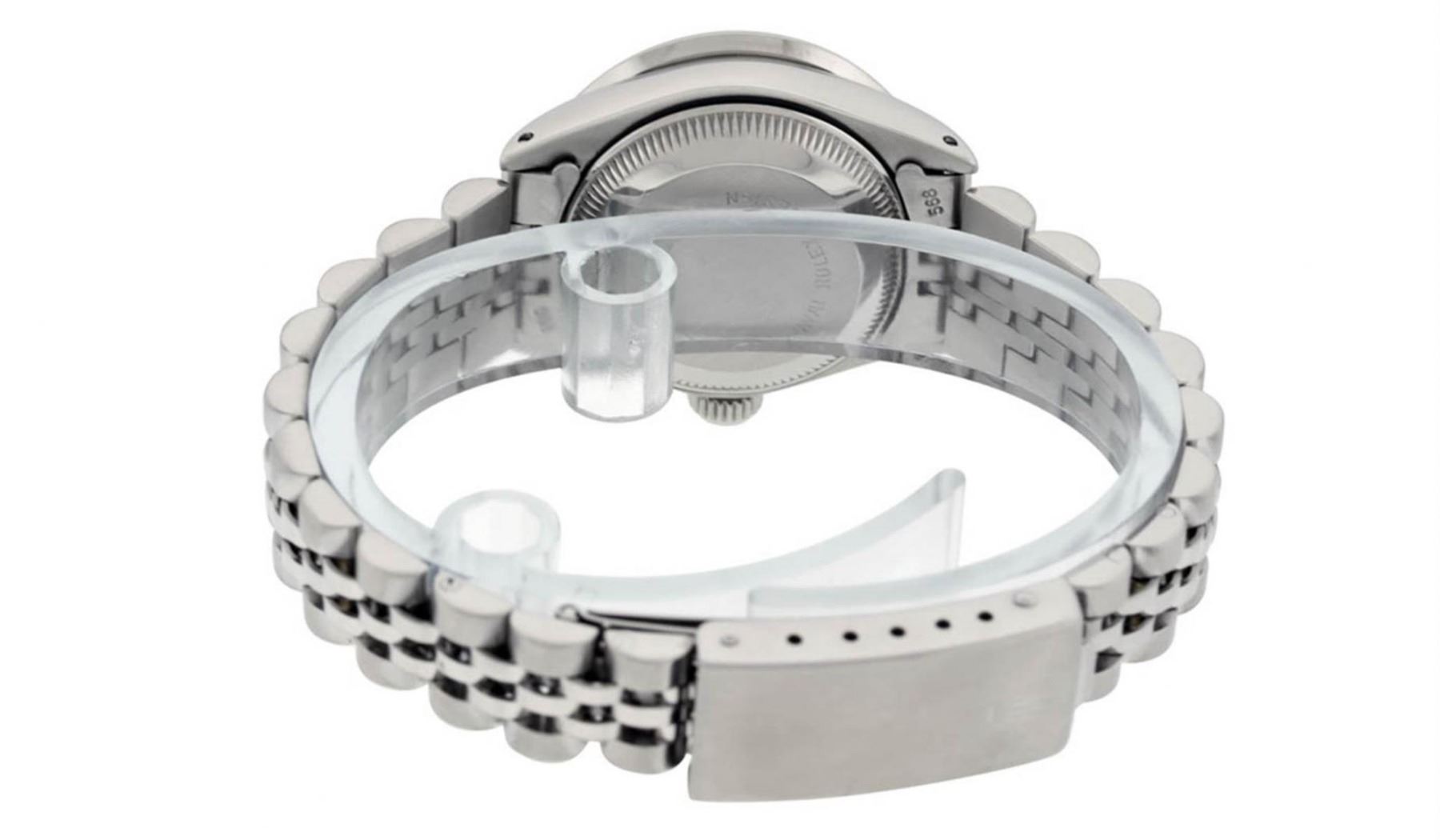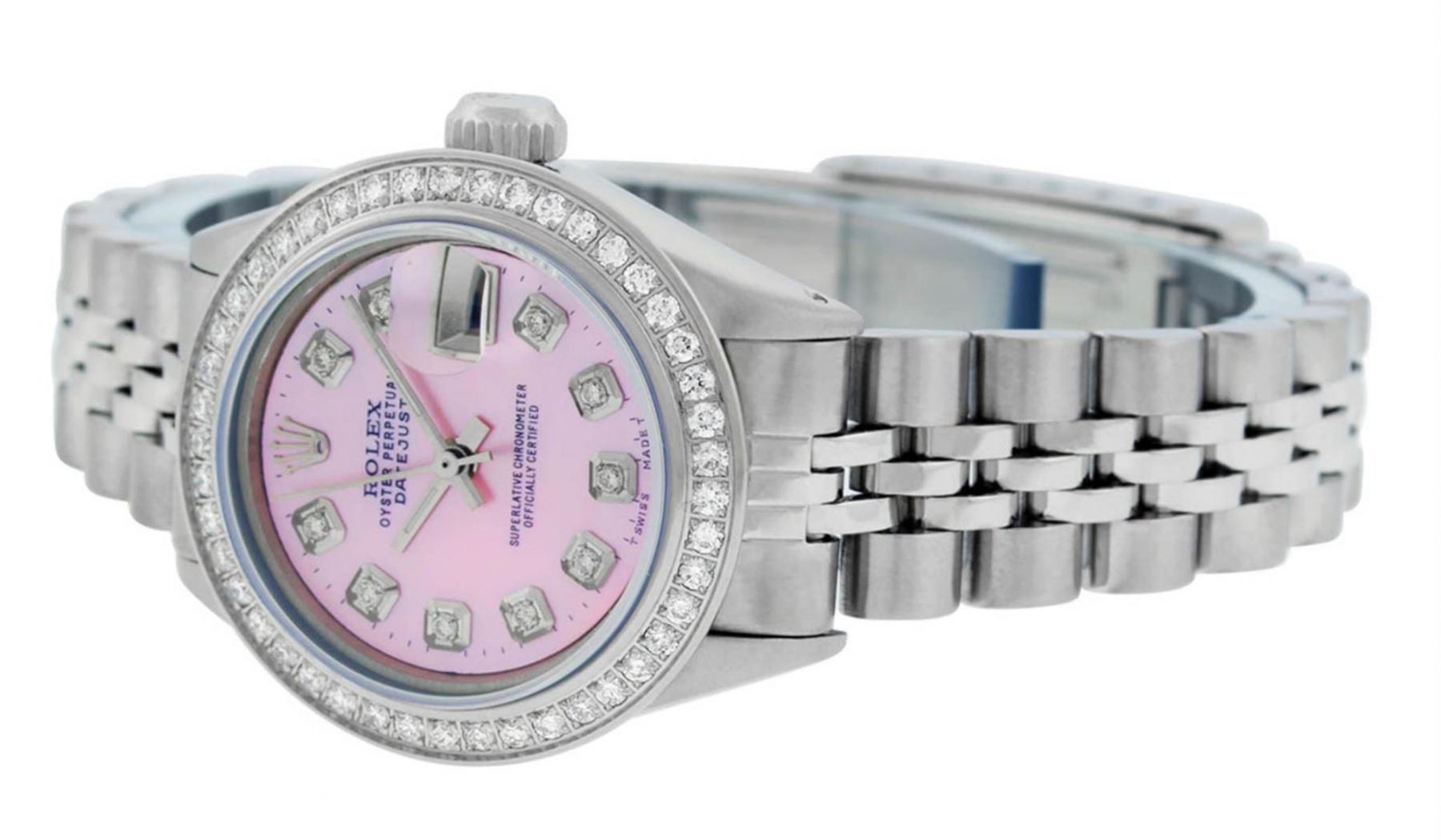 One Ladies Stainless Steel Rolex Datejust Polished Bright with Satin Finish, Serviced & Electronically Tested, Stainless Steel Case: 26mm, Stainless Steel Crown, Custom Bezel: New Stainless Steel Beadset Diamond Bezel, Diamond Count: 44 Diamonds Total Weight 1.00 Carat, Clarity: SI-VS, Color: G to H. Custom Crystal: New Synthetic Sapphire Cyclops Lens. Custom Hands: New Luminescent Hands. Movement: Automatic Winding Movement Caliber 2030. Custom Dial: Refinished Pink Mother Of Pearl With Diamond Hour Markers, Diamond Count: 10 Diamonds in Dial G To H In Color, Clarity: SI-VS. Date Window: 3 O'Clock Position Date Display, Model: Datejust. Condition: G-6 Extra Fine. Bracelet: Stainless Steel Jubilee Band. Bright Polish & Satin Finish. 6.0 Inch Length, Adjustable. Standard Clasp, With Rolex Logo. This Watch Has Been Serviced Time Tested And Is In Excellent Condition It Is Free Of All Scratches And Dents.
