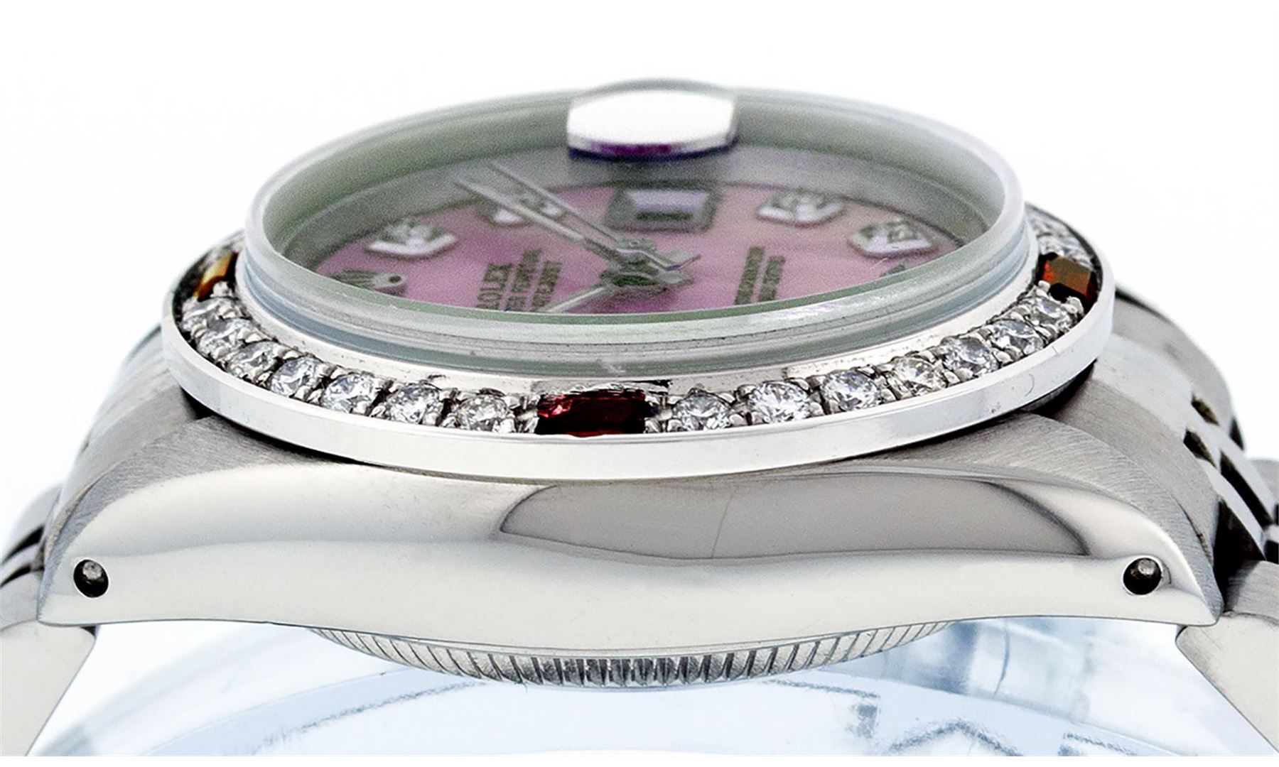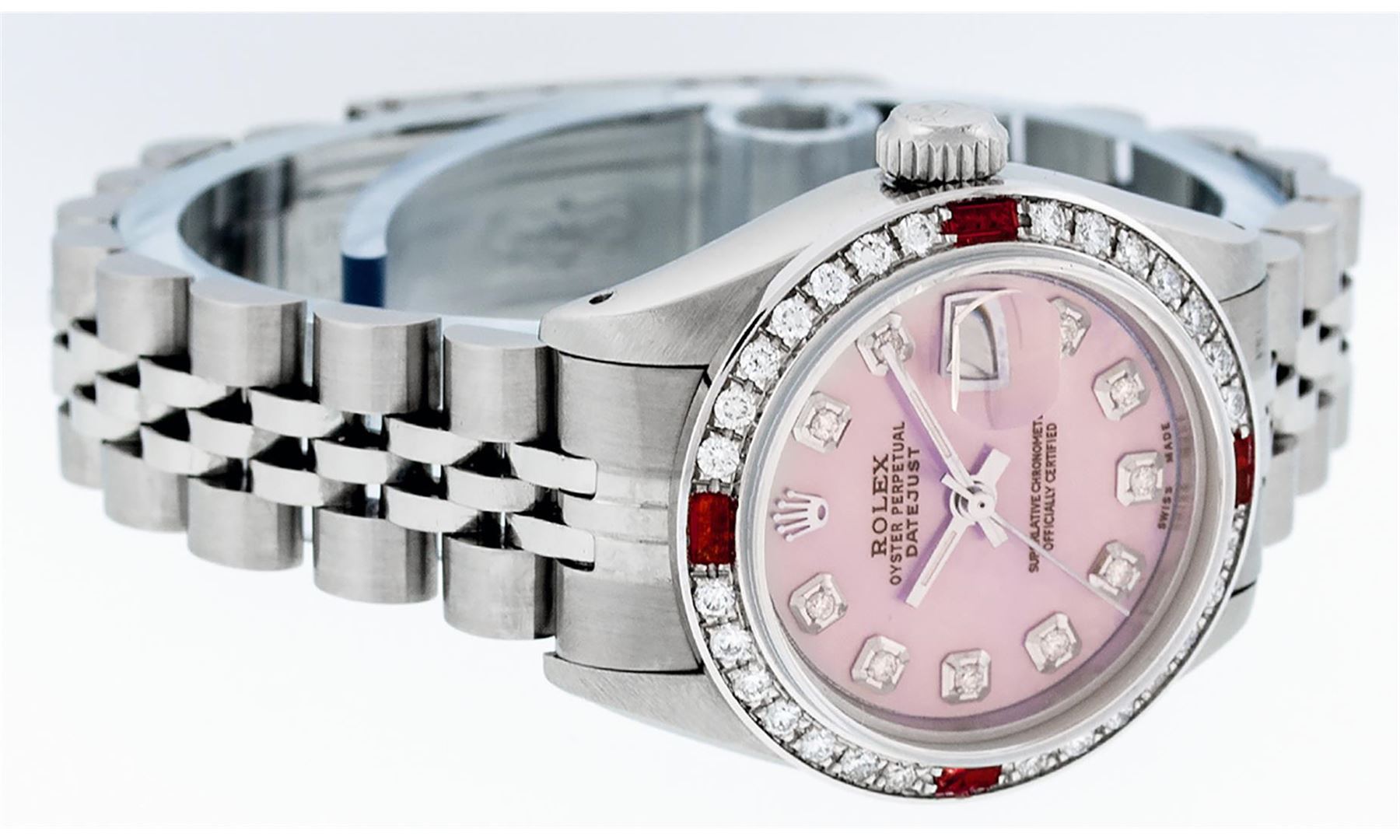 One Ladies Stainless Steel Rolex Datejust Polished Bright with Satin Finish, Serviced & Electronically Tested, Stainless Steel Case: 26mm, Stainless Steel Crown, Custom Bezel: New 18K White Gold Ruby Beadset Diamond Bezel, Diamond + Gem Count: 28 Diamonds + 4 Rubies. Total Weight .70 Carat, Clarity: SI-VS, Color: G to H. Custom Crystal: New Scratch Resistant Synthetic Sapphire Cyclops Lens. Custom Hands: New Luminescent Hands. Movement: Automatic Winding Movement. Custom Dial: Refinished Pink Mother Of Pearl With Diamond Hour Markers, 10 Diamonds in Dial G To H In Color, Clarity: SI-VS. Date Window: 3 O'Clock Position Date Display, Model: Datejust. Condition: G-6 Extra Fine. Bracelet: Stainless Steel Jubilee Band. Bright Polish & Satin Finish. 6.0 Inch Length, Adjustable. Standard Clasp, With Rolex Logo. This Watch Has Been Serviced Time Tested And Is In Excellent Condition It Is Free Of All Scratches And Dents.
