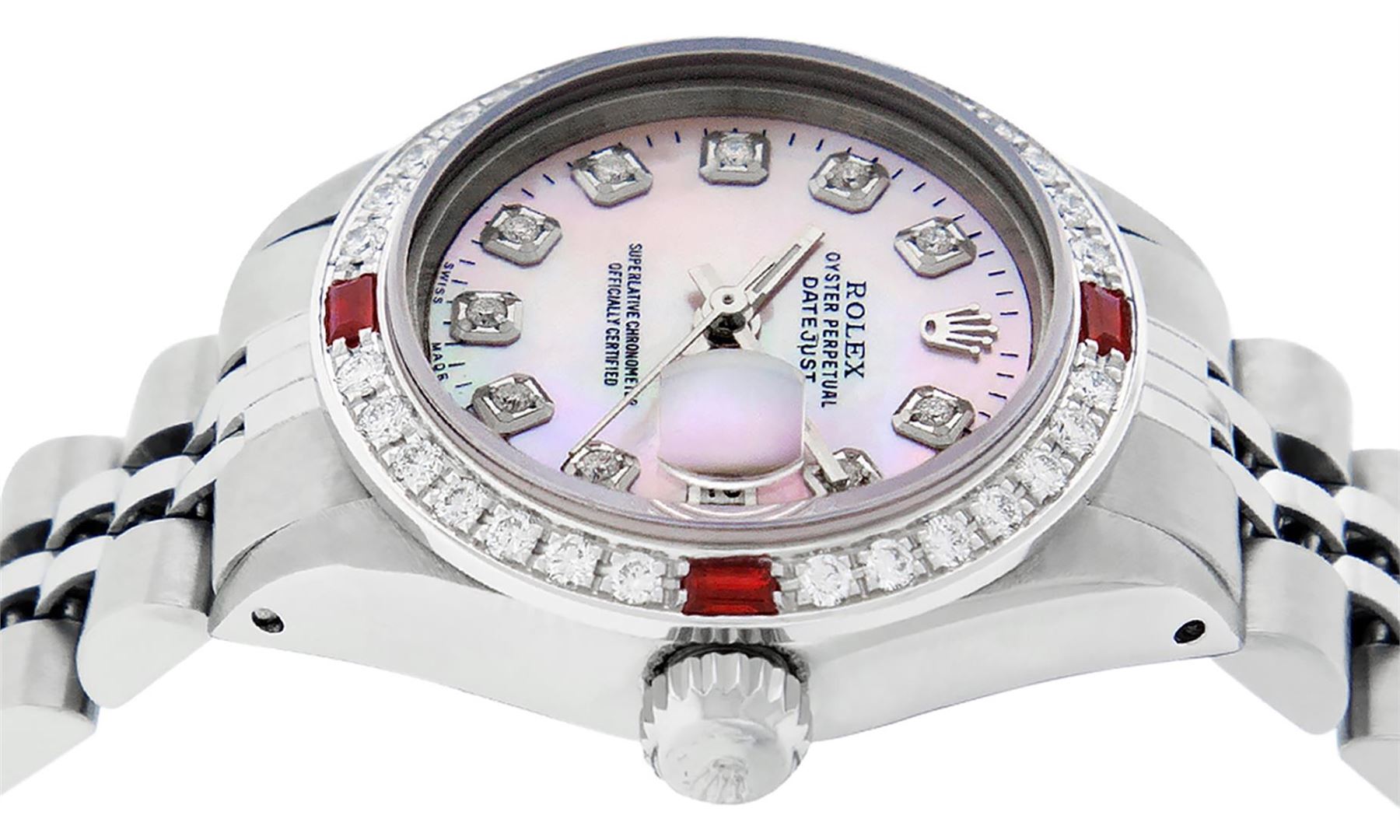 One Ladies Stainless Steel Rolex Datejust Polished Bright with Satin Finish, Serviced & Electronically Tested, Stainless Steel Case: 26mm, Stainless Steel Crown, Custom Bezel: New 18K White Gold Ruby Beadset Diamond Bezel, Diamond + Gem Count: 28 Diamonds + 4 Rubies Total Weight .70 Carat, Clarity: SI-VS, Color: G to H. Custom Crystal: New Synthetic Sapphire Cyclops Lens. Custom Hands: New Luminescent Hands. Movement: Automatic Winding Movement. Custom Dial: Refinished Pink Mother Of Pearl With Diamond Hour Markers, 10 Diamond in Dial G To H In Color, Clarity: SI-VS. Date Window: 3 O'Clock Position Date Display, Model: Datejust. Condition: G-6 Extra Fine. Bracelet: Stainless Steel Jubilee. Bright Polish & Satin Finish. 6.0 Inch Length, Adjustable. Standard Clasp, With Rolex Logo. This Watch Has Been Serviced Time Tested And Is In Excellent Condition It Is Free Of All Scratches And Dents.