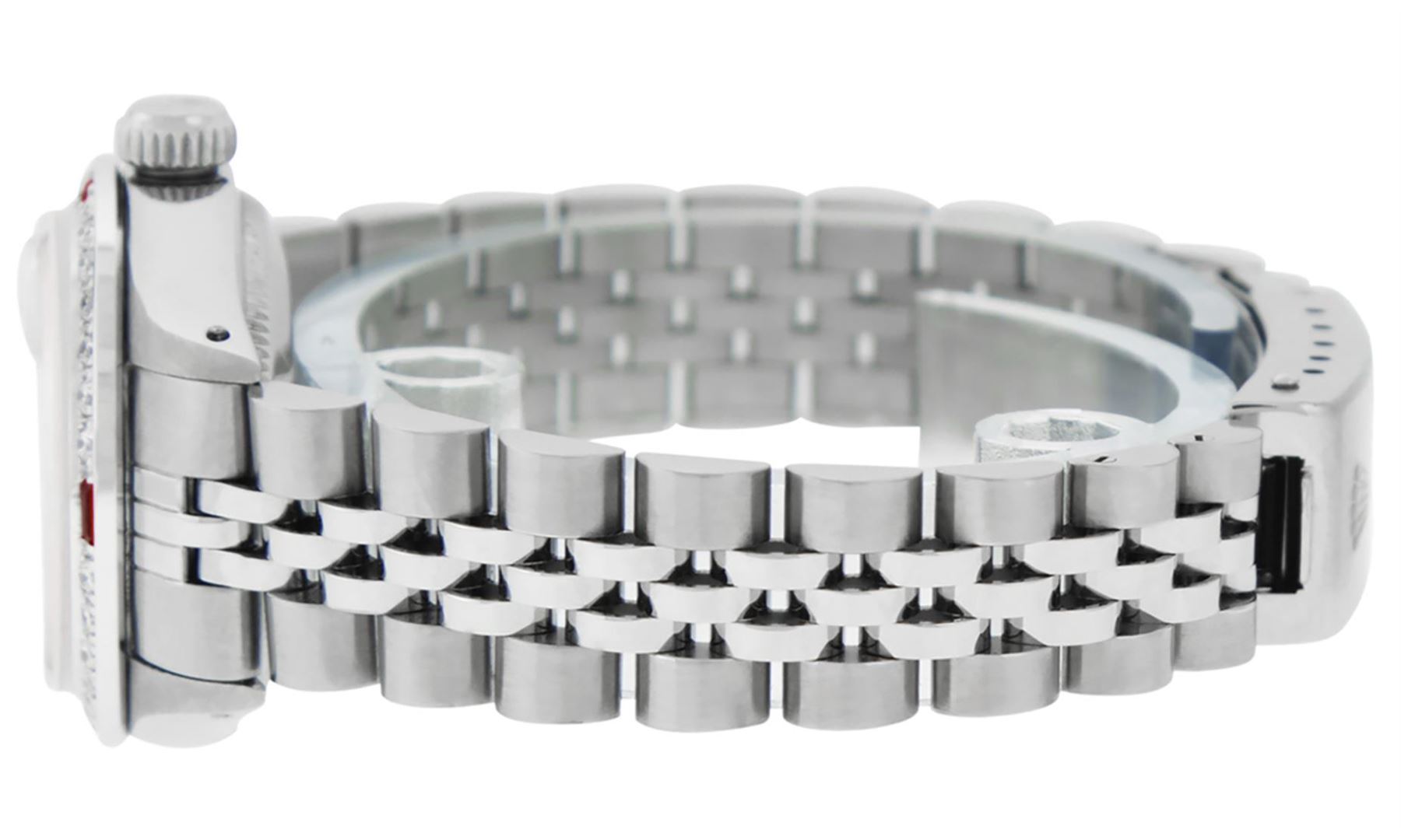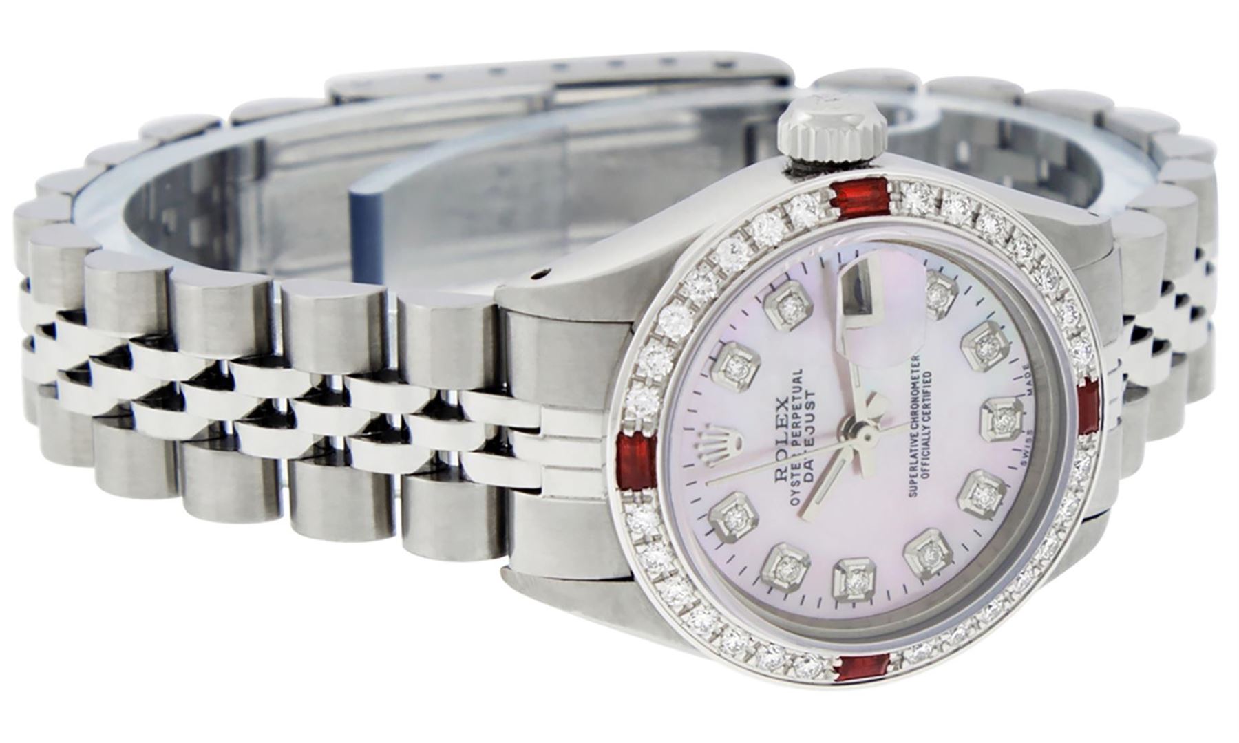 One Ladies Stainless Steel Rolex Datejust Polished Bright with Satin Finish, Serviced & Electronically Tested, Stainless Steel Case: 26mm, Stainless Steel Crown, Custom Bezel: New 18K White Gold Ruby Beadset Diamond Bezel, Diamond + Gem Count: 28 Diamonds + 4 Rubies Total Weight .70 Carat, Clarity: SI-VS, Color: G to H. Custom Crystal: New Synthetic Sapphire Cyclops Lens. Custom Hands: New Luminescent Hands. Movement: Automatic Winding Movement. Custom Dial: Refinished Pink Mother Of Pearl With Diamond Hour Markers, 10 Diamond in Dial G To H In Color, Clarity: SI-VS. Date Window: 3 O'Clock Position Date Display, Model: Datejust. Condition: G-6 Extra Fine. Bracelet: Stainless Steel Jubilee. Bright Polish & Satin Finish. 6.0 Inch Length, Adjustable. Standard Clasp, With Rolex Logo. This Watch Has Been Serviced Time Tested And Is In Excellent Condition It Is Free Of All Scratches And Dents.